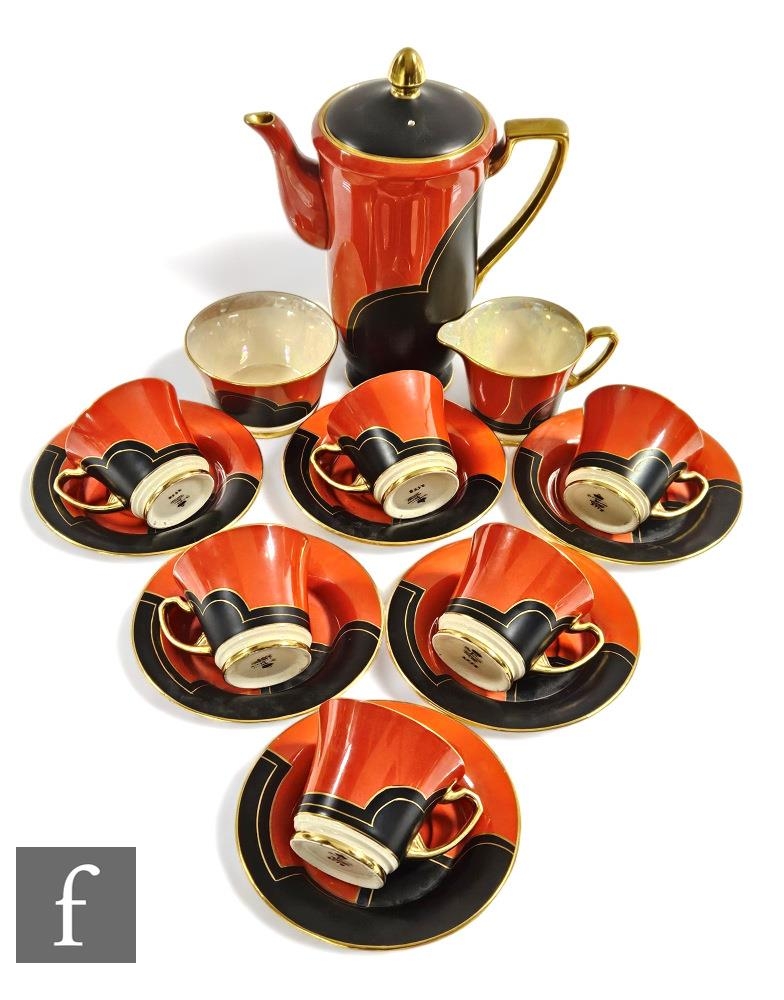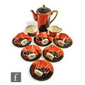 Crown Devon Fieldings - A 1930s part coffee set, comprising coffee pot, six cans and saucers, milk and sugar, decorated in the black and red colourway with gilt banding, pattern no. 2558, printed and painted marks.