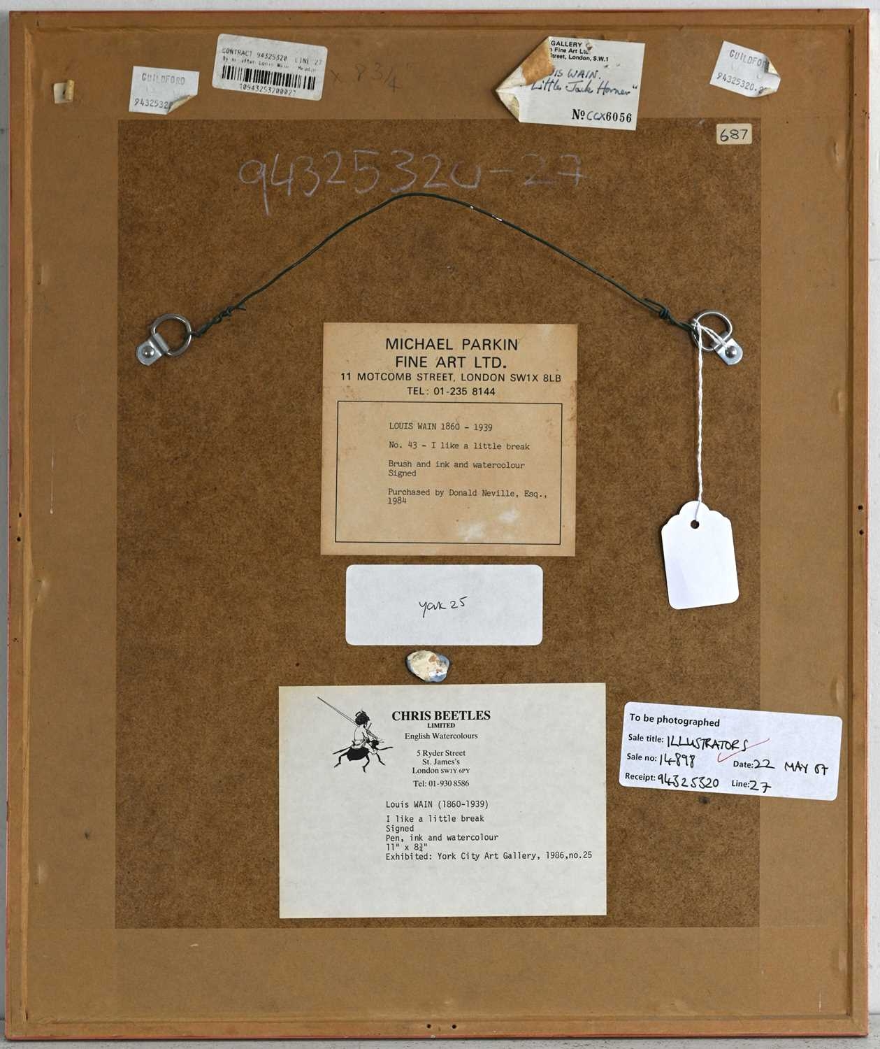 Louis William Wain (British, 1860-1939), I Like a Little Break, signed l.l., titled verso, pen, ink and watercolour, 27.5 by 21.5cm, framed. Provenance: with Michael Parkin Fine Art, London, and Chris Beetles, London. Exhibited: York City Art Gallery, 1986, No.25
