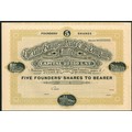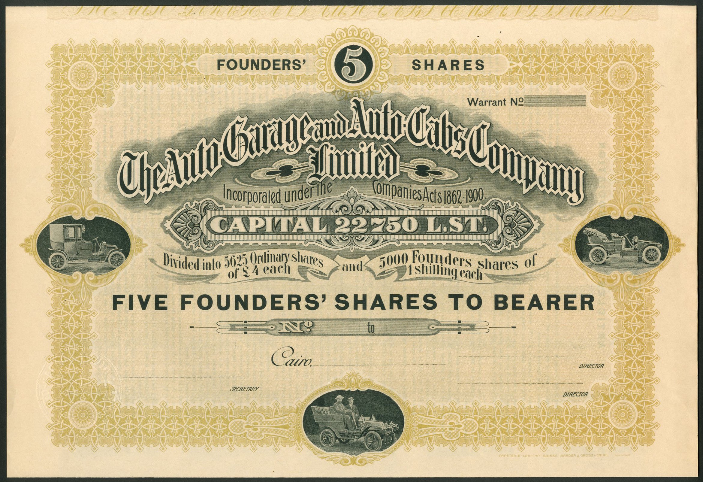 Egypt: Auto-Garage and Auto-Cabs Company Limited, 5 founders shares, c.1906, a probable specimen with printers handstamp on the counterfoil, attractive piece with vignettes of motor cars and taxicab, yellow-green, with coupons and counterfoil. EF.