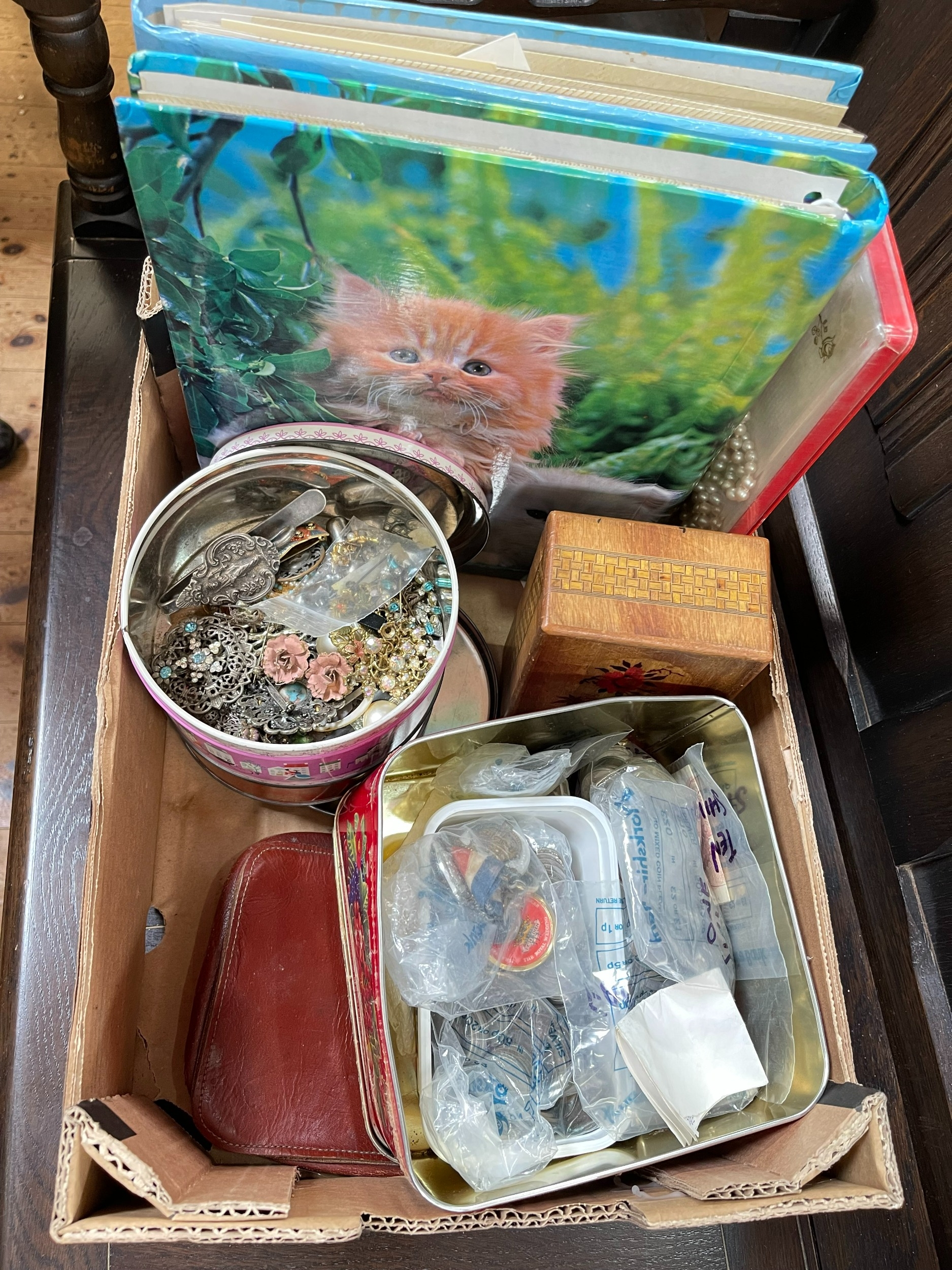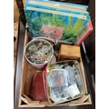 Collection of pre 1947 coinage inc 1890 / 1895 / 1897 / 1935 crowns, 1819 George III half crown, 5 Francs 1844, various UK silver coins etc, together with costume jewellery and stamp albums.