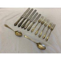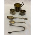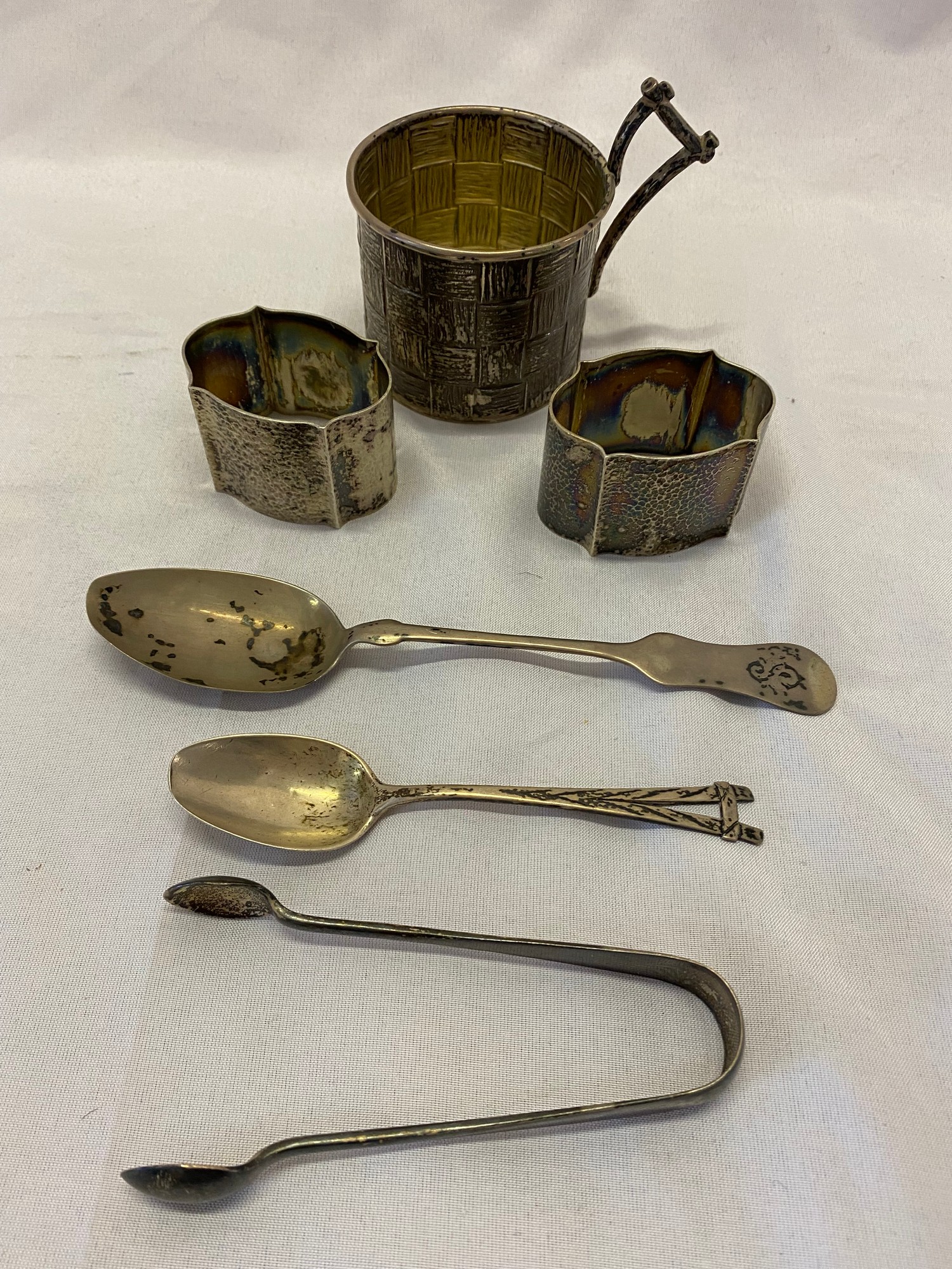 A Continental silver coloured metal cup with basket weave decoration , a matching spoon, two Continental silver napkin rings, a pair of silver sugar tongs and a spoon