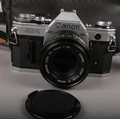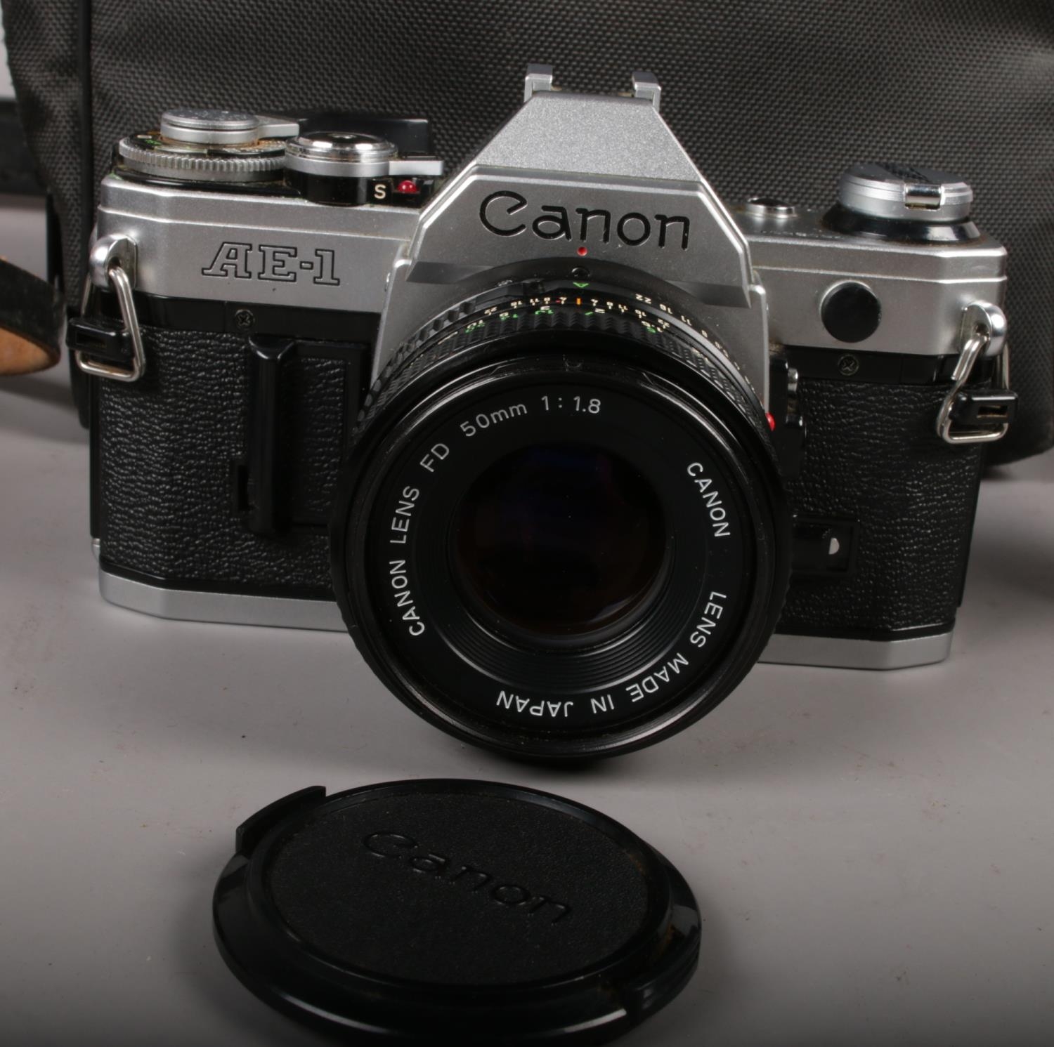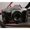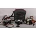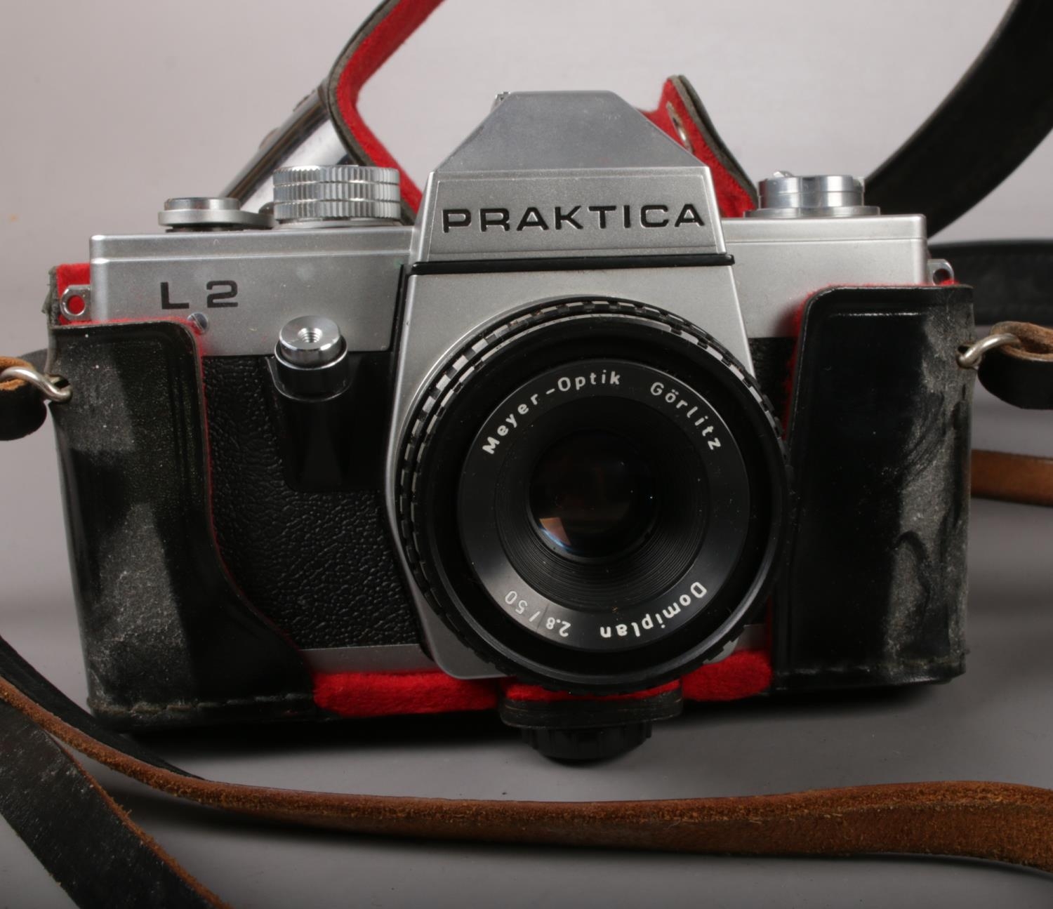 A Canon AE-1 slr camera with Canon 50mm lens, a Praktica L2 slr camera and Gorlitz lens and a Brownie camera.