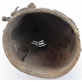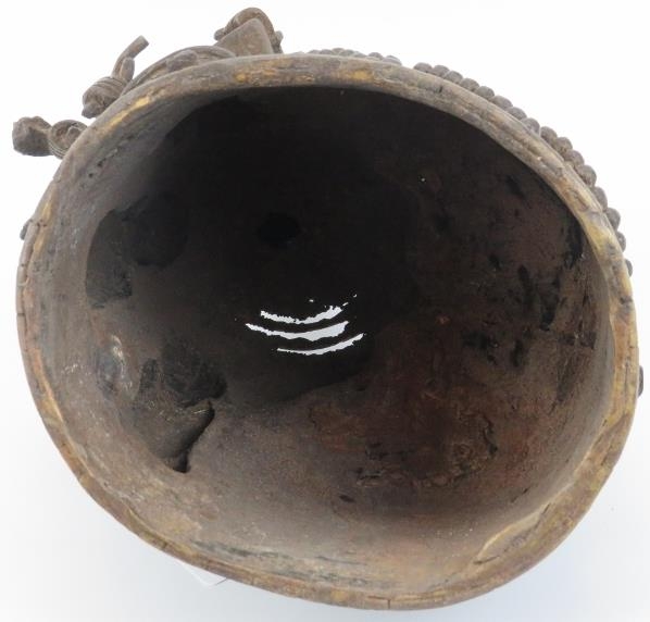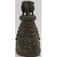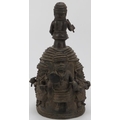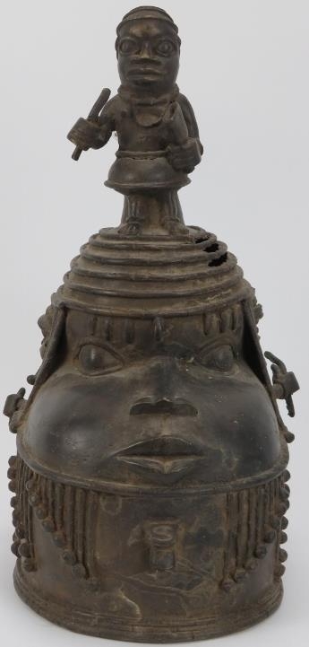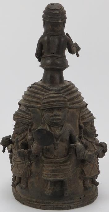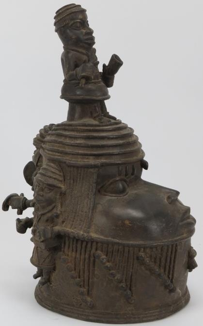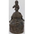 Tribal Art: An African bronze head, Benin / Nigeria. Surmounted with a seated figure and three figures to the reverse. 40 cm height, 22 cm width.