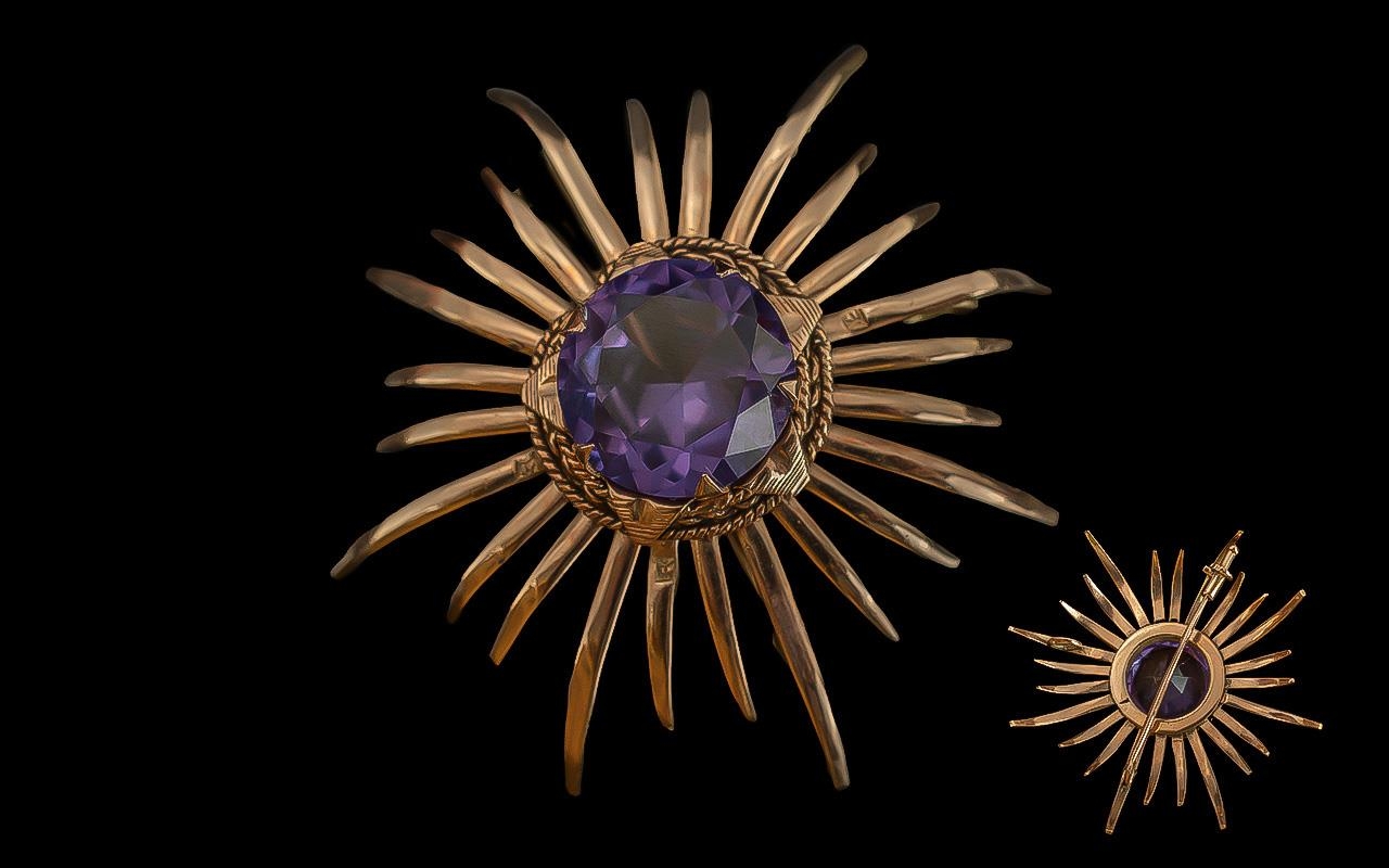 Antique Period Ladies 14ct Gold Star burst ' Spider ' Amethyst Set Brooch, Marked 14ct. The Large Faceted Amethyst of Excellent Colour, Est Weight 8.00 cts, Size 1,5 x 1.5 Inches - 3.75 x 3.75 cms. Weight 9 grams.
