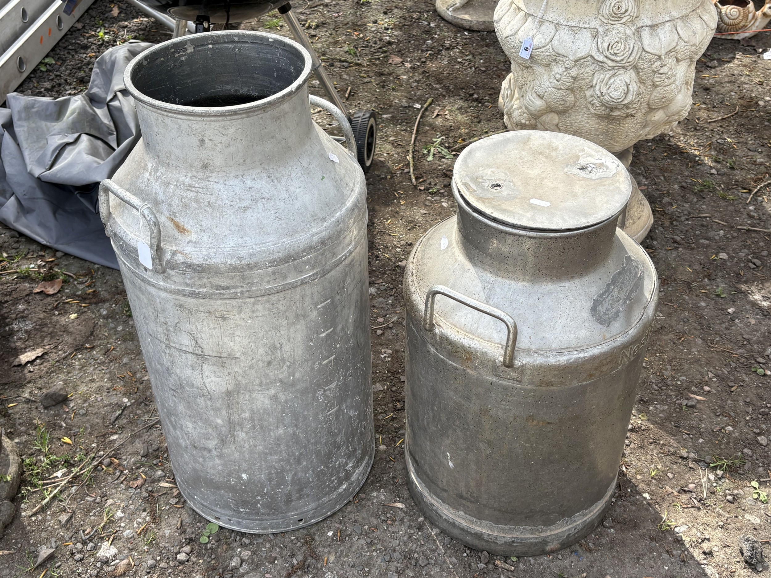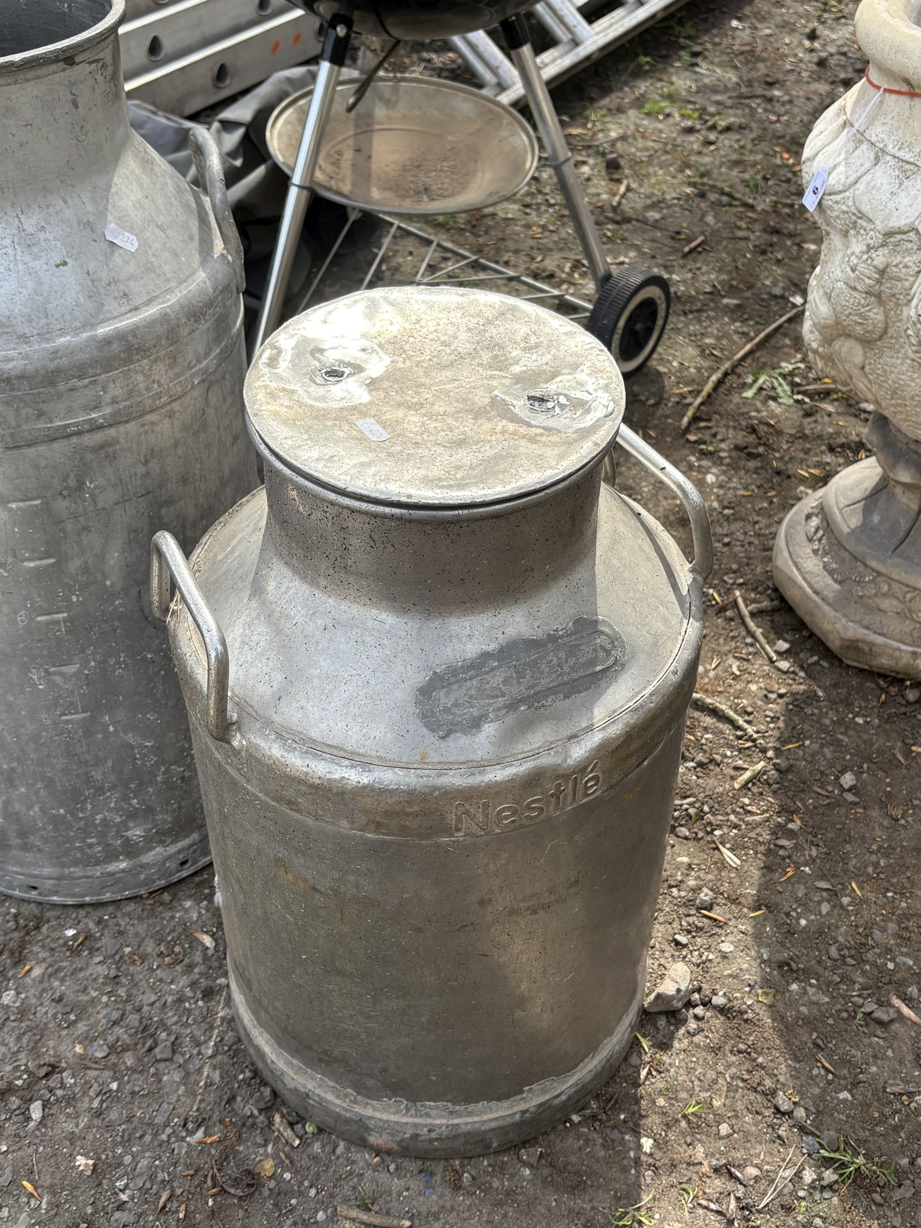 TWO GALVANISED MILK CHURNS, on stamped Nestle, condition report: handle missing on one milk churn, and one missing (2)