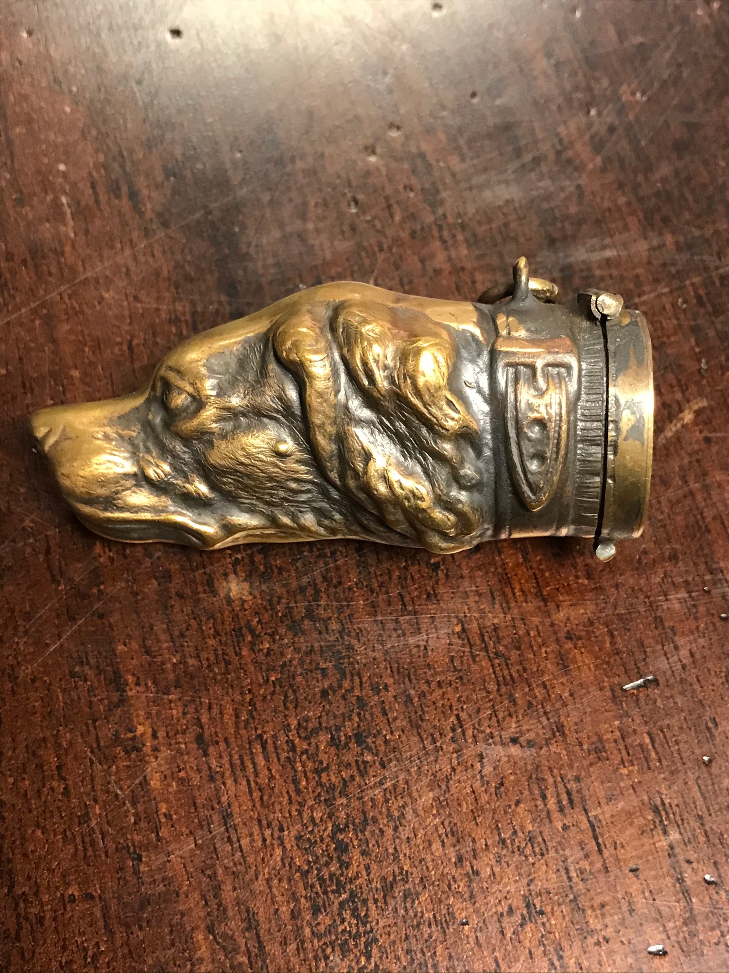 A modern brass dog's head vesta case -