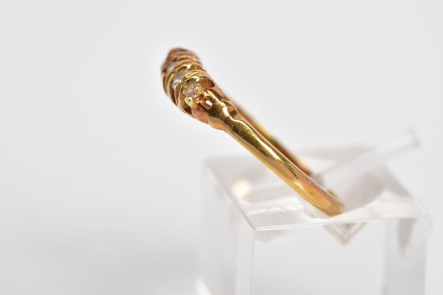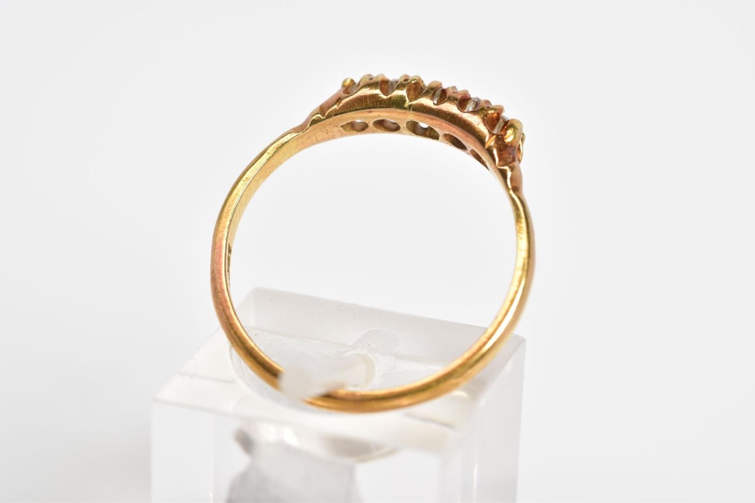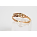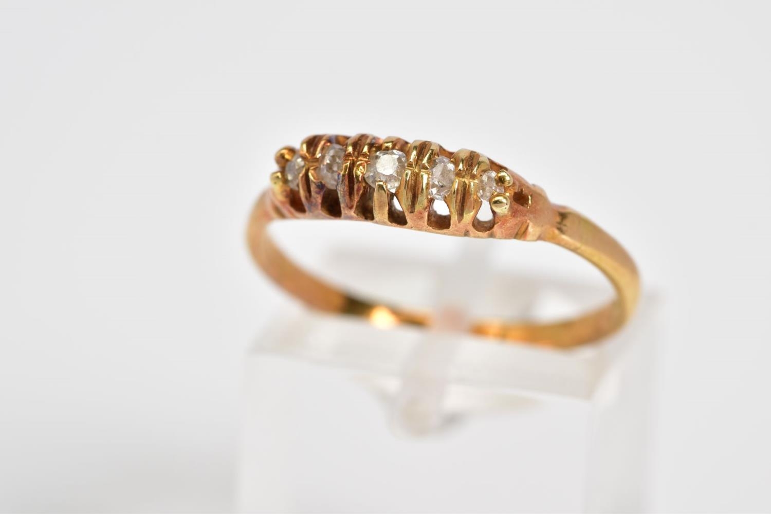 A FIVE STONE DIAMOND RING, designed with a row of five graduated claw set old cut diamonds, to the plain polished band, stamped 18ct, total estimated diamond weight 0.15ct, ring size P 1/2, approximate weight 2.8 grams