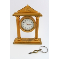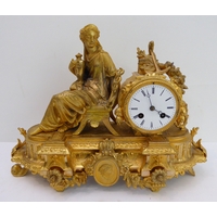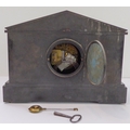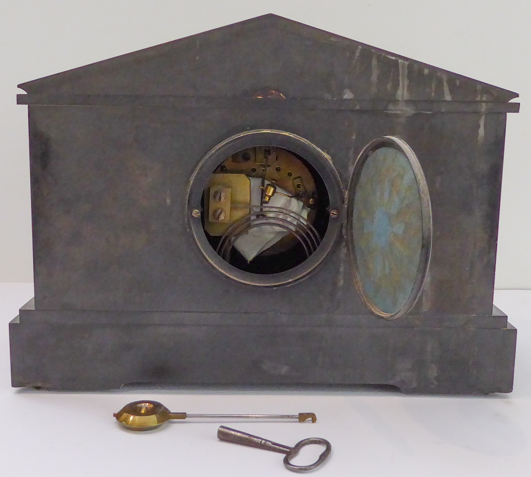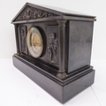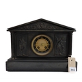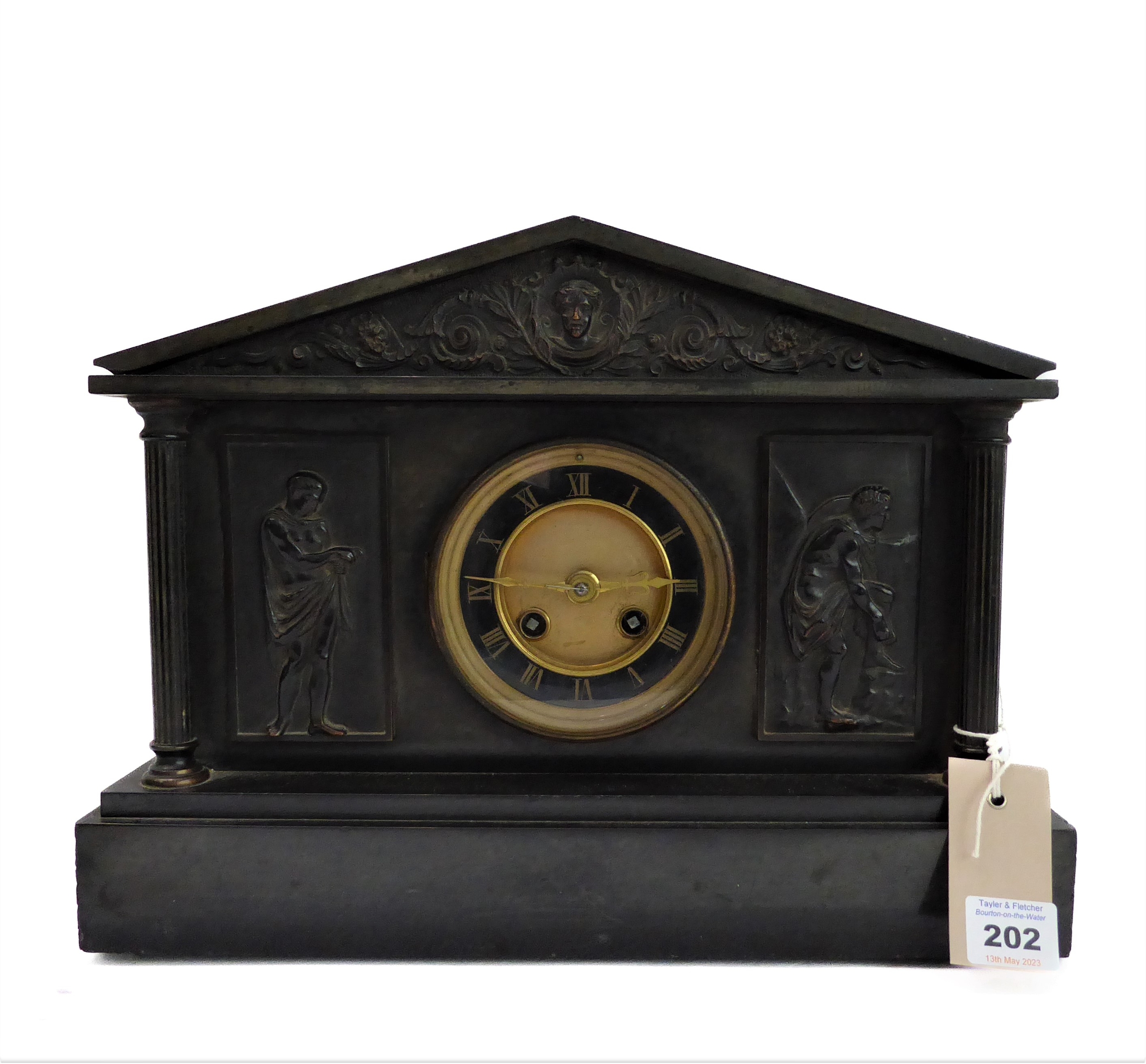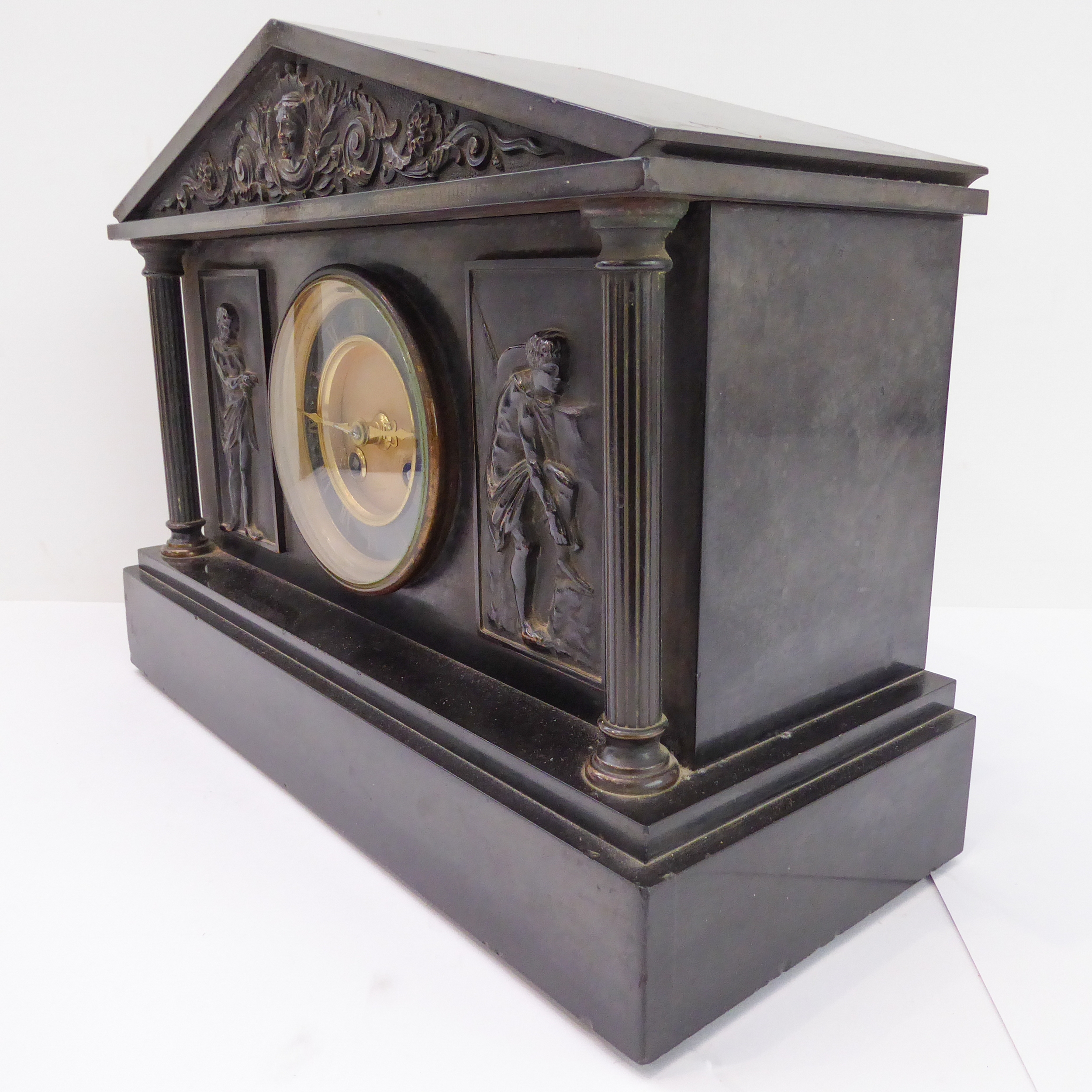 A late 19th century black slate eight-day mantle clock of architectural design: the chapter ring with gilded Roman numerals and flanked by Roman-style figures and classical columns, the movement striking on a gong (34.5 cm wide x 26 cm highest)