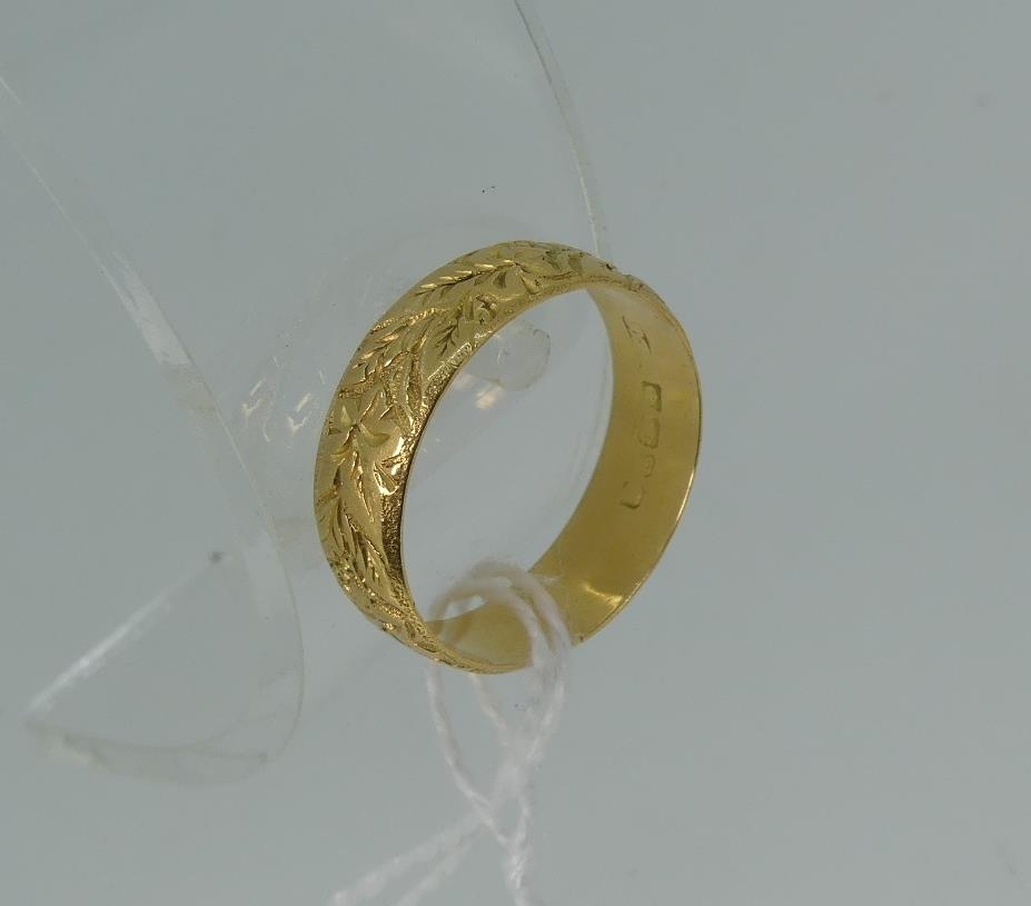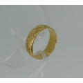 An 18ct yellow gold Band, with foliate engraved decoration, Size S, approx weight 5g.