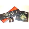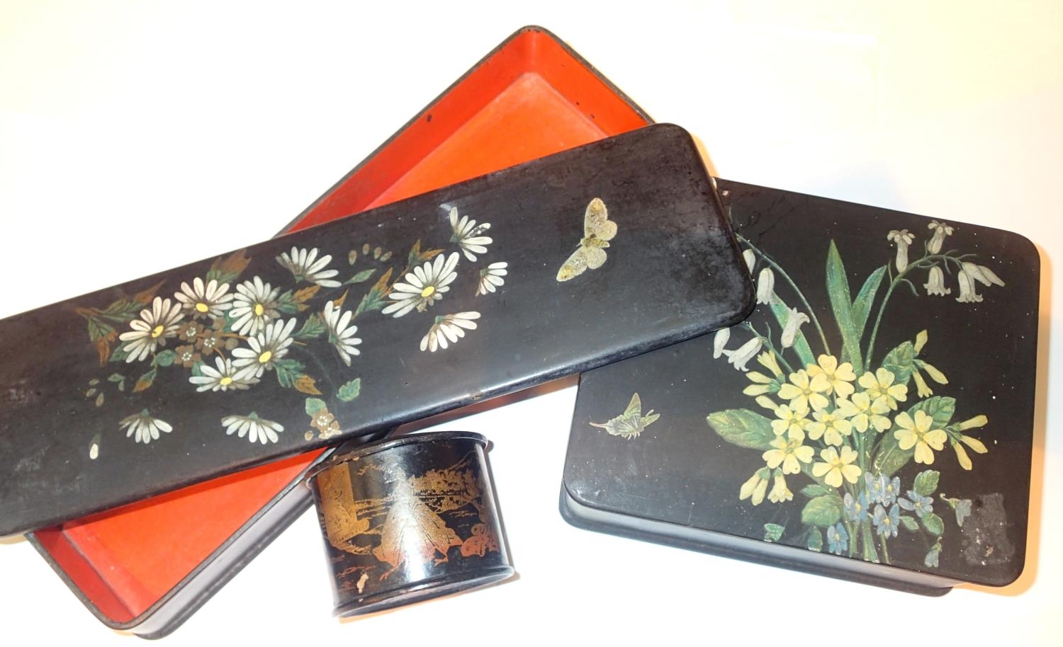 Three paper mache boxes including a glove box and an oriental circular box. P&P Group 1 (£14+VAT for the first lot and £1+VAT for subsequent lots)