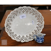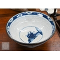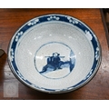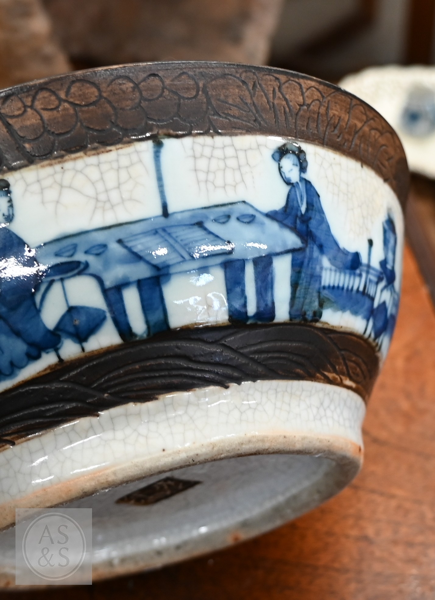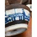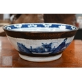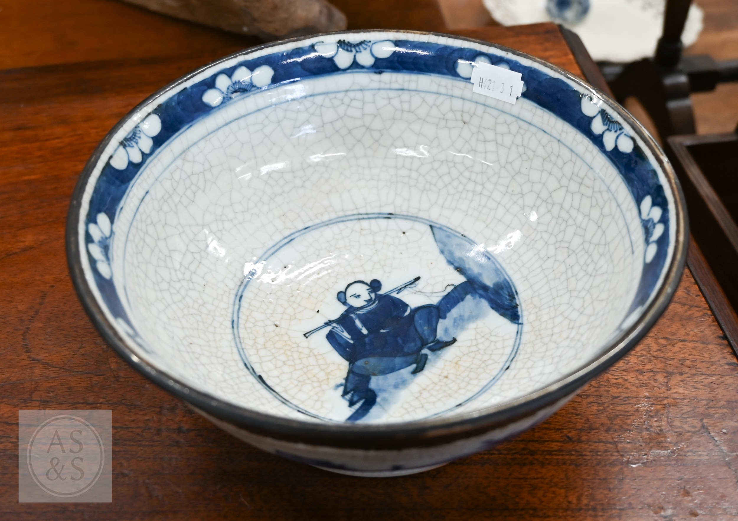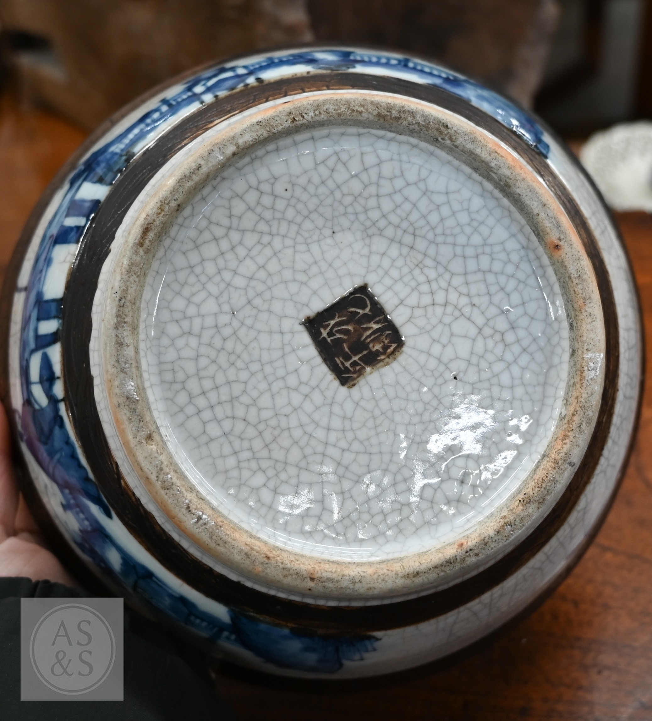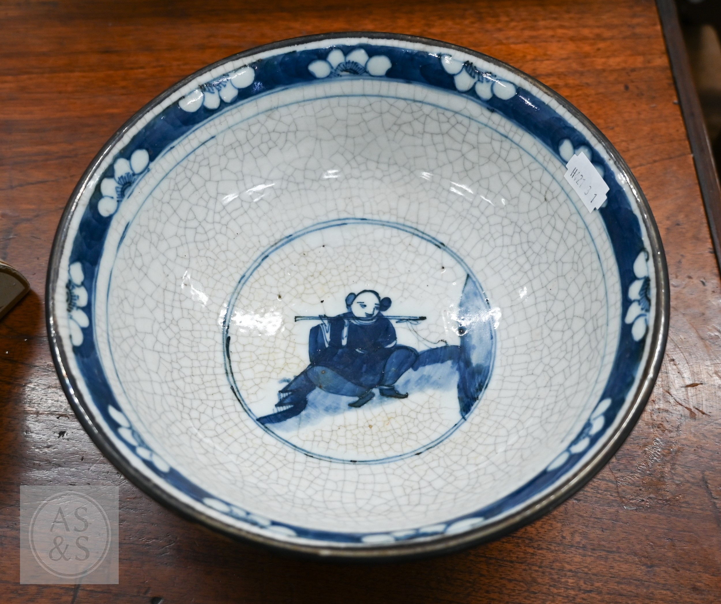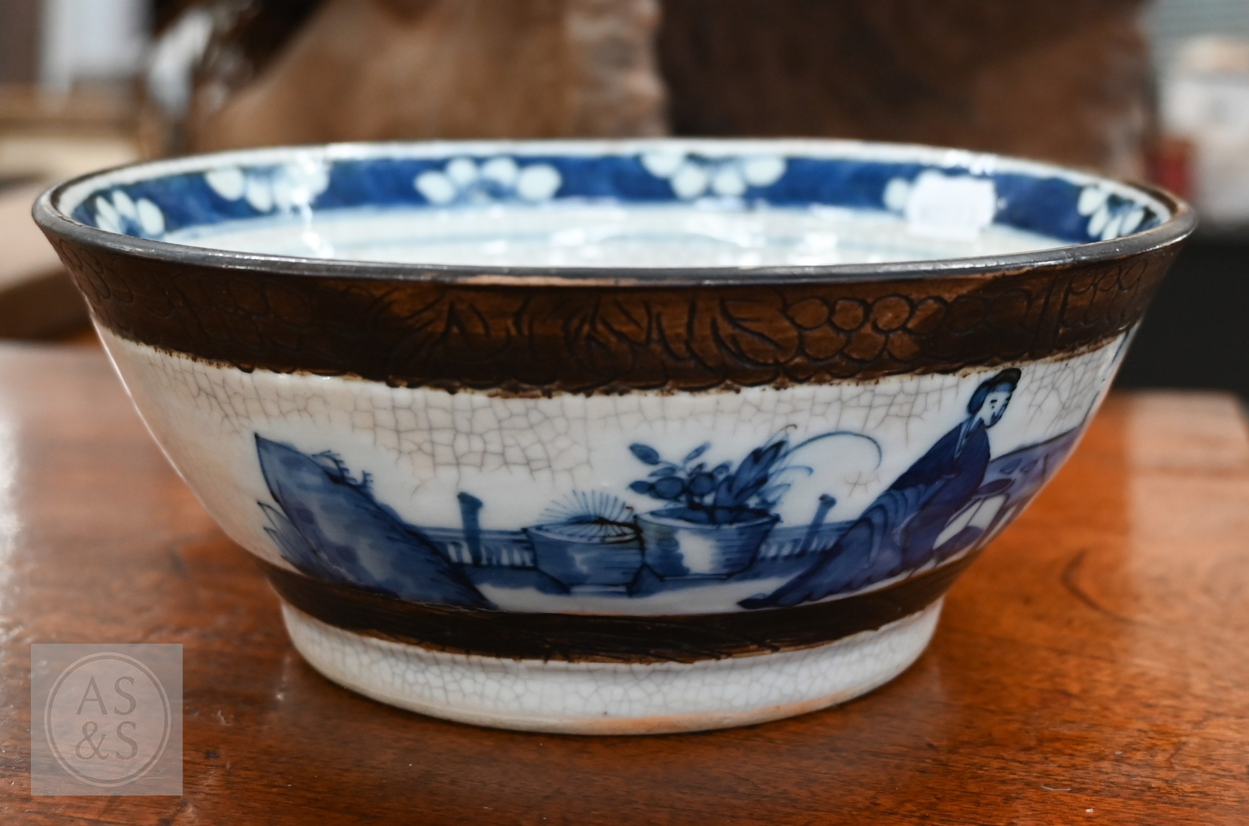 A Chinese crackle-glazed bowl, painted with blue and white figures within burnt biscuit bands, 23 cm diameter