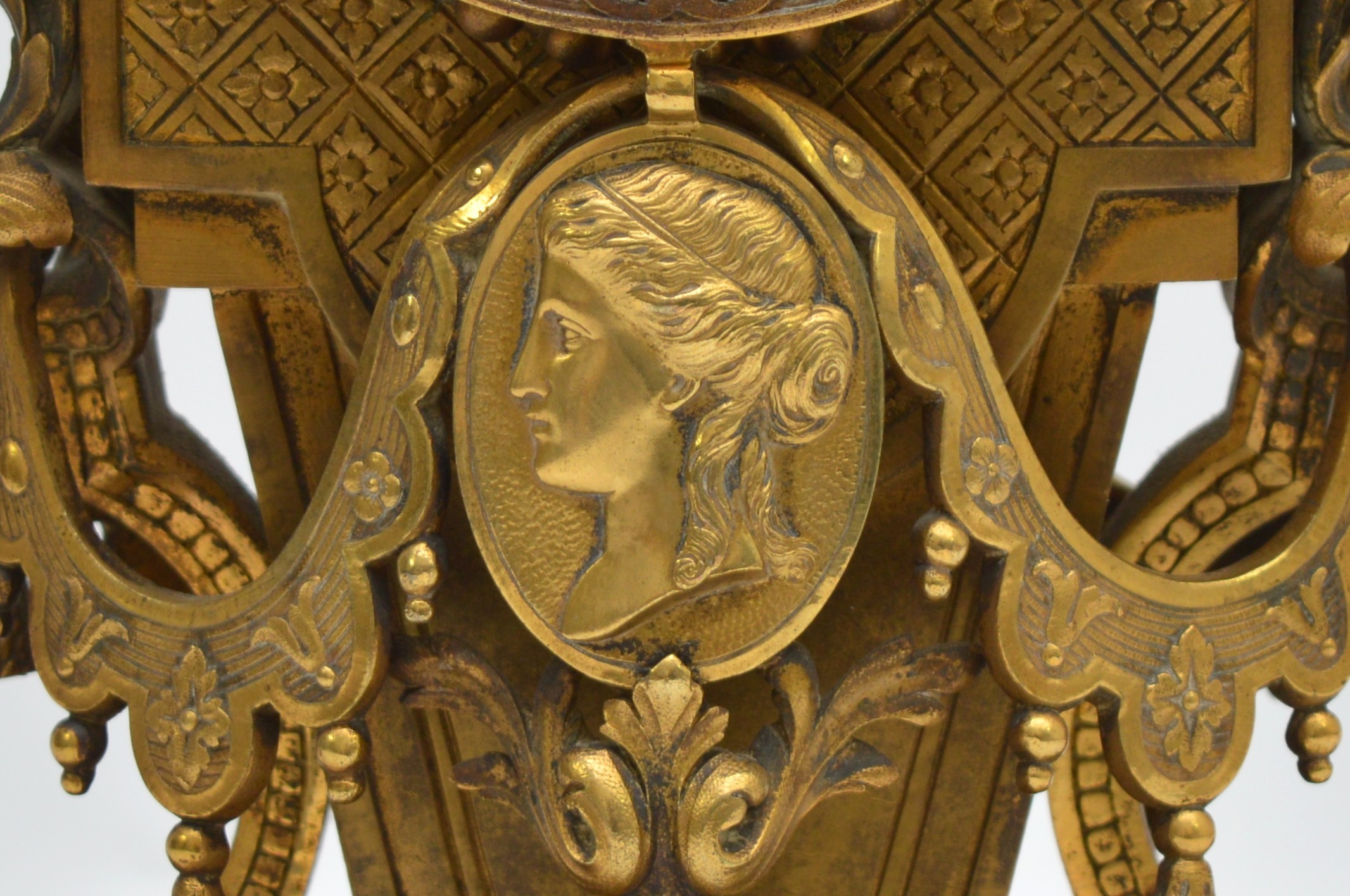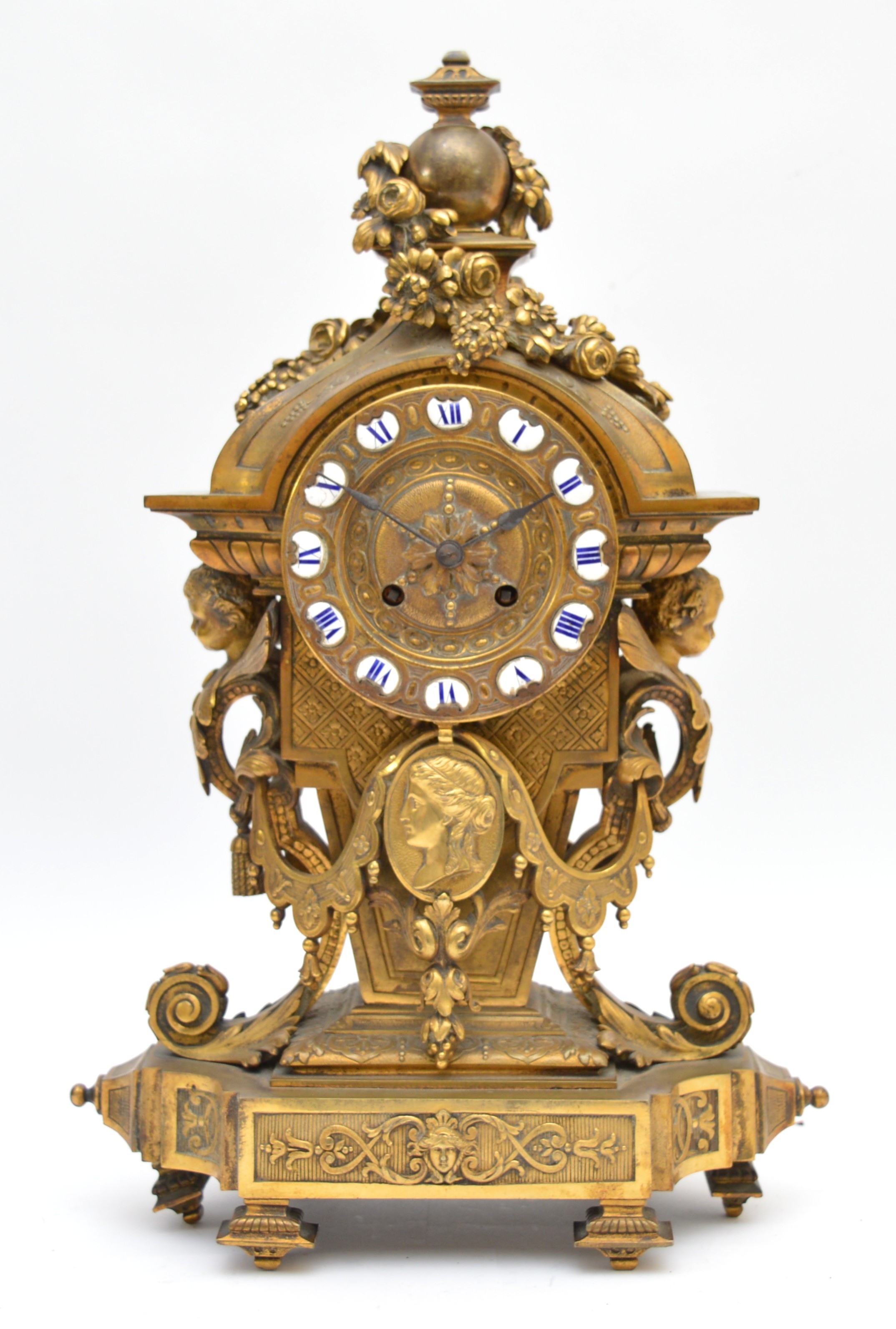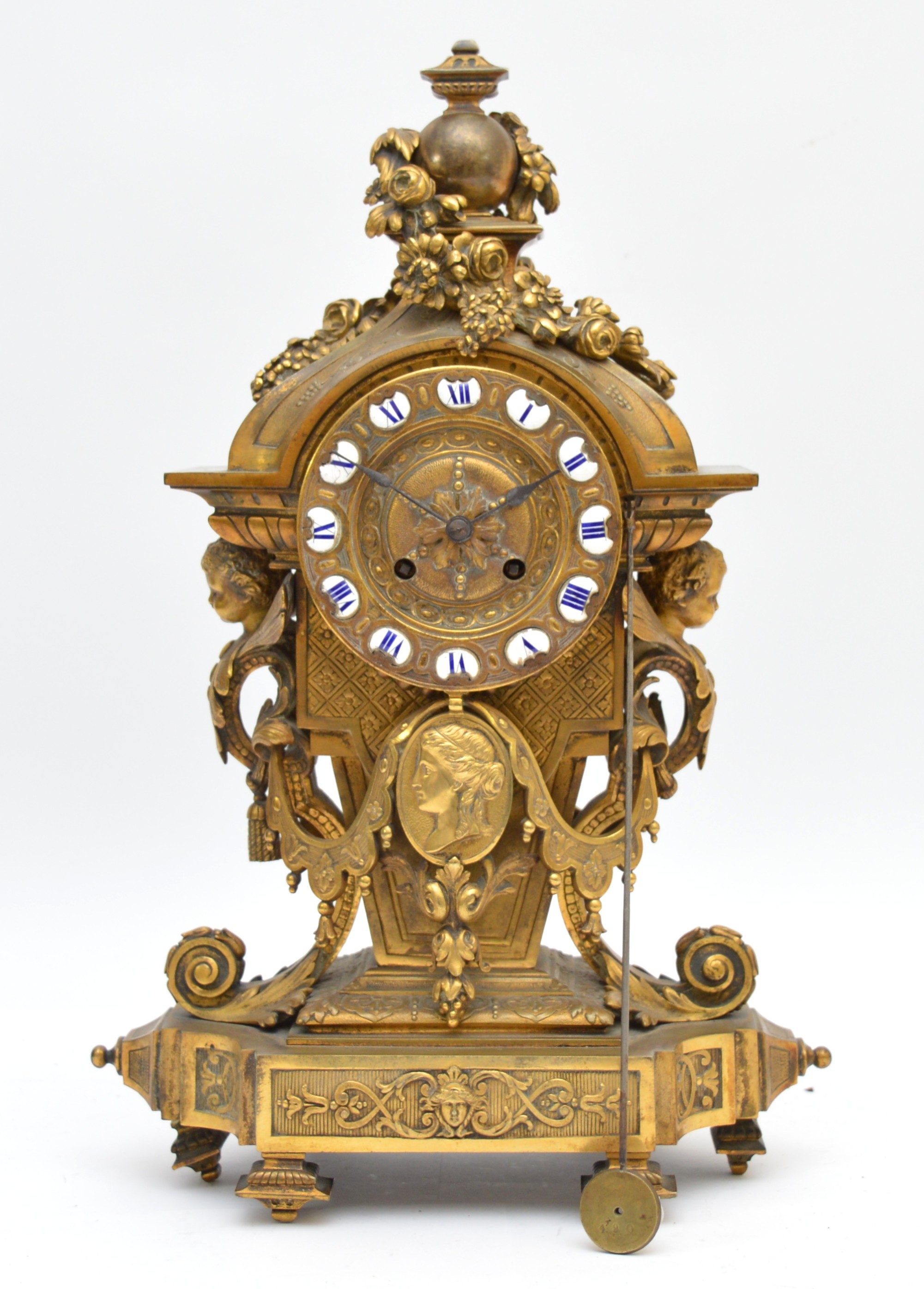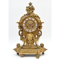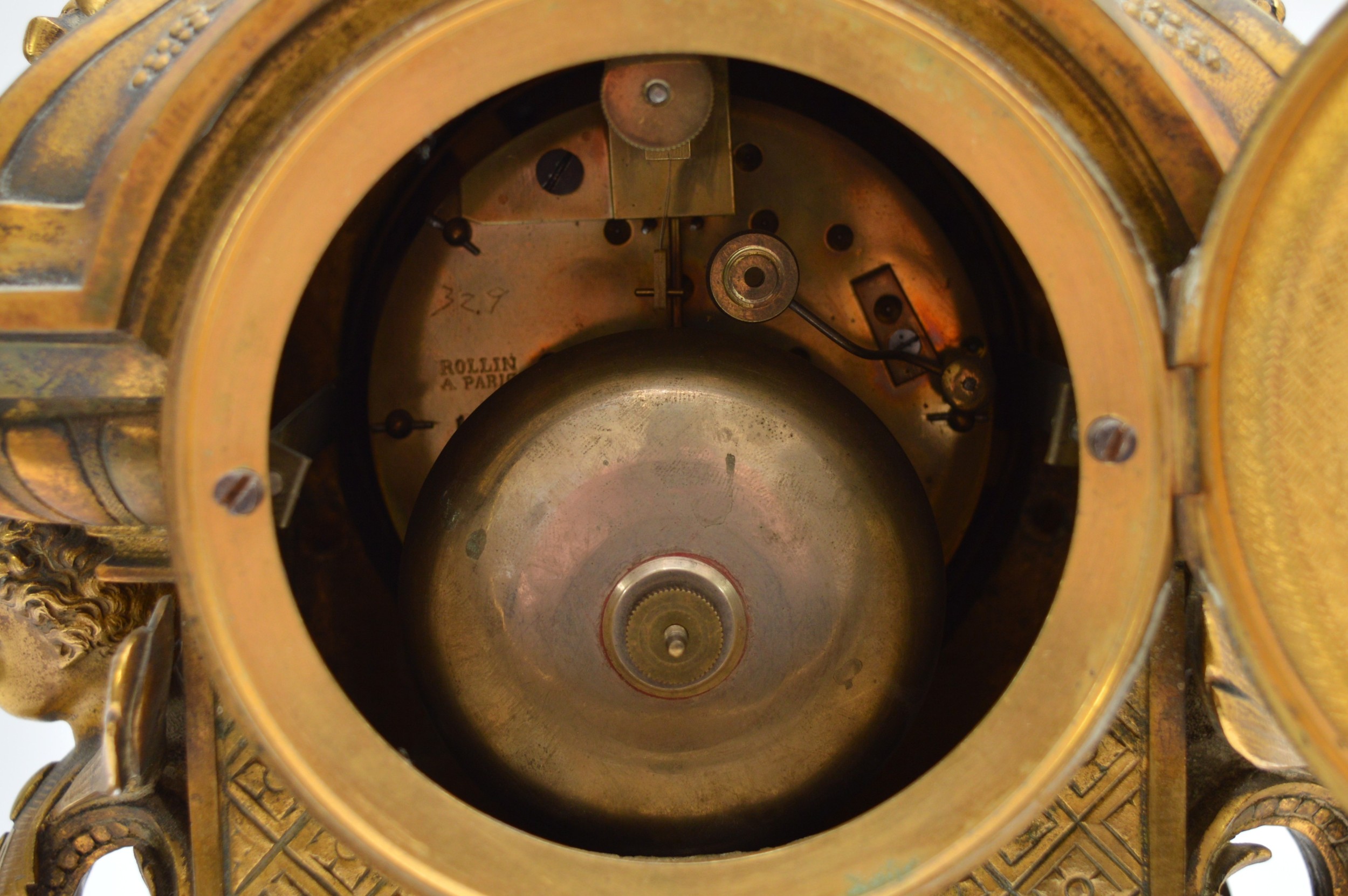 Rollin a Paris, a good quality mid 19th century gilt brass mantel clock, the chapter ring with applied enamel numerals, the architectural case numbered 48, with female masks, swags and trailing floral mounts, the Japy Feres, 1855, medal movement numbered 1253 and 87, striking the hours and half on a bell, pendulum numbered 490, 42cm.