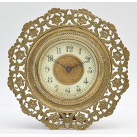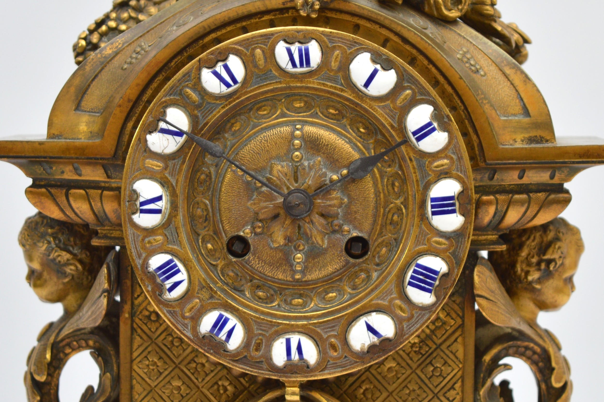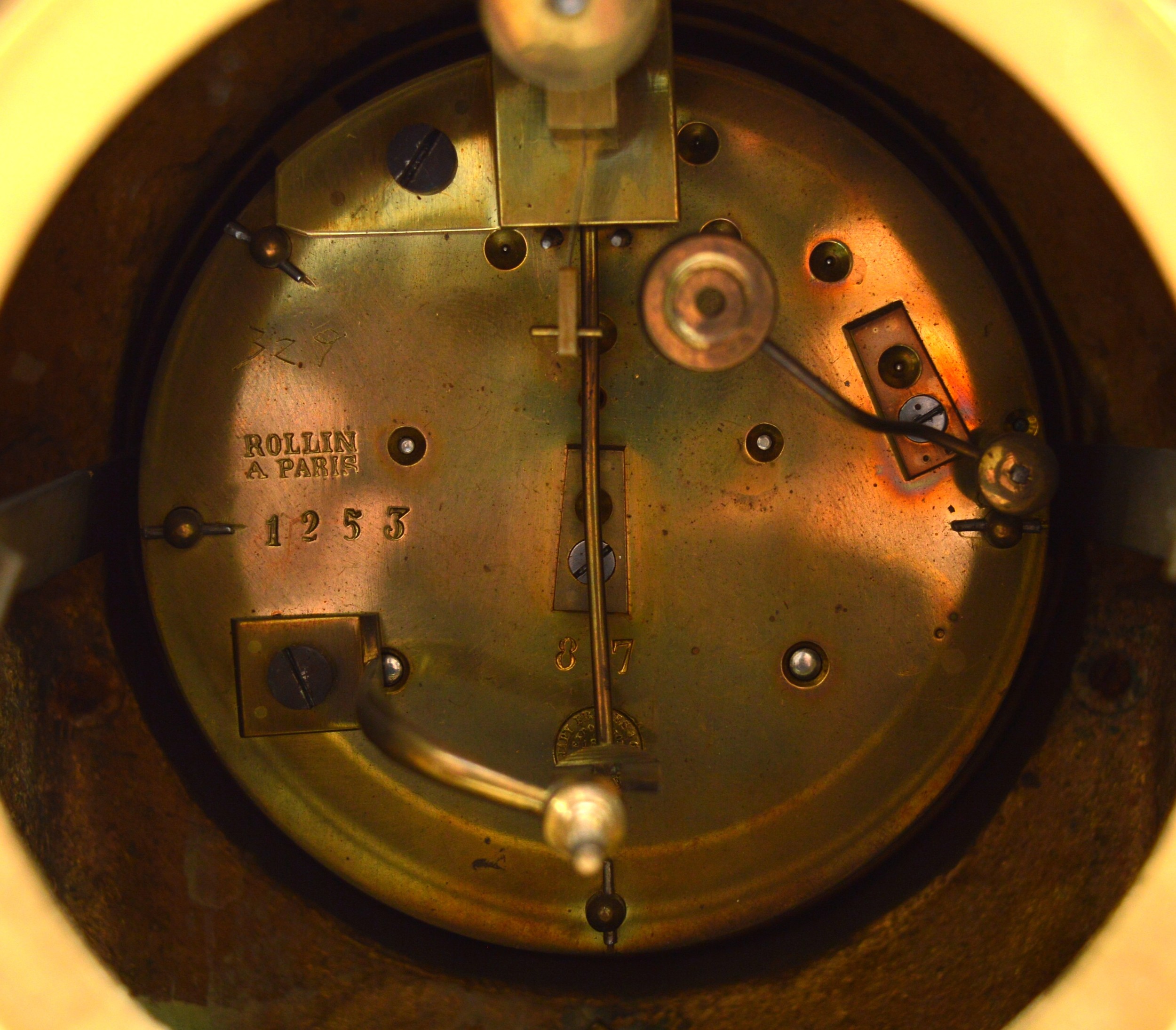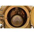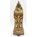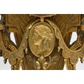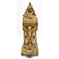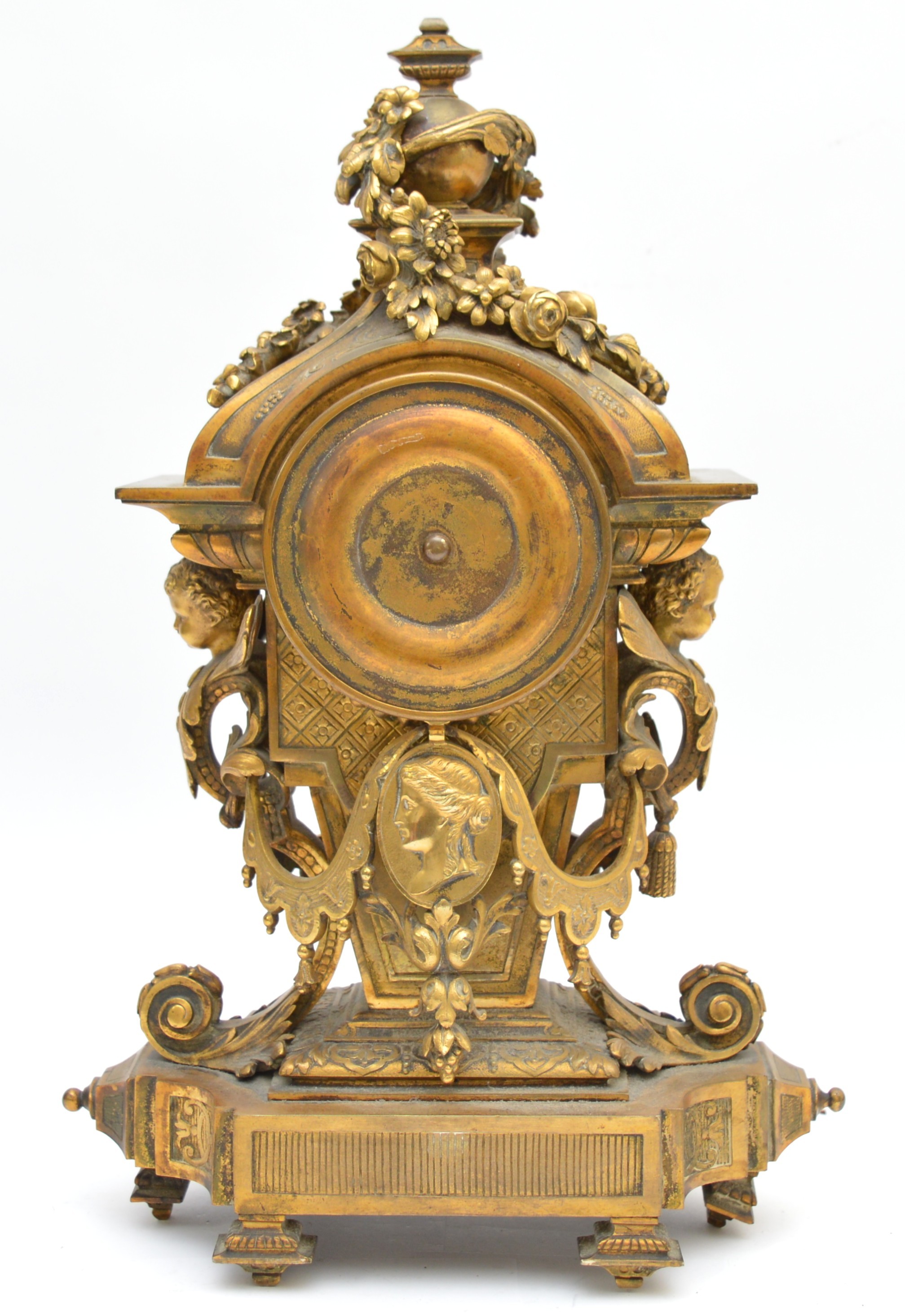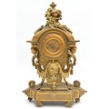 Rollin a Paris, a good quality mid 19th century gilt brass mantel clock, the chapter ring with applied enamel numerals, the architectural case numbered 48, with female masks, swags and trailing floral mounts, the Japy Feres, 1855, medal movement numbered 1253 and 87, striking the hours and half on a bell, pendulum numbered 490, 42cm.