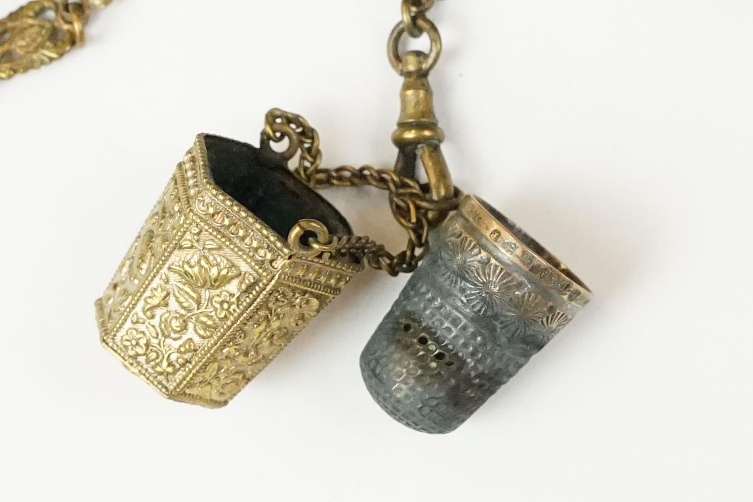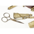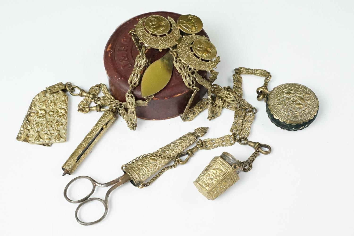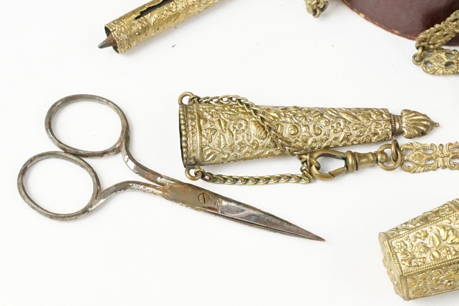 An antique brass Chatelaine complete with pencil, pin cushion, scissors and thimble.
