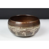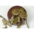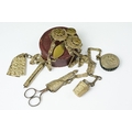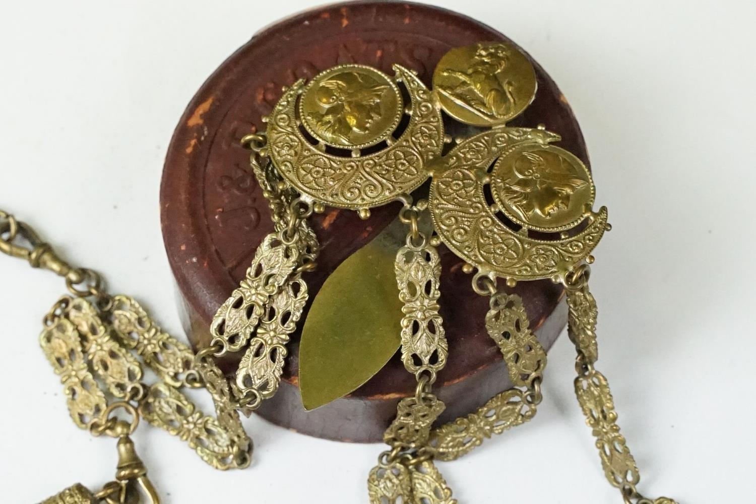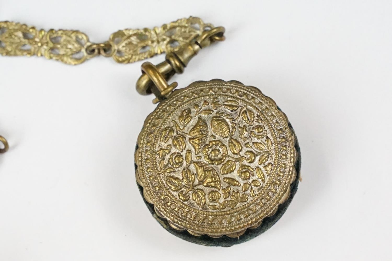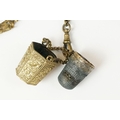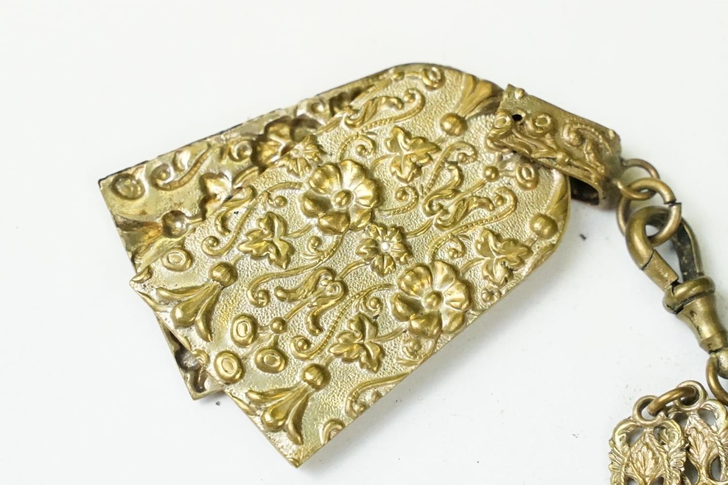 An antique brass Chatelaine complete with pencil, pin cushion, scissors and thimble.
