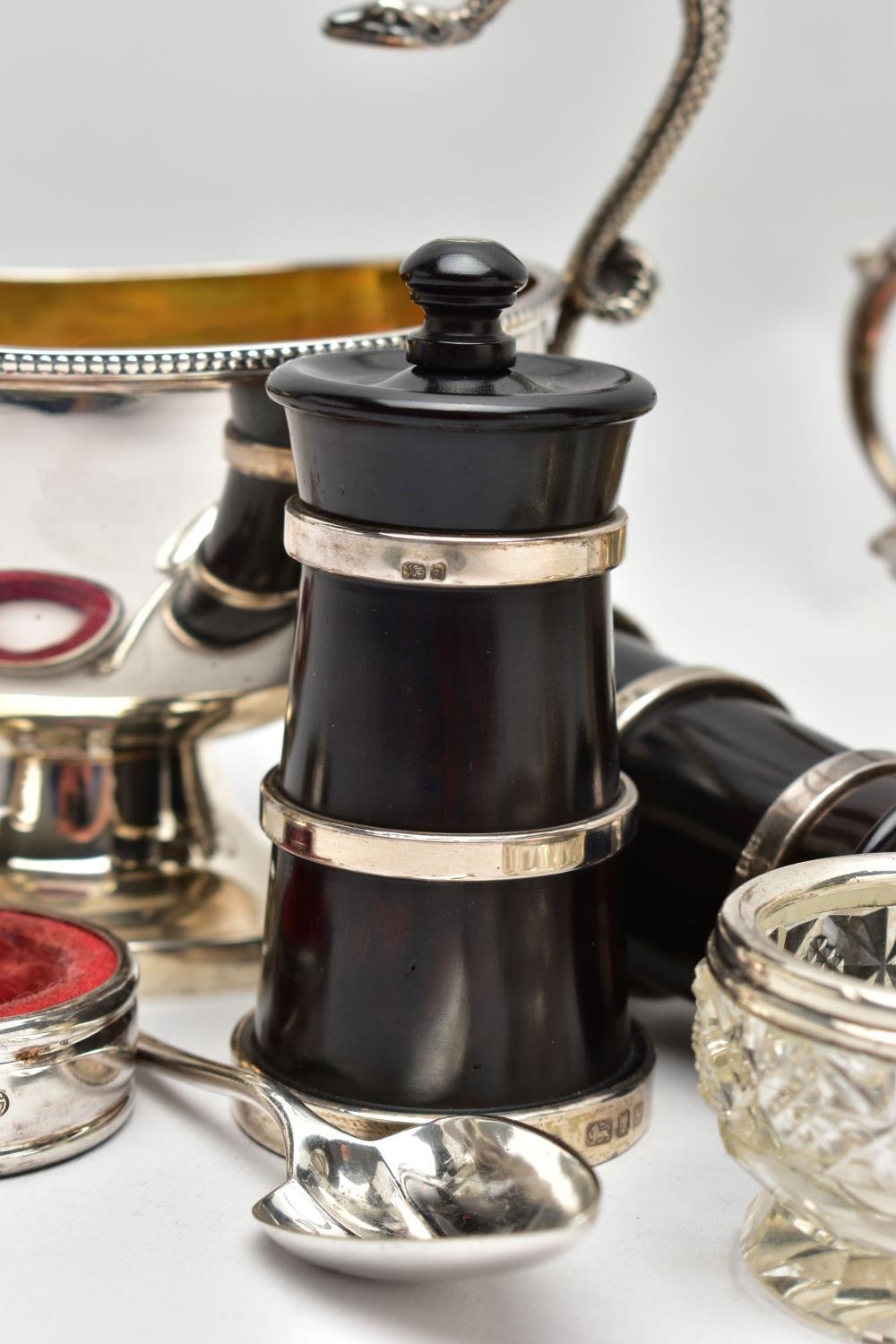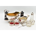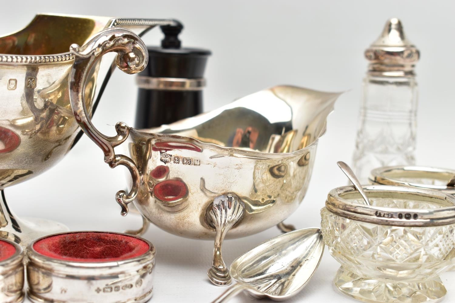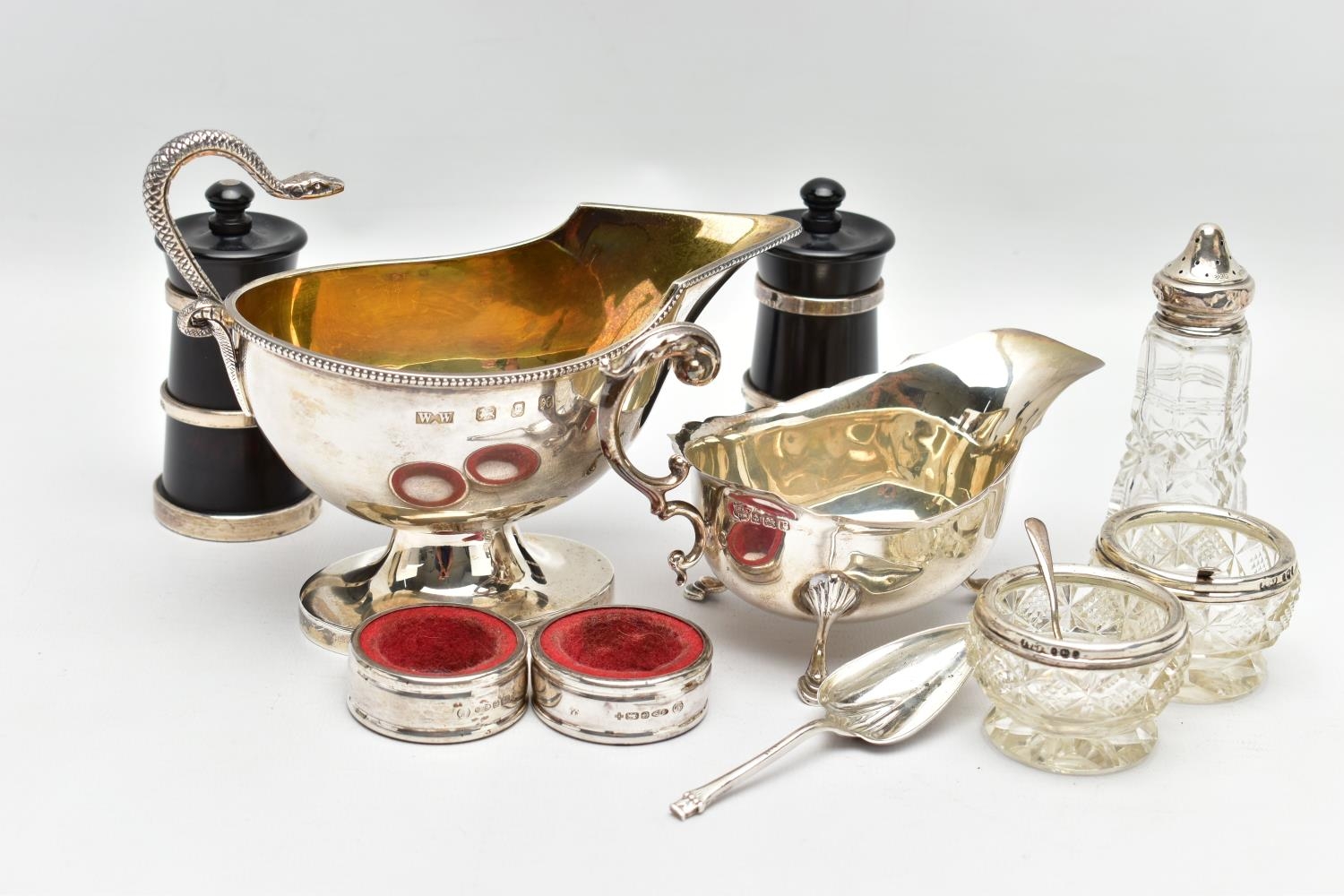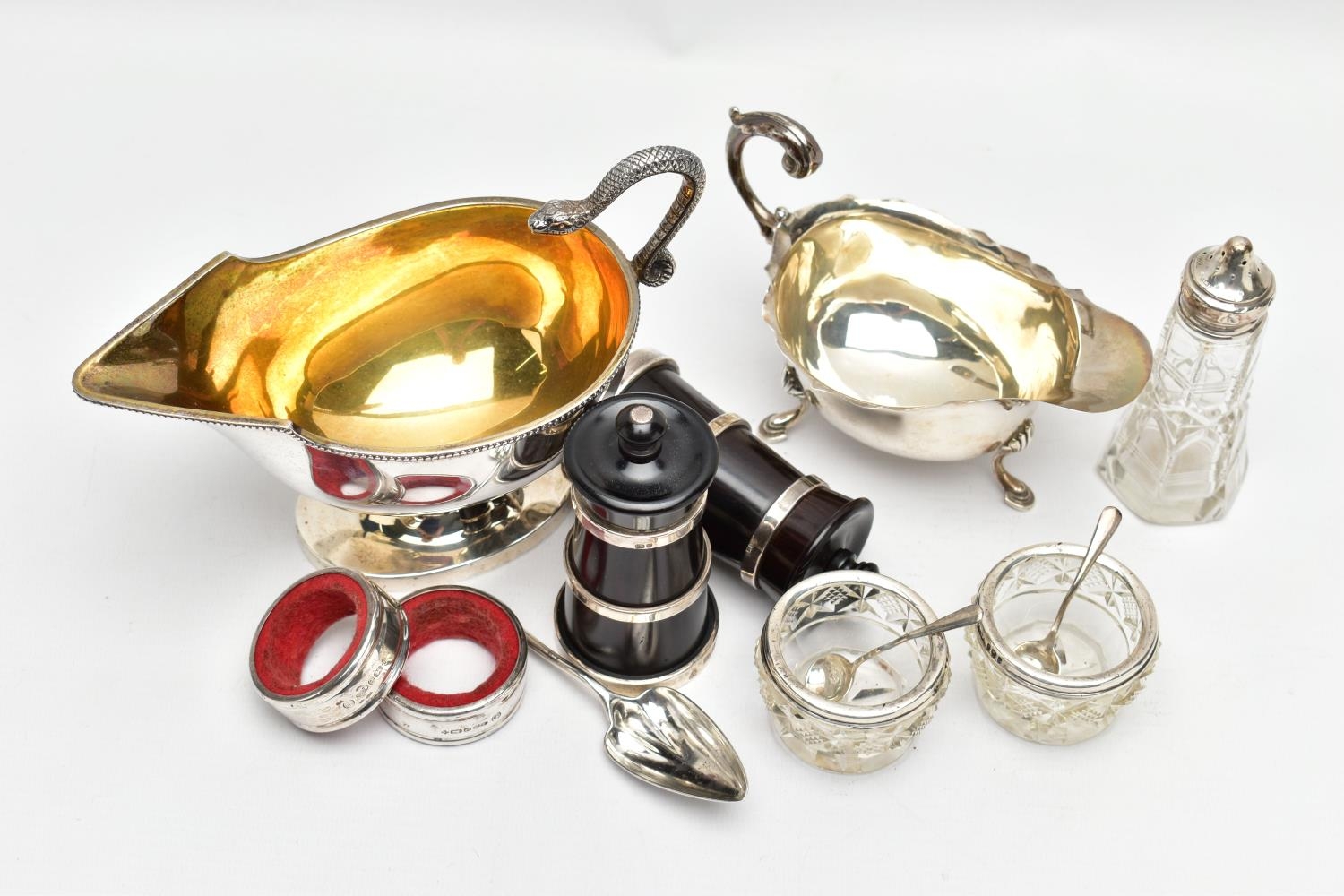 A PAIR OF ELIZABETH II SILVER MOUNTED WOODEN SALT AND PEPPER GRINDERS, AN ELIZABETH II SILVER SAUCE BOAT AND NINE OTHER ITEMS, the salt and pepper mills of milk churn style, makers M C Hersey & Son Ltd, London 1998, height 9cm, the sauce boat with beaded rim, scrolled snake handle, gilt interior, short pedestal and oval foot, maker WW, London 1998, 9.13ozt, 283.9 grams, height 12.8cm, a George VI sauce boat, wavy rim, S scroll handle, on three cabriole legs with shell knees and hoof feet, Birmingham 1939, a late 19th century American Gorham sterling silver short handled spoon, engraved 'Addie 1891' to the back, retailed by Bigelow Kennard & Co, length 10cm, a pair of wine bottle collars, makers L J Millington, Birmingham 2000, a pair of silver mounted glass salts with silver salt spoons and a silver mounted glass pepperette, gross weight of weighable silver 12.06ozt, 375.1 grams (12) (Condition report: the wooden mills are in good useable condition, sauce boat with snake handle is in good condition, the other sauce boat has a number of dents, the salt spoons are bent and the glass pepperette has chips)