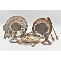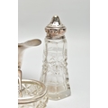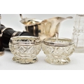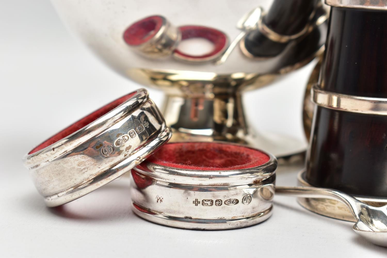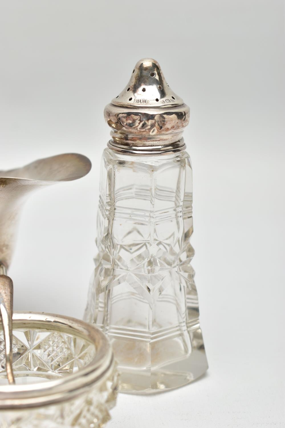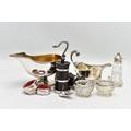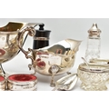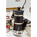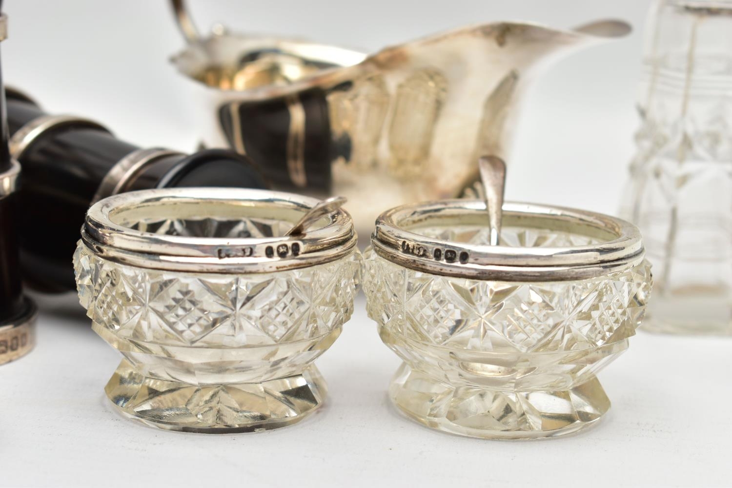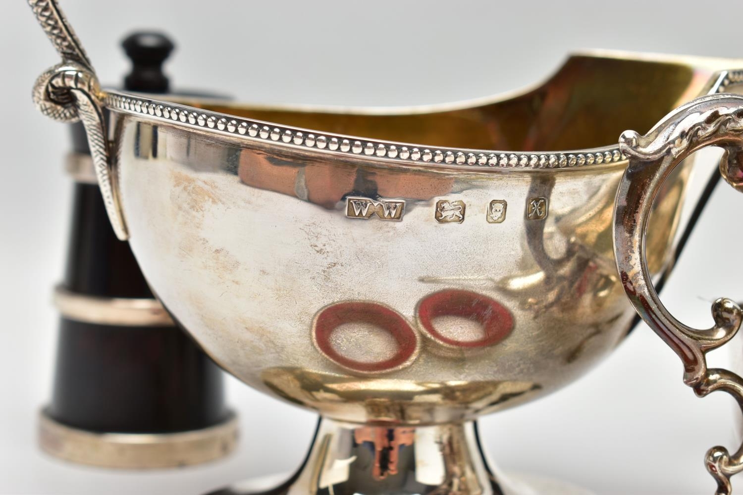 A PAIR OF ELIZABETH II SILVER MOUNTED WOODEN SALT AND PEPPER GRINDERS, AN ELIZABETH II SILVER SAUCE BOAT AND NINE OTHER ITEMS, the salt and pepper mills of milk churn style, makers M C Hersey & Son Ltd, London 1998, height 9cm, the sauce boat with beaded rim, scrolled snake handle, gilt interior, short pedestal and oval foot, maker WW, London 1998, 9.13ozt, 283.9 grams, height 12.8cm, a George VI sauce boat, wavy rim, S scroll handle, on three cabriole legs with shell knees and hoof feet, Birmingham 1939, a late 19th century American Gorham sterling silver short handled spoon, engraved 'Addie 1891' to the back, retailed by Bigelow Kennard & Co, length 10cm, a pair of wine bottle collars, makers L J Millington, Birmingham 2000, a pair of silver mounted glass salts with silver salt spoons and a silver mounted glass pepperette, gross weight of weighable silver 12.06ozt, 375.1 grams (12) (Condition report: the wooden mills are in good useable condition, sauce boat with snake handle is in good condition, the other sauce boat has a number of dents, the salt spoons are bent and the glass pepperette has chips)