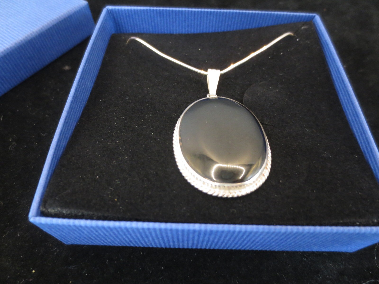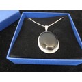 A 925 silver chain and silver oval pendant set with large black stone. Clasp stamped 925 Italy. Gross weight of pendant and chain approx. 10g. With a blue cardboard presentation box