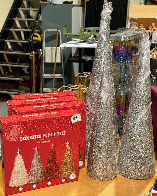 Trio of Glitzy Cone Trees + 4 x Boxed Decorated Pop Up Trees