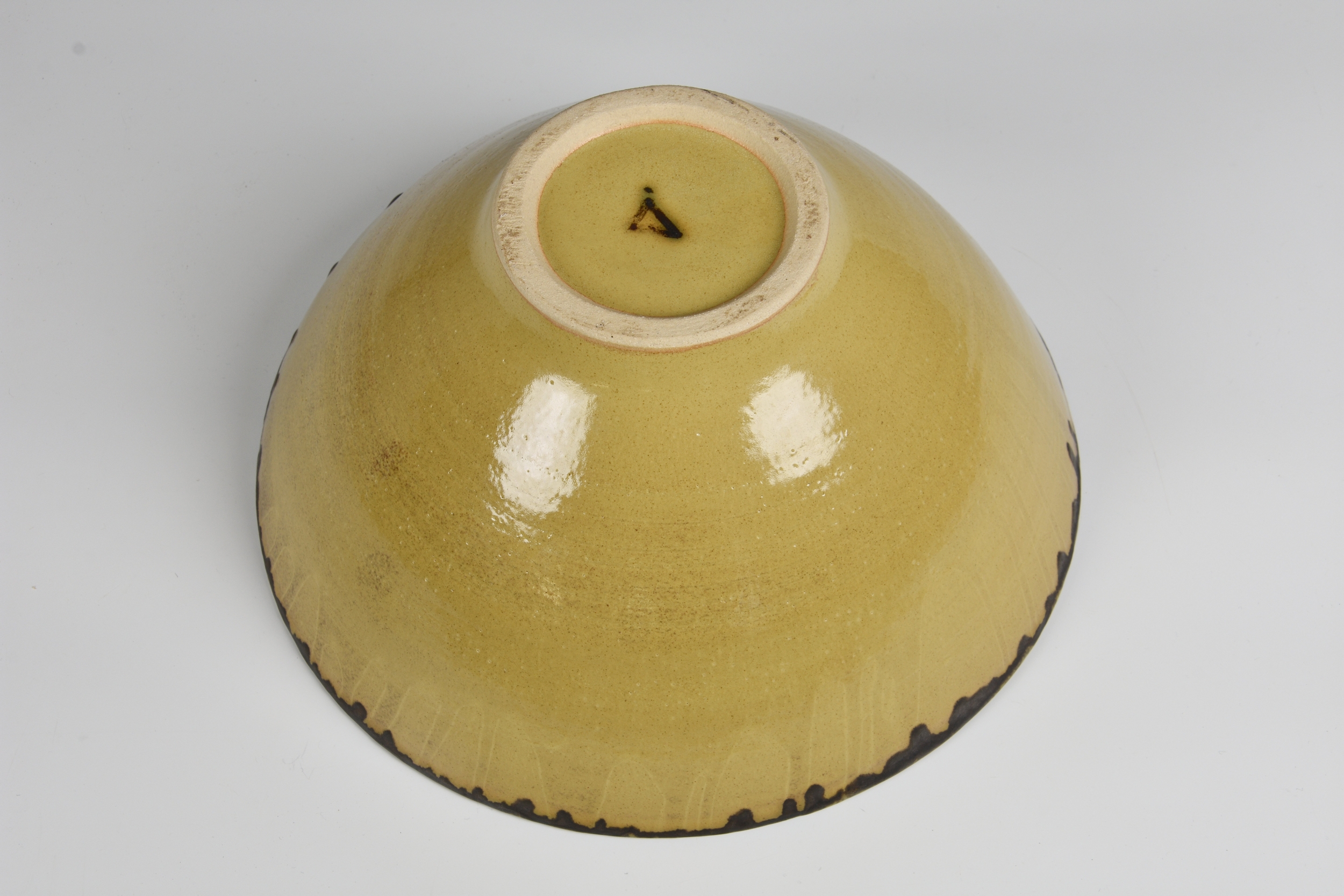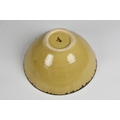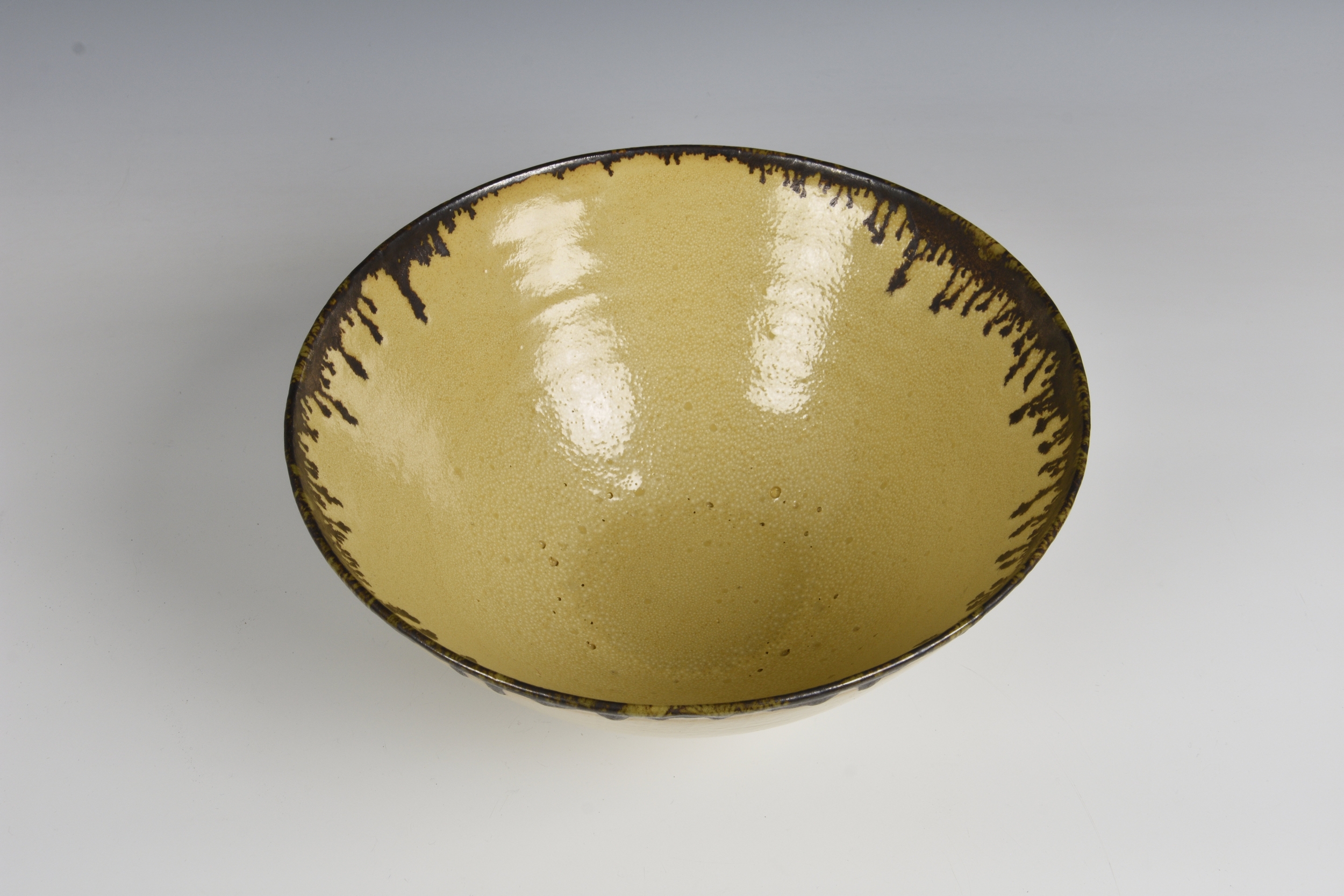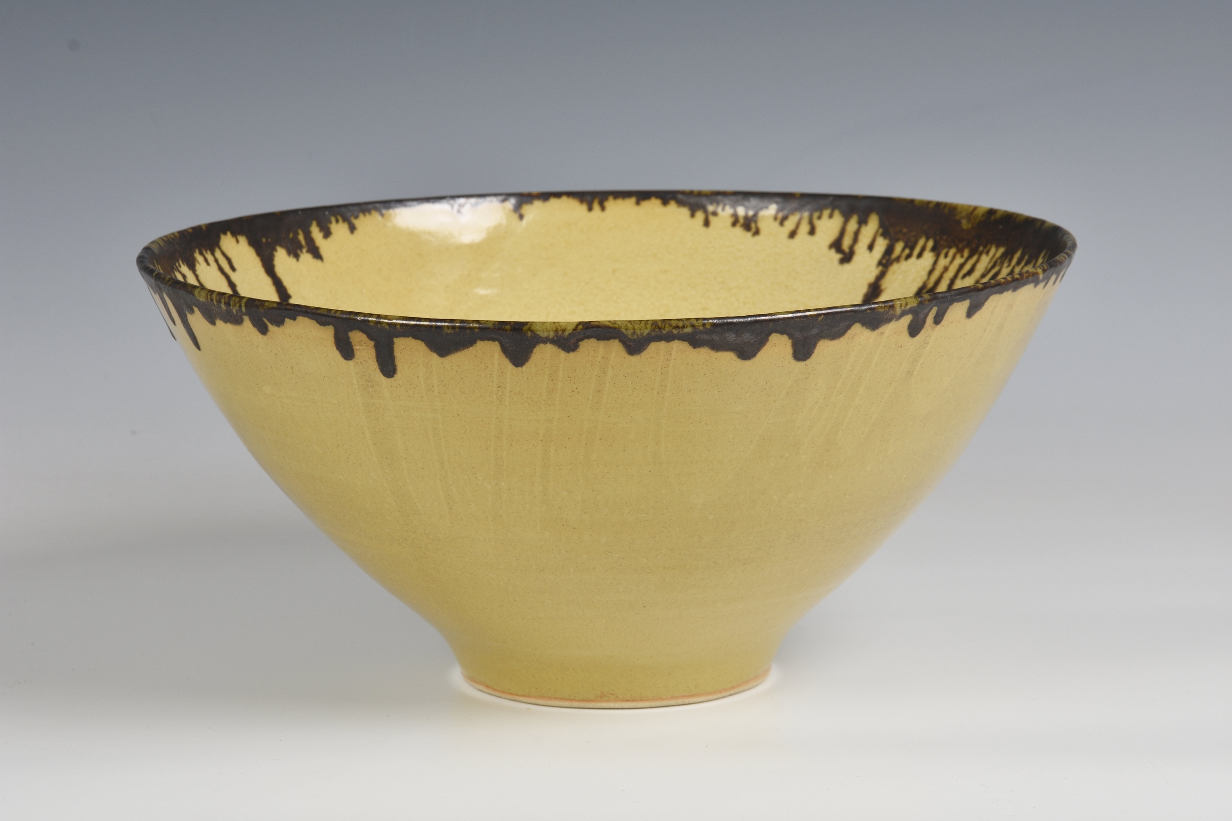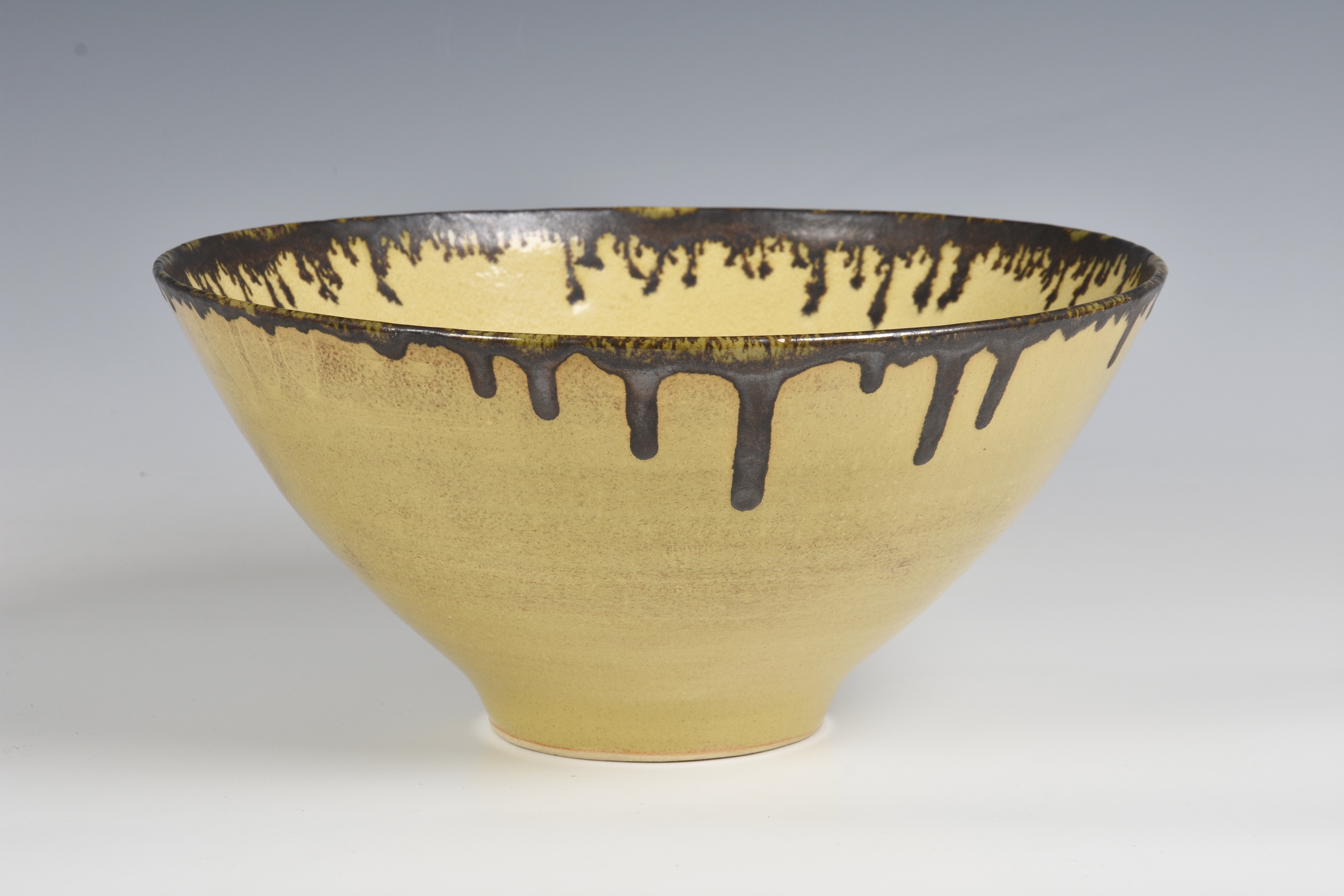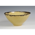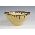 A studio pottery bowl in the manner of Dame Lucie Rie the flared, footed stoneware bowl in a mottled, straw yellow glaze, with dripped bronze glaze around the rim, painted mark to glazed base, 27.75cm. diameter, 13.1cm. high. *Very good condition, with no damage. The glaze has a scattering of burst bubbles to the interior well, from the making.