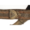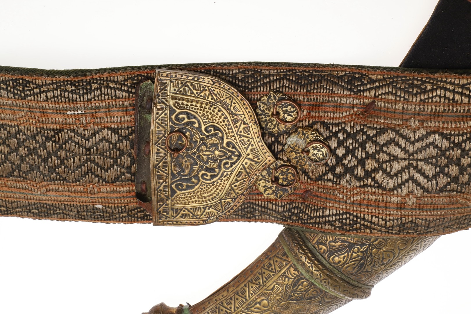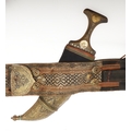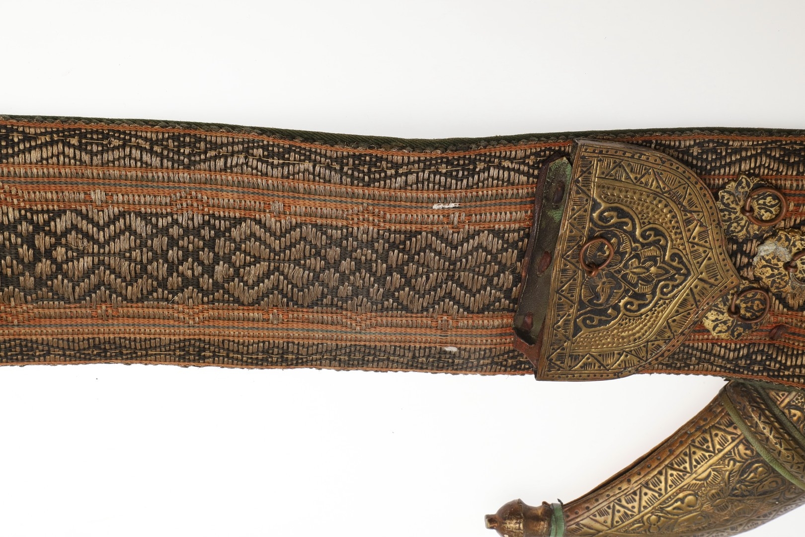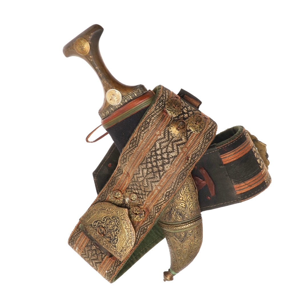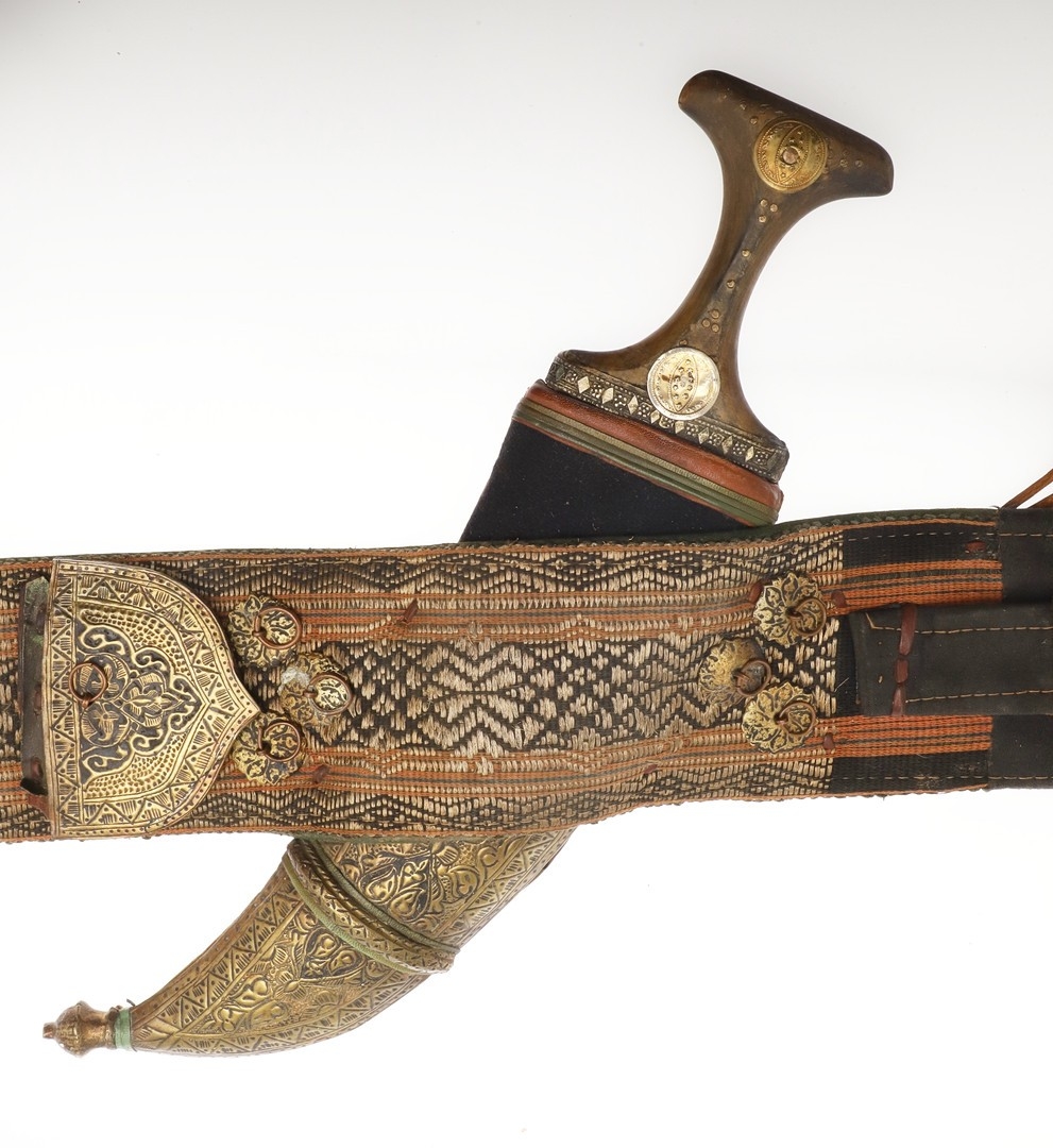 A YEMENI JANABI KNIFE AND SCABBARD ON THE ORIGINAL BROAD BELT. The knife with a 22 cm curved blade with a pronounced central spine, on an elaborate horn handle with applied metal mounts. In a brass fronted and fabric scabbard with original woven fabric belt. 100 cm x 9.5 cm.