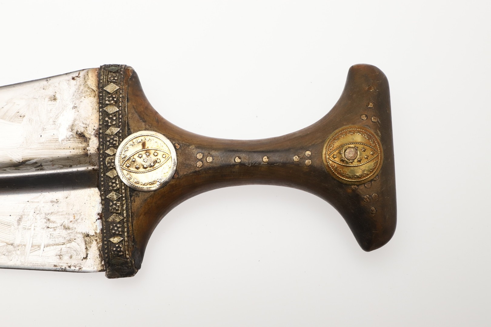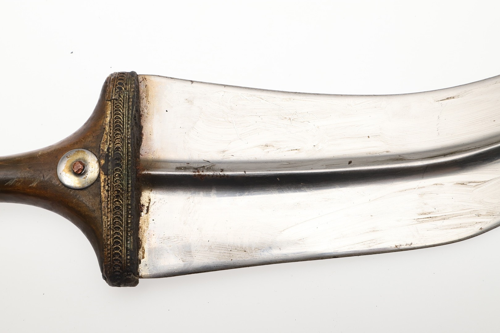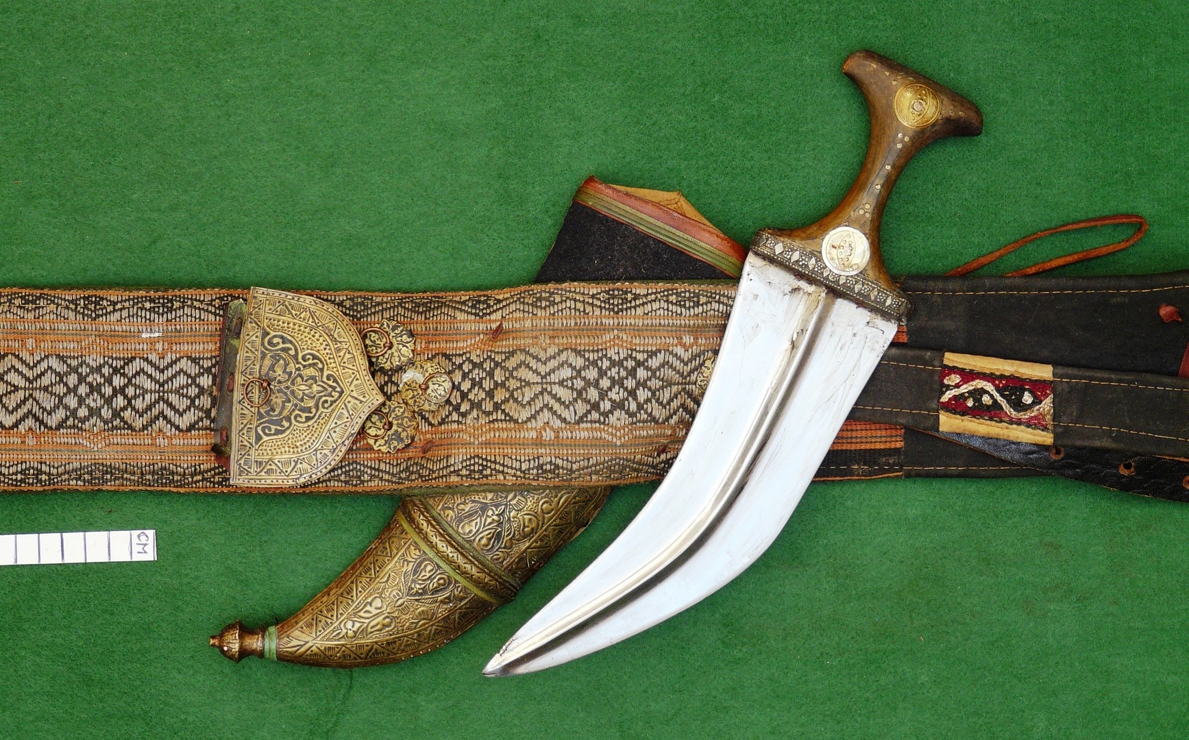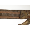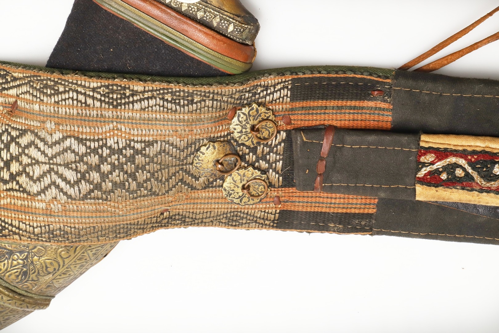A YEMENI JANABI KNIFE AND SCABBARD ON THE ORIGINAL BROAD BELT. The knife with a 22 cm curved blade with a pronounced central spine, on an elaborate horn handle with applied metal mounts. In a brass fronted and fabric scabbard with original woven fabric belt. 100 cm x 9.5 cm.