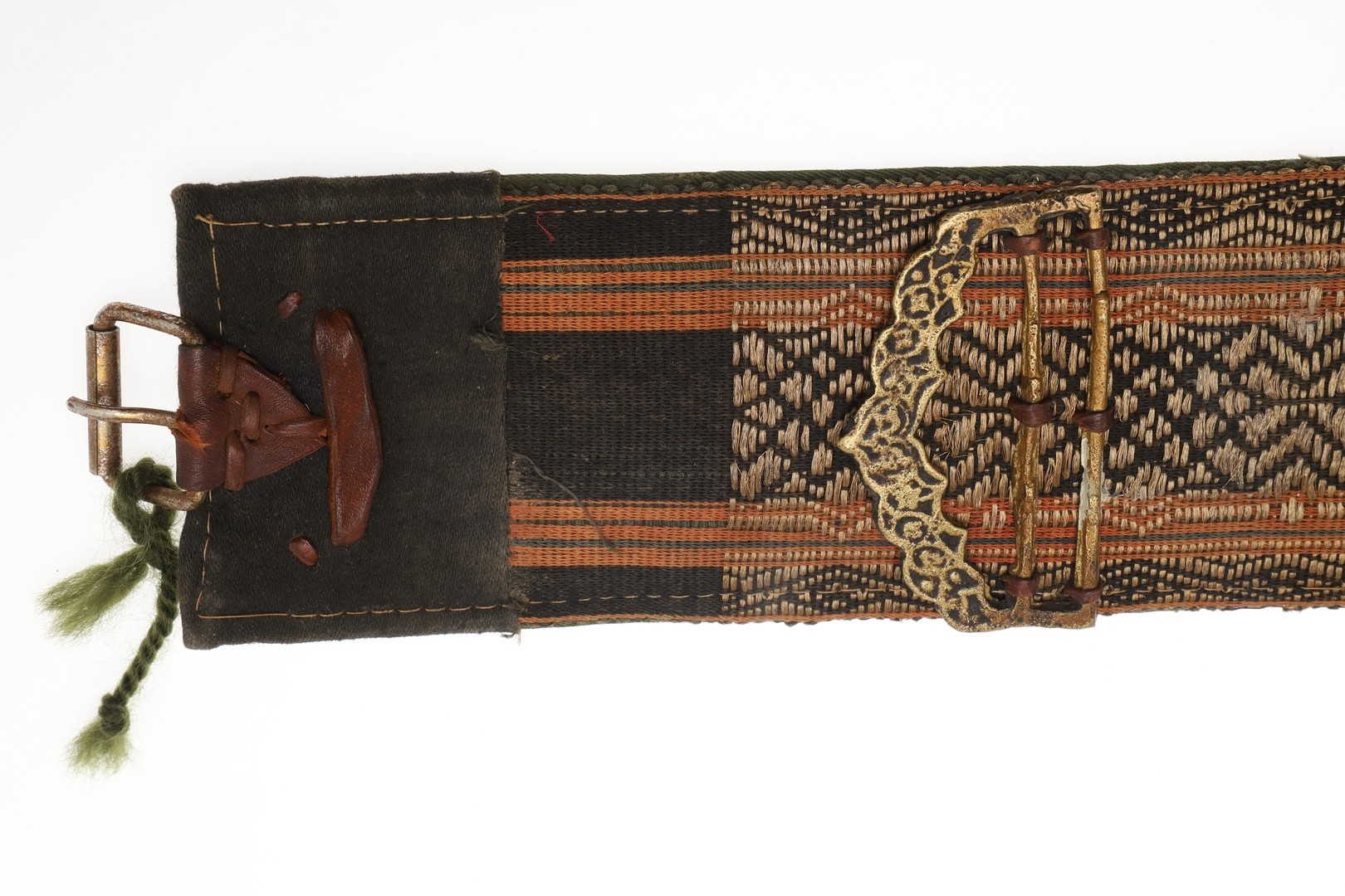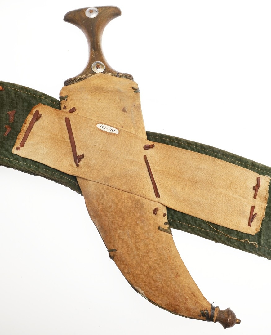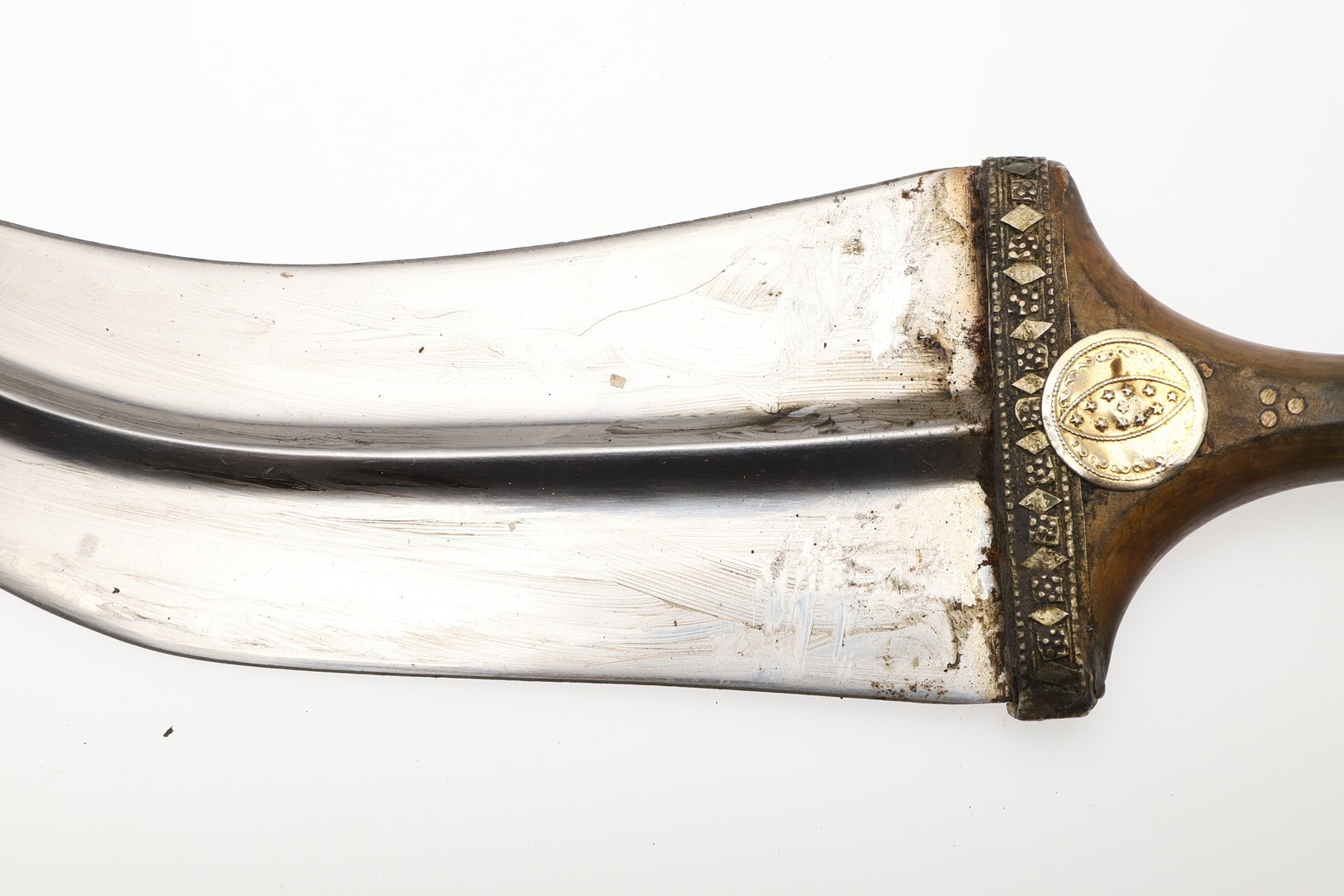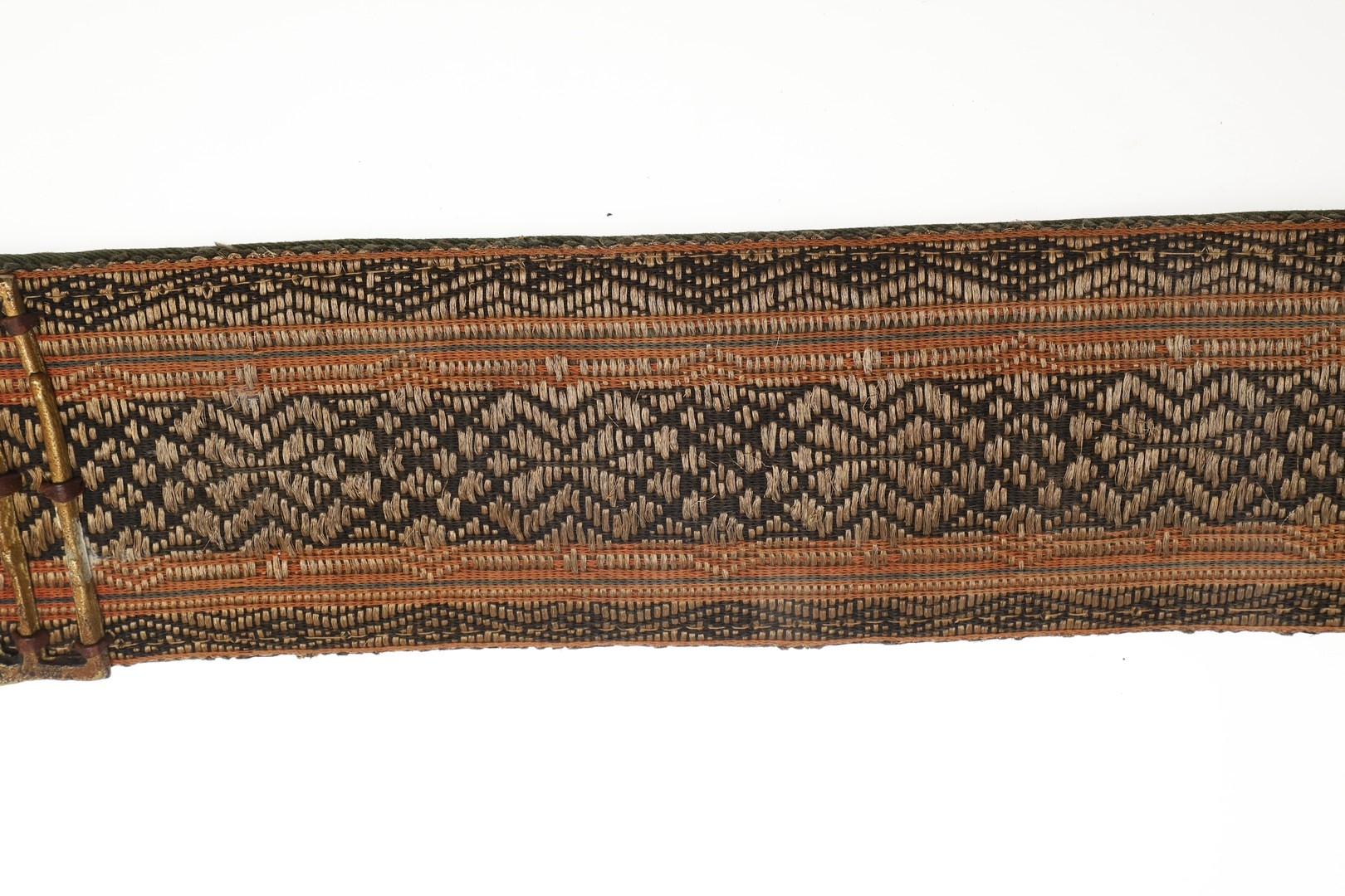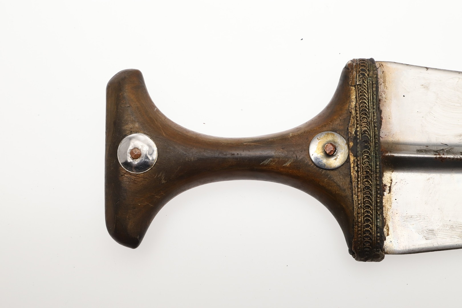 A YEMENI JANABI KNIFE AND SCABBARD ON THE ORIGINAL BROAD BELT. The knife with a 22 cm curved blade with a pronounced central spine, on an elaborate horn handle with applied metal mounts. In a brass fronted and fabric scabbard with original woven fabric belt. 100 cm x 9.5 cm.