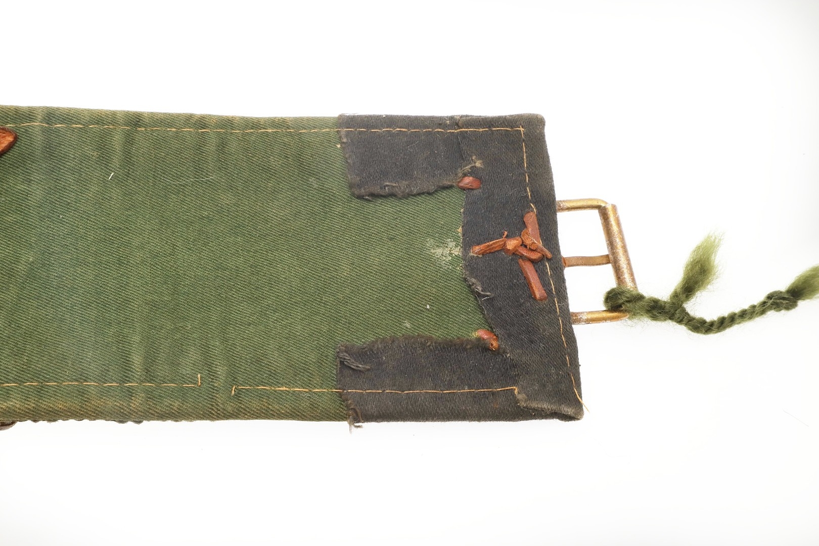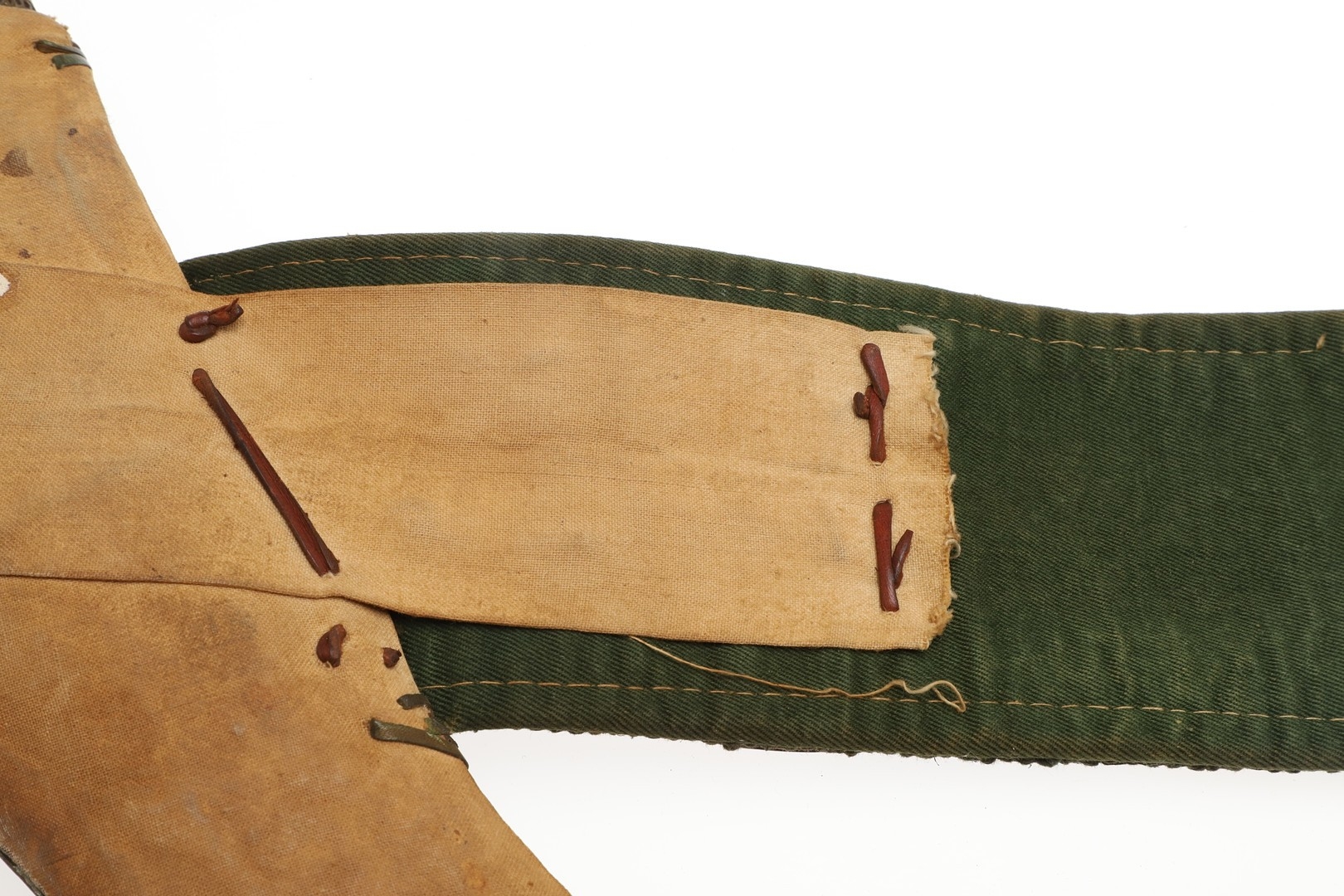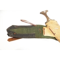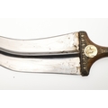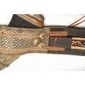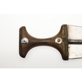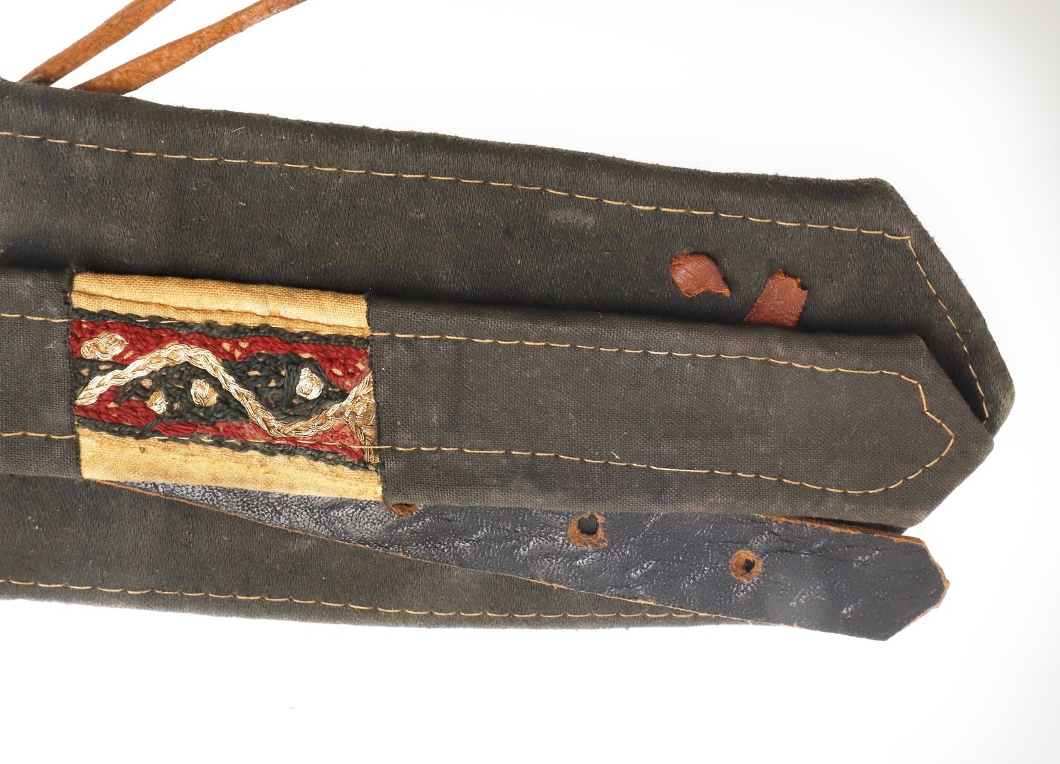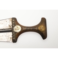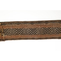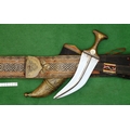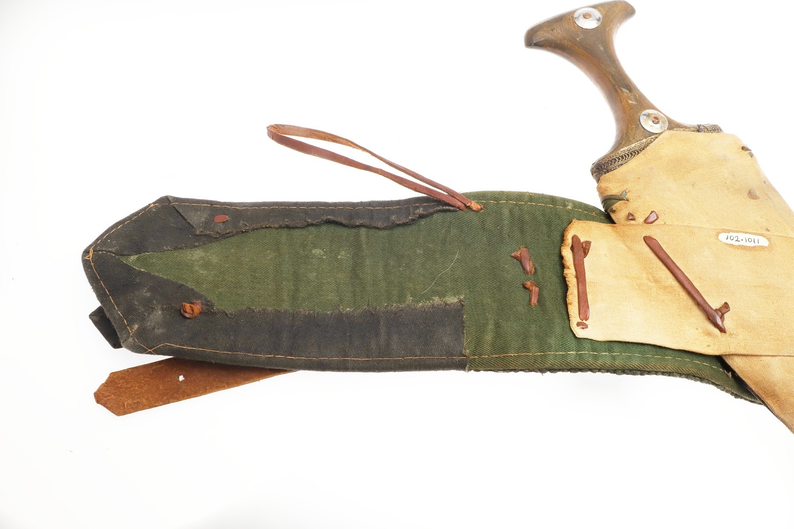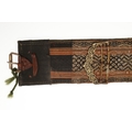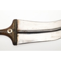 A YEMENI JANABI KNIFE AND SCABBARD ON THE ORIGINAL BROAD BELT. The knife with a 22 cm curved blade with a pronounced central spine, on an elaborate horn handle with applied metal mounts. In a brass fronted and fabric scabbard with original woven fabric belt. 100 cm x 9.5 cm.