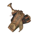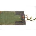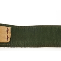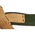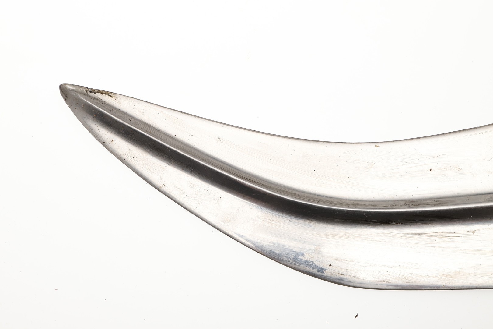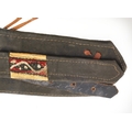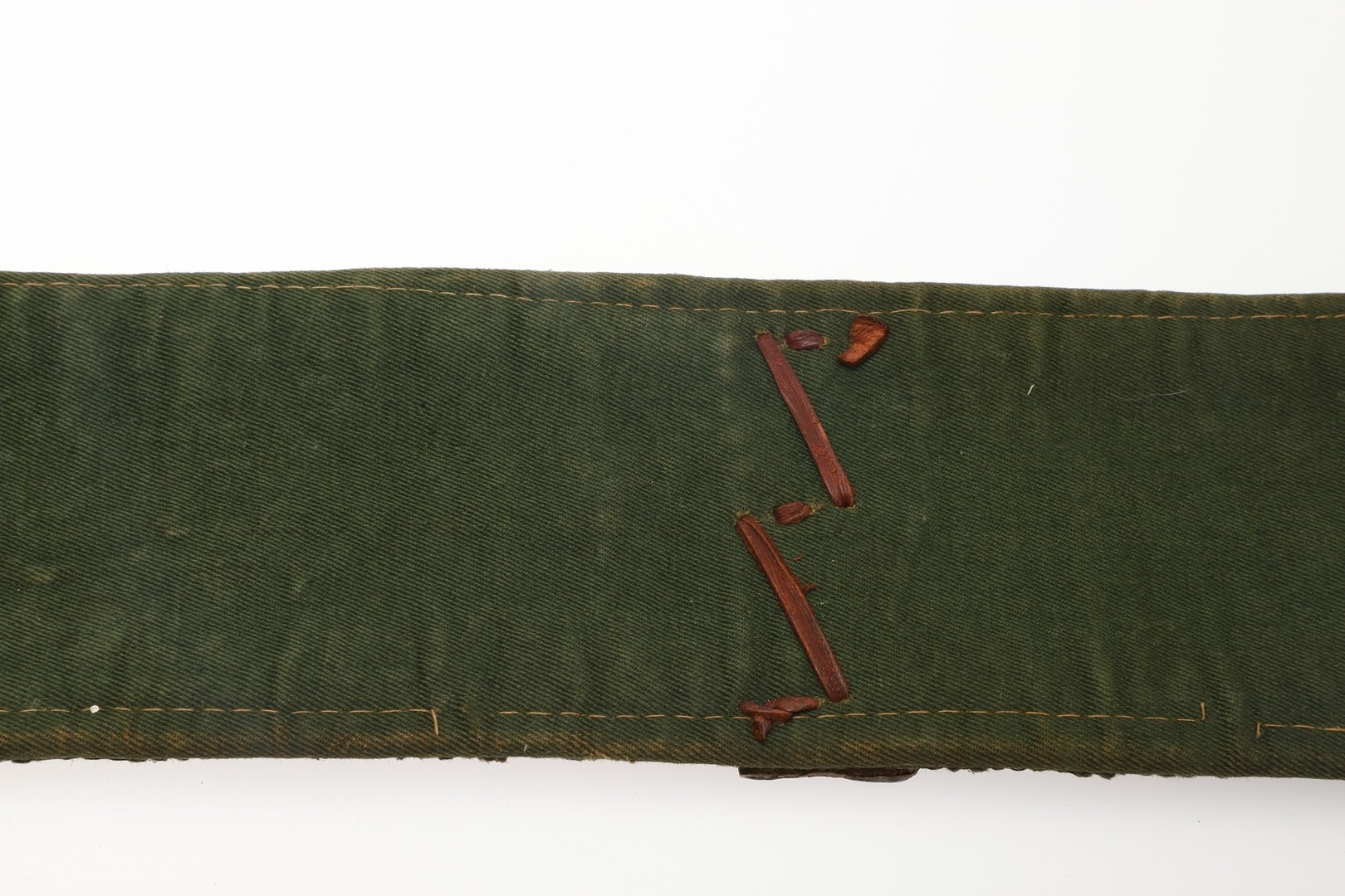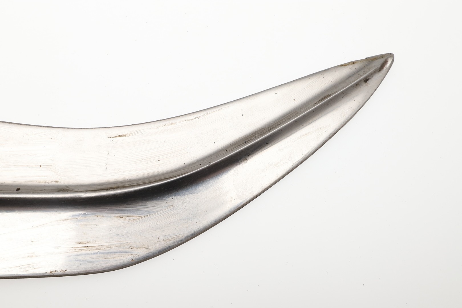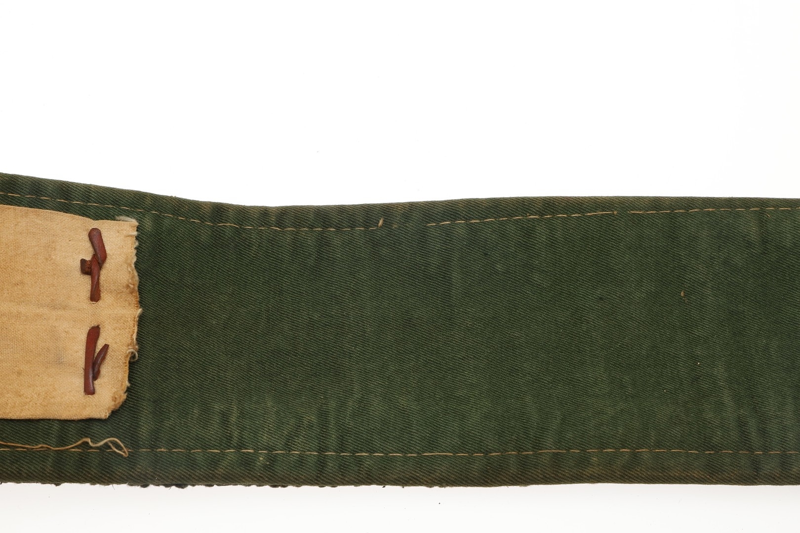 A YEMENI JANABI KNIFE AND SCABBARD ON THE ORIGINAL BROAD BELT. The knife with a 22 cm curved blade with a pronounced central spine, on an elaborate horn handle with applied metal mounts. In a brass fronted and fabric scabbard with original woven fabric belt. 100 cm x 9.5 cm.
