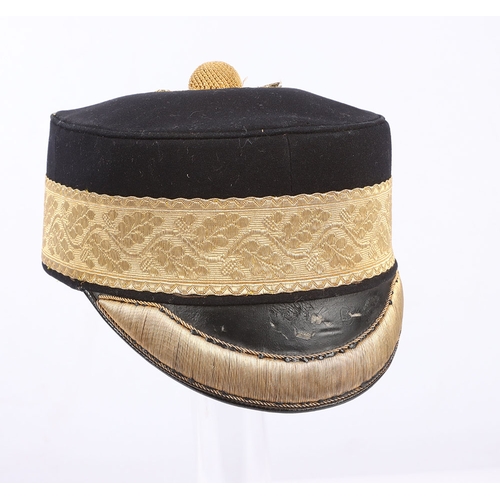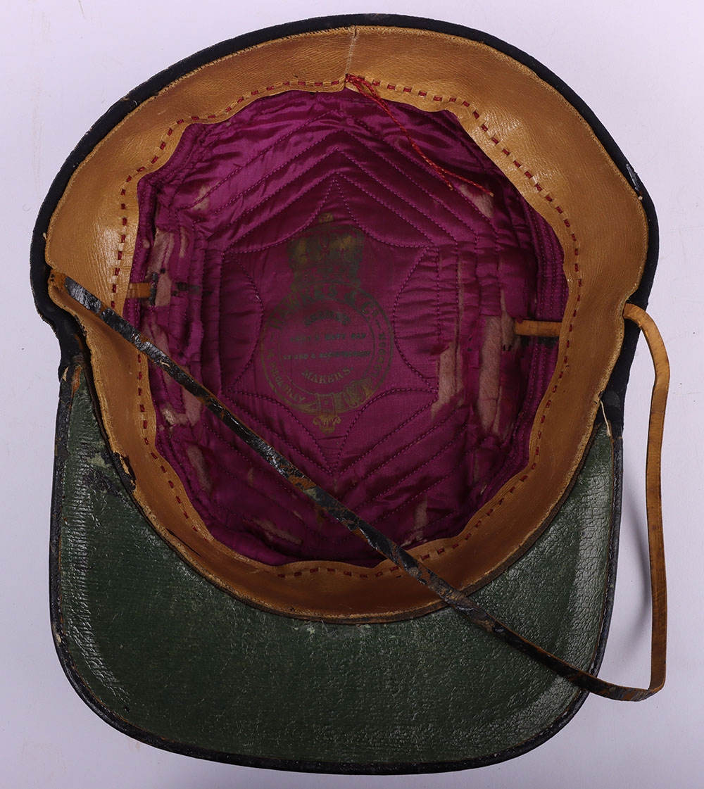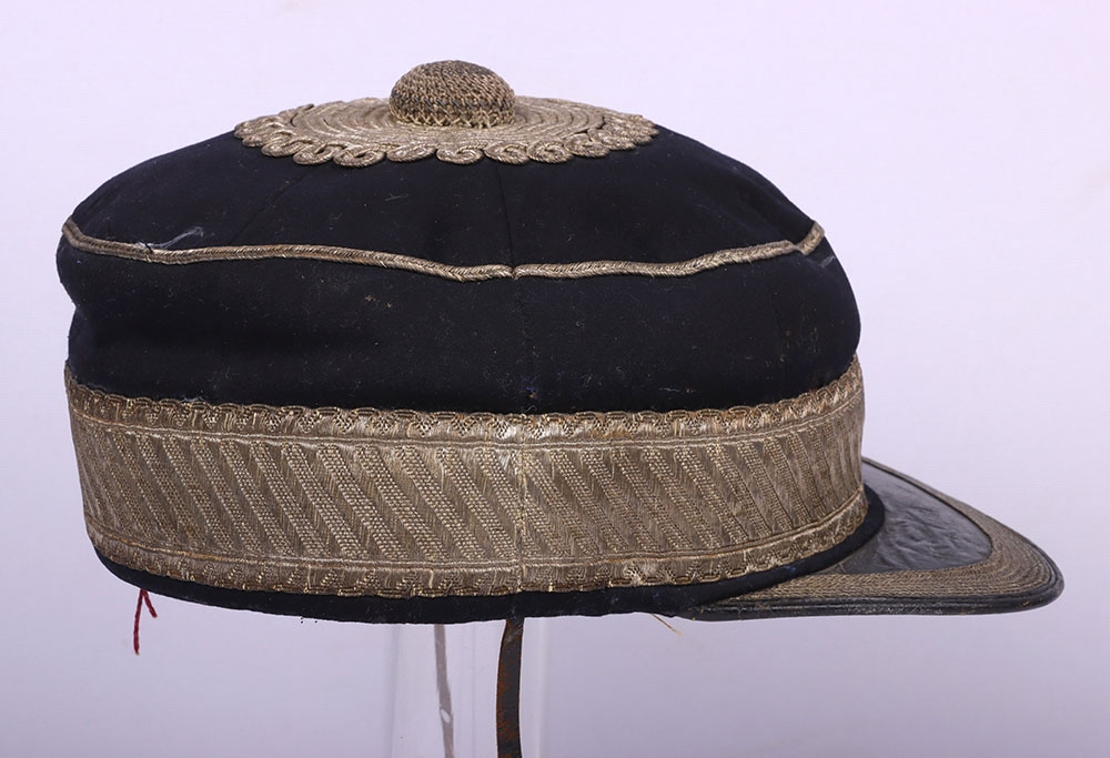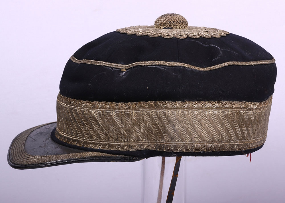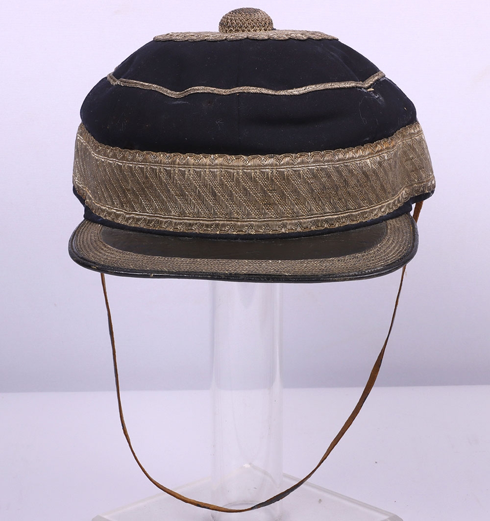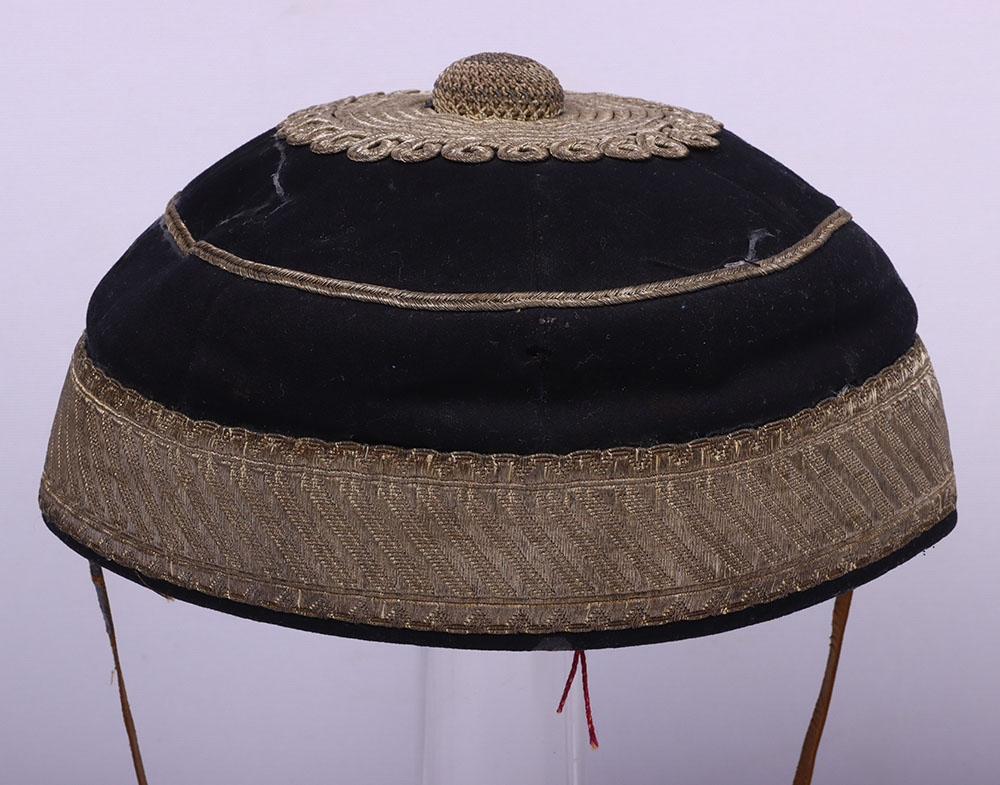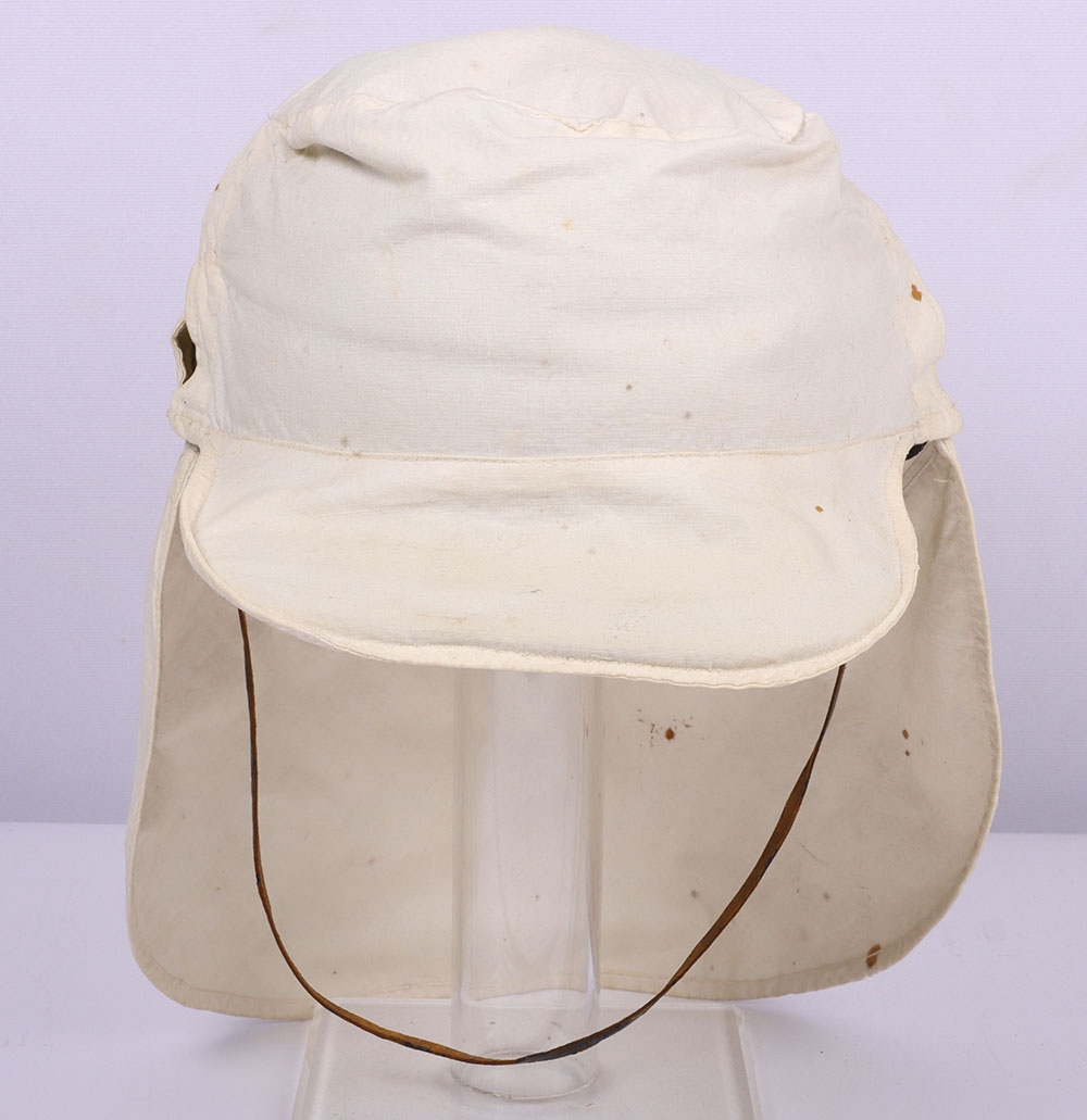 Scarce Indian Mutiny Period Peaked Forage Cap of the 14th Light Dragoons with Original White Cloth Cover and Neck Flap, fine example of an early 1855 period peaked forage cap with thick band of regimental pattern lace, bullion wire piping to the crown, knotted top and bullion cord decoration to the crown. Squared leather peak with bullion wire. Thin patent chinstrap, brown leather sweatband and quilted crimson lining. What makes this cap very rare is that it is complete with the original white cloth cover for wear in hot weather and the original neck flap.