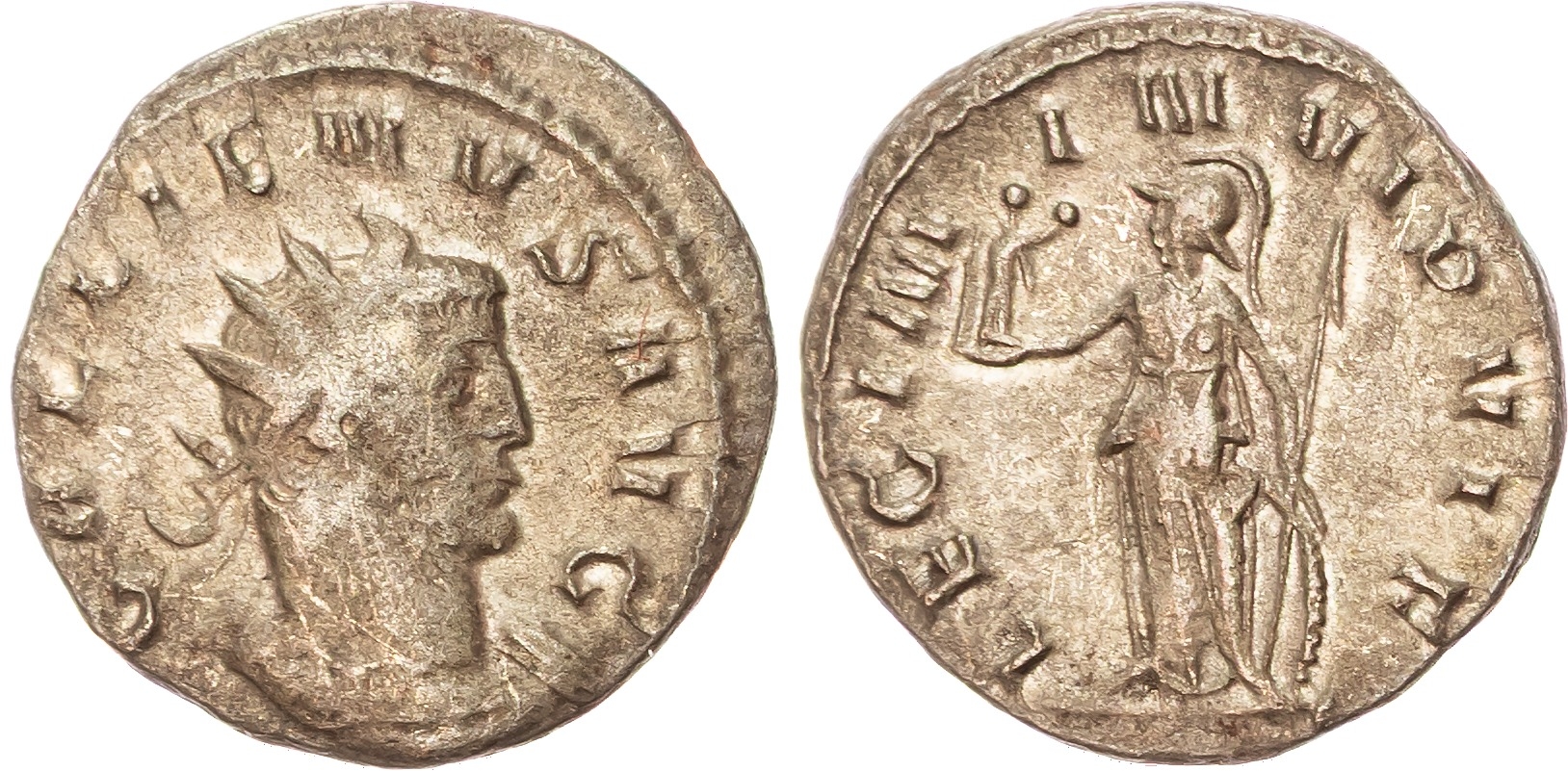 GALLEINVS AVG, radiate and cuirassed bust right. Rev. LEG I MIN VI P VI F, Minerva standing left, holding spear, shield and Victory. (RIC 322; MIR 988r). Very Fine.