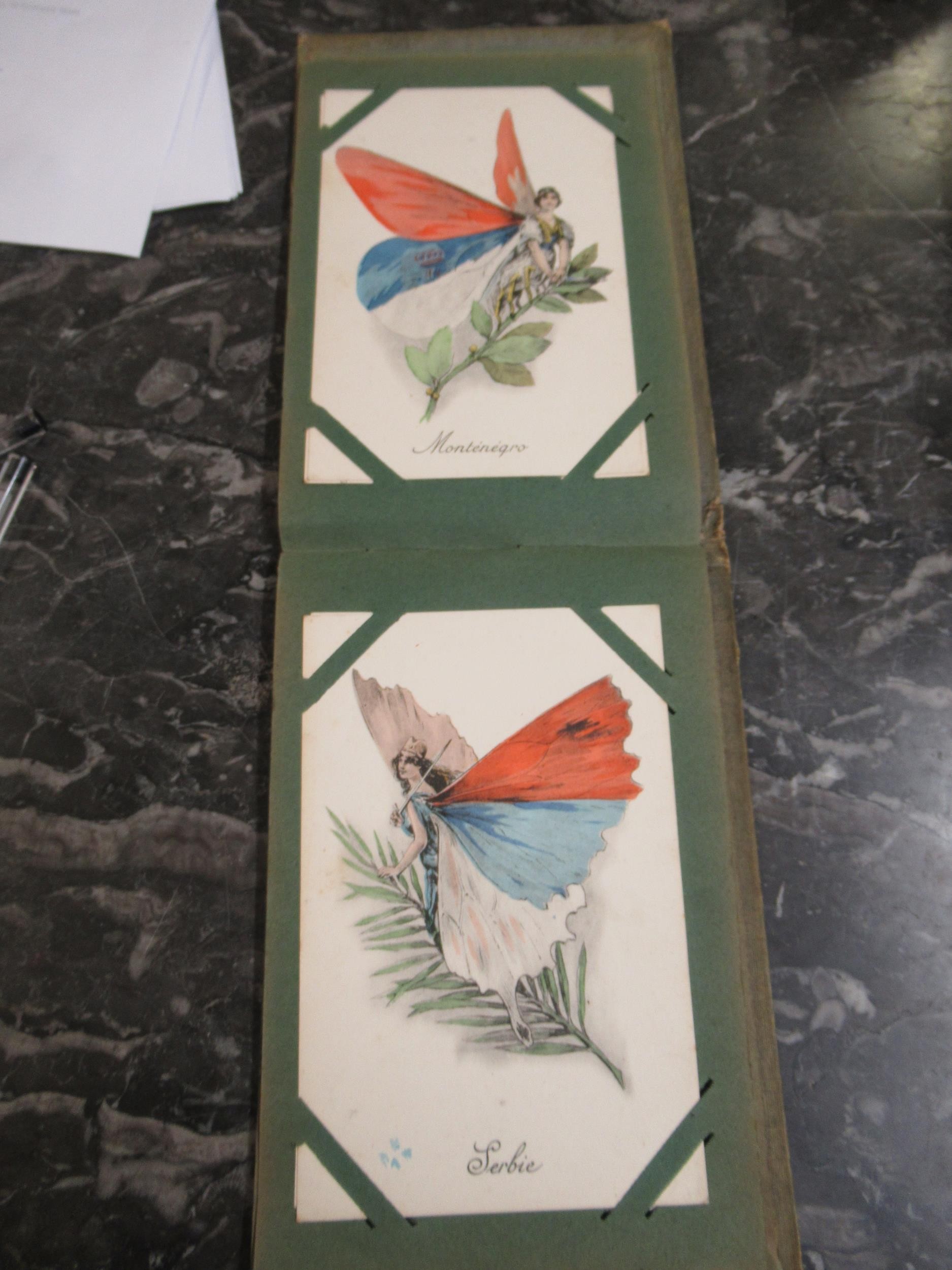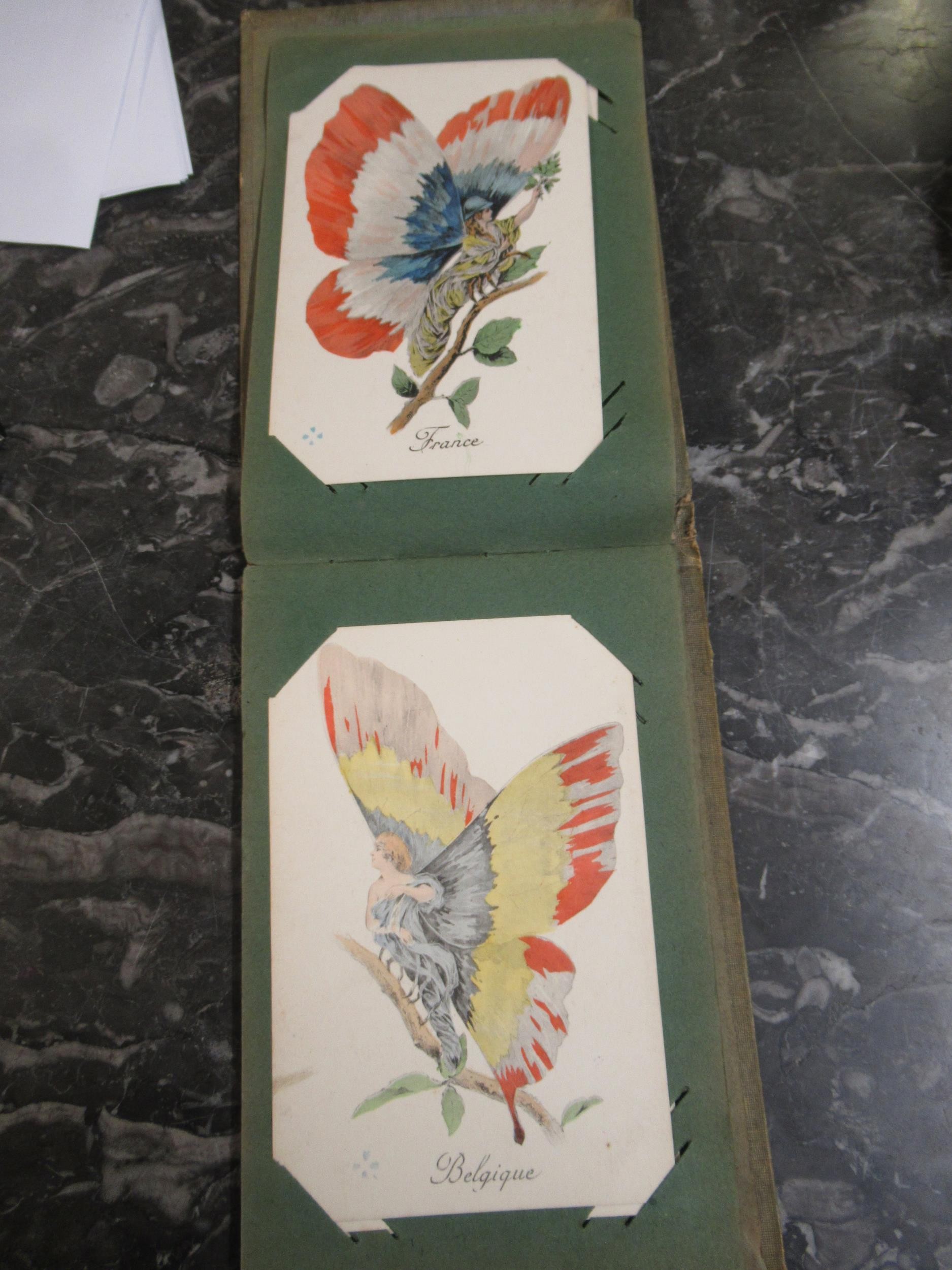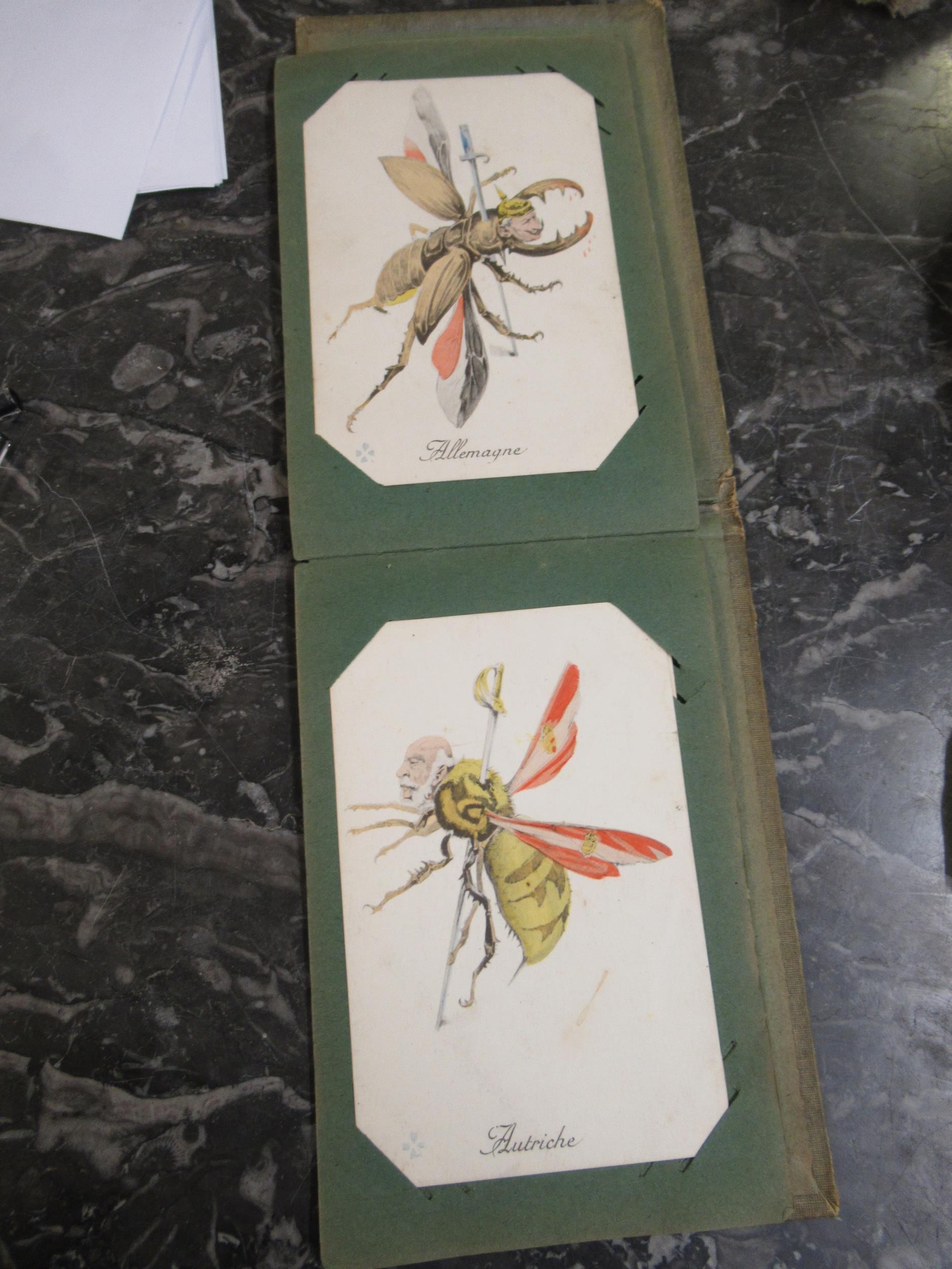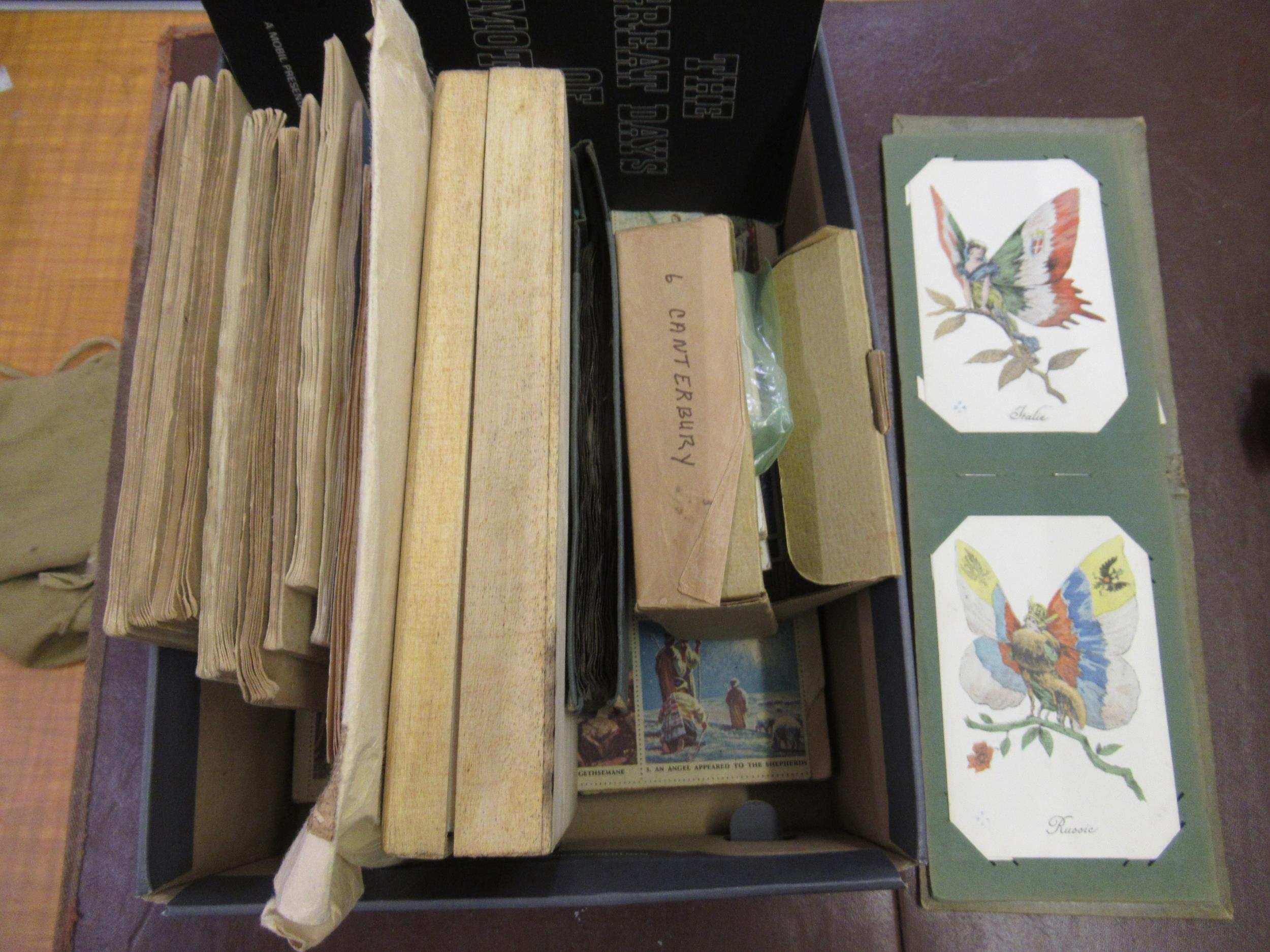 Small box containing a quantity of various albums of cigarette cards including John Player & Sons Film Stars etc., together with a small album of French WWI related comical postcards