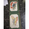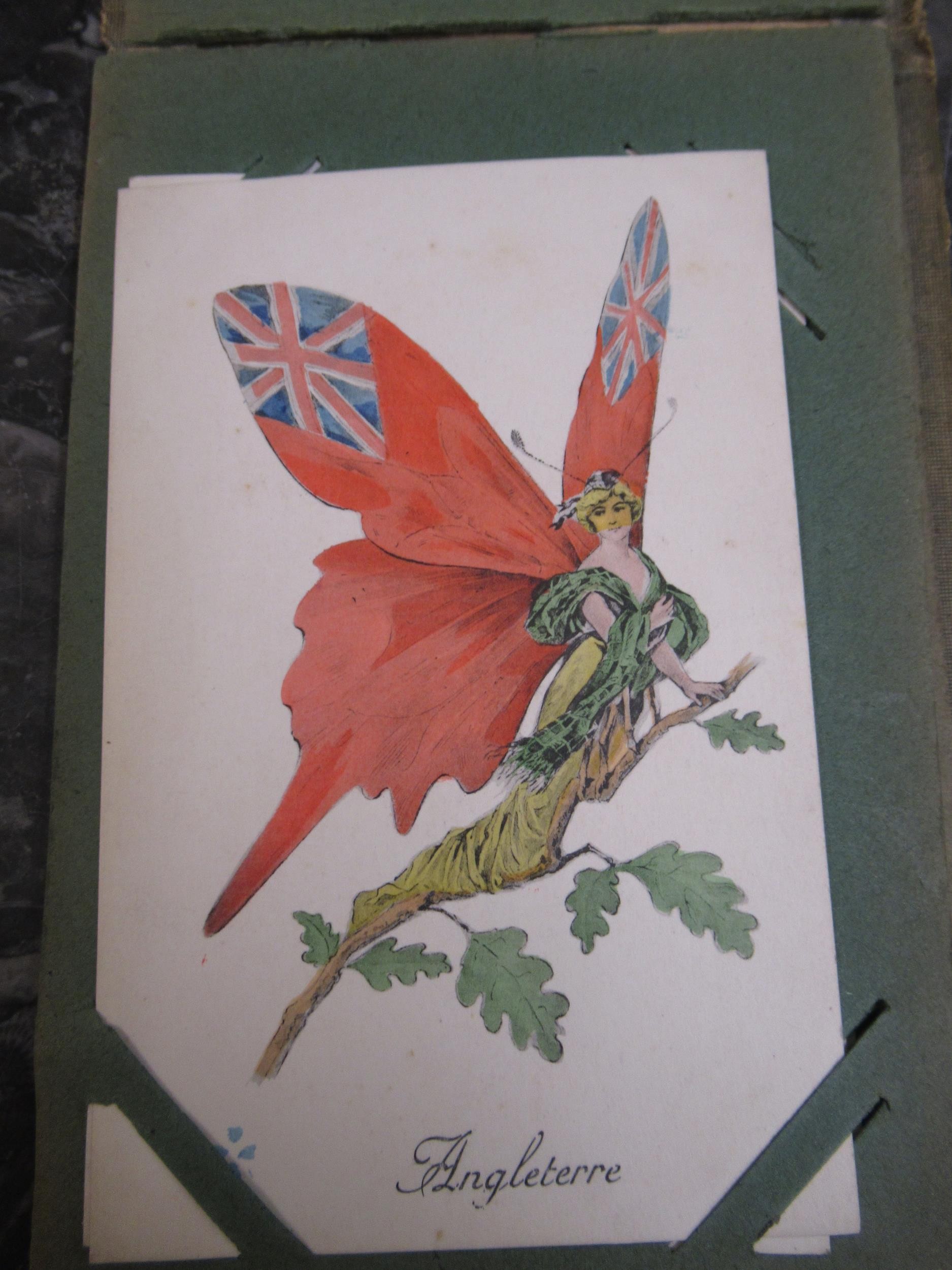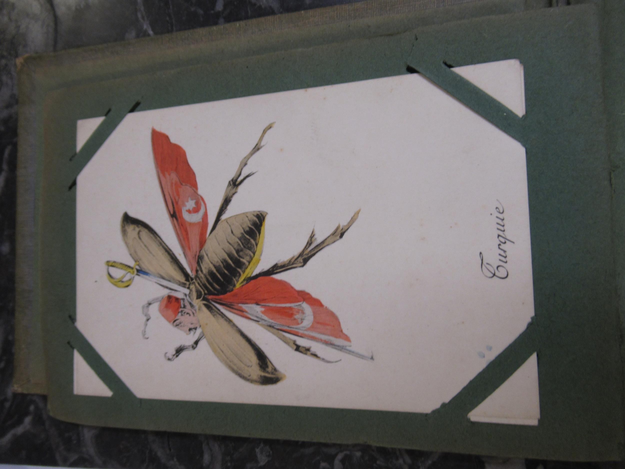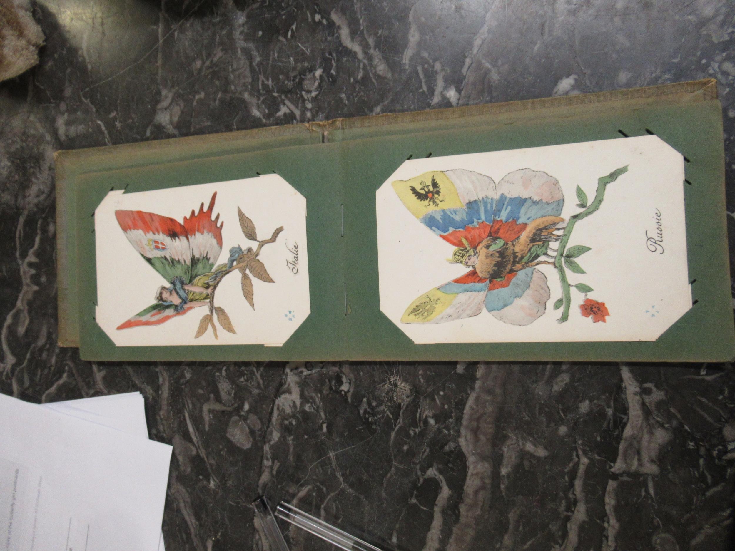 Small box containing a quantity of various albums of cigarette cards including John Player & Sons Film Stars etc., together with a small album of French WWI related comical postcards