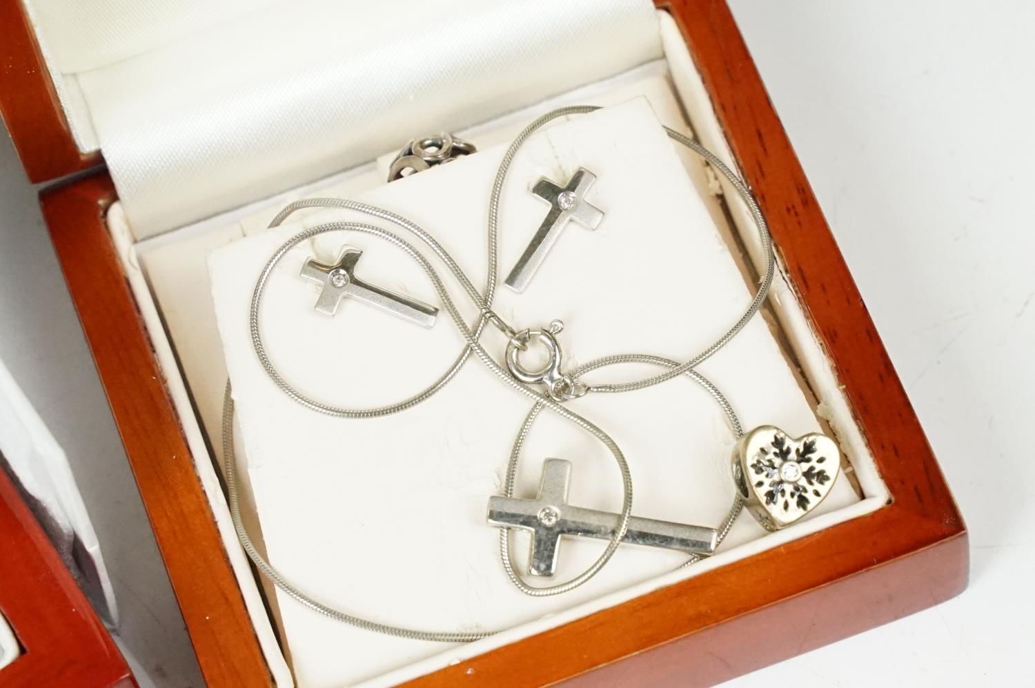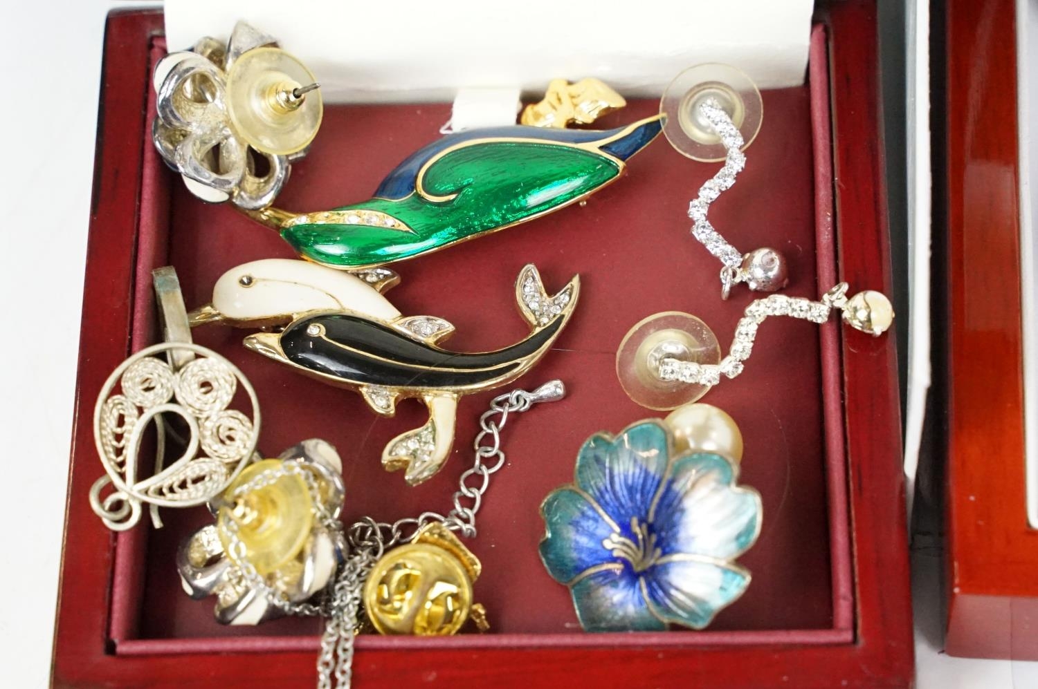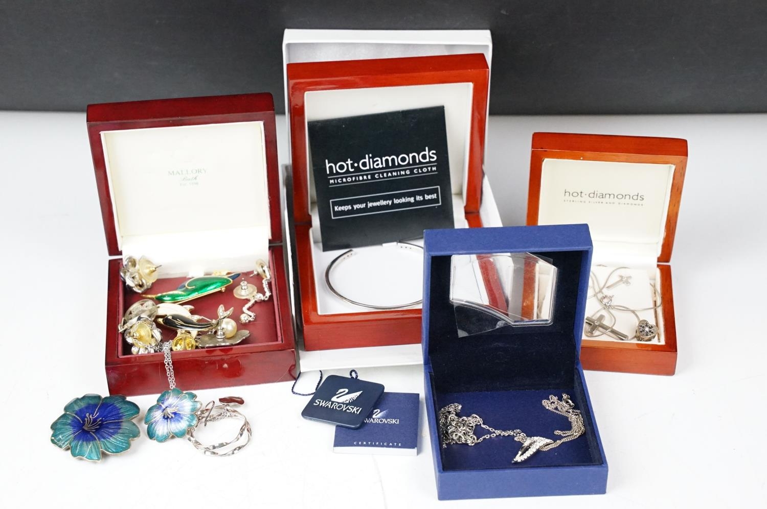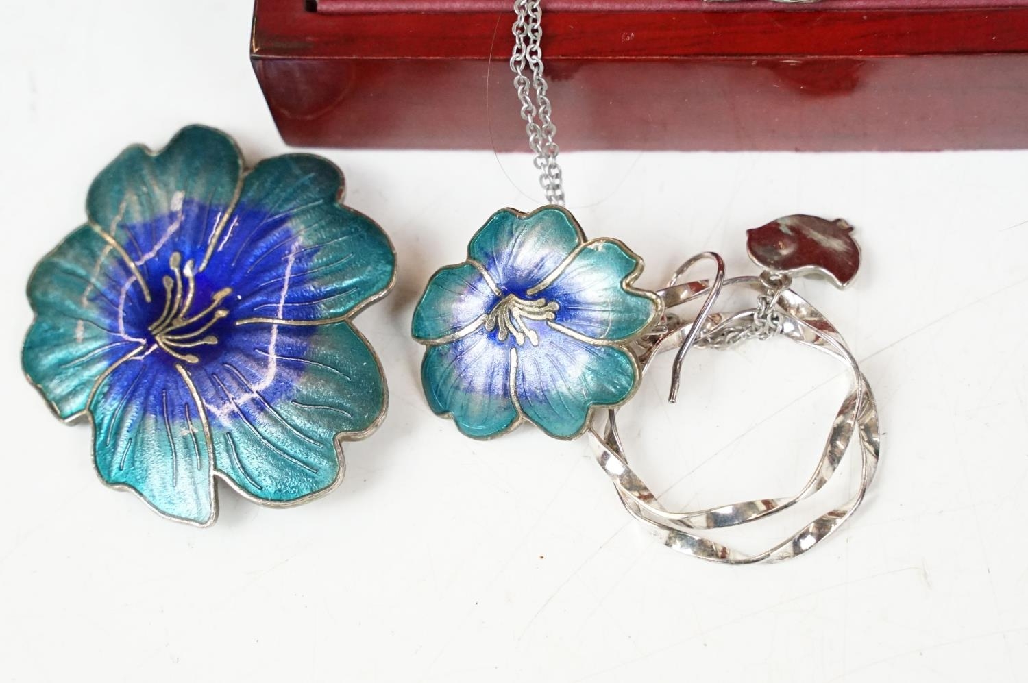 A small collection of mixed vintage and contemporary jewellery to include silver and enamel examples.