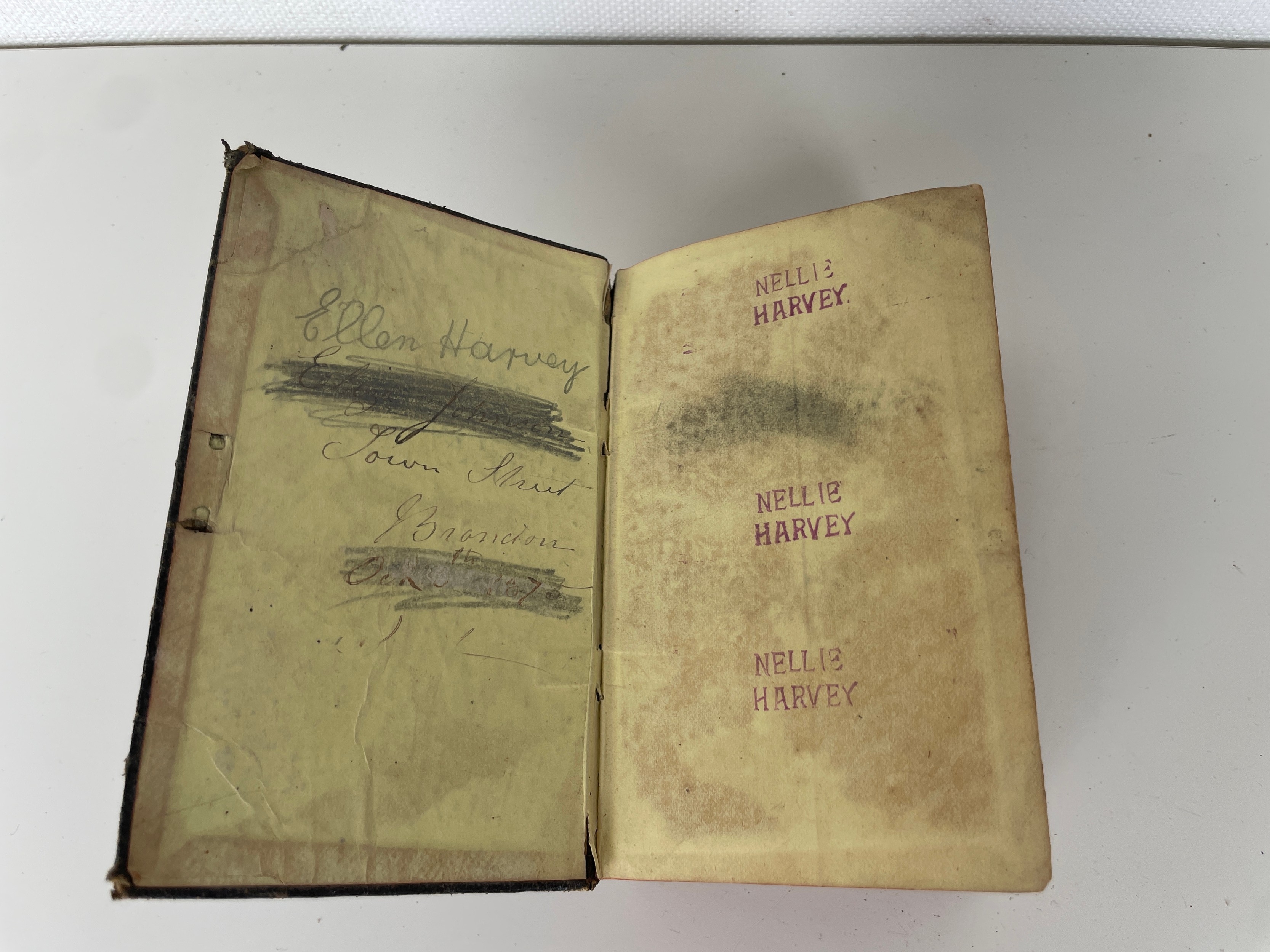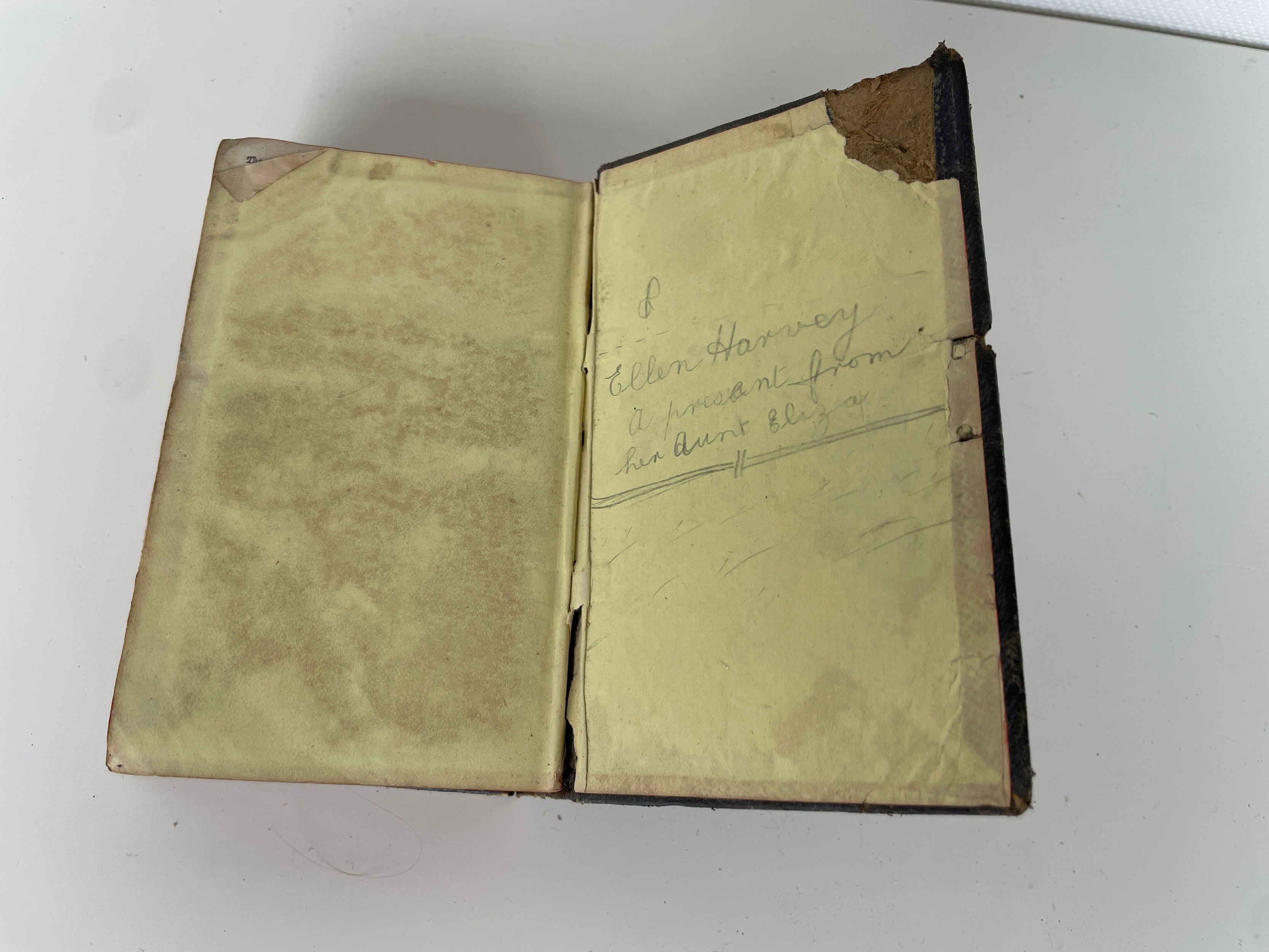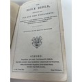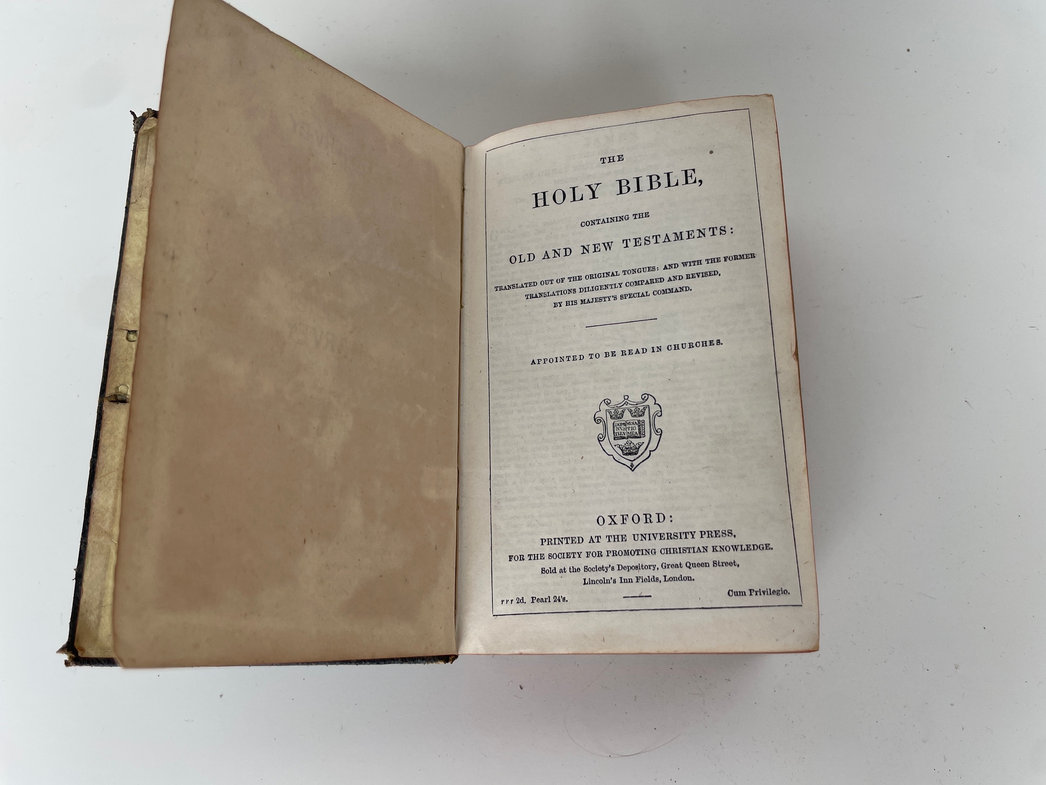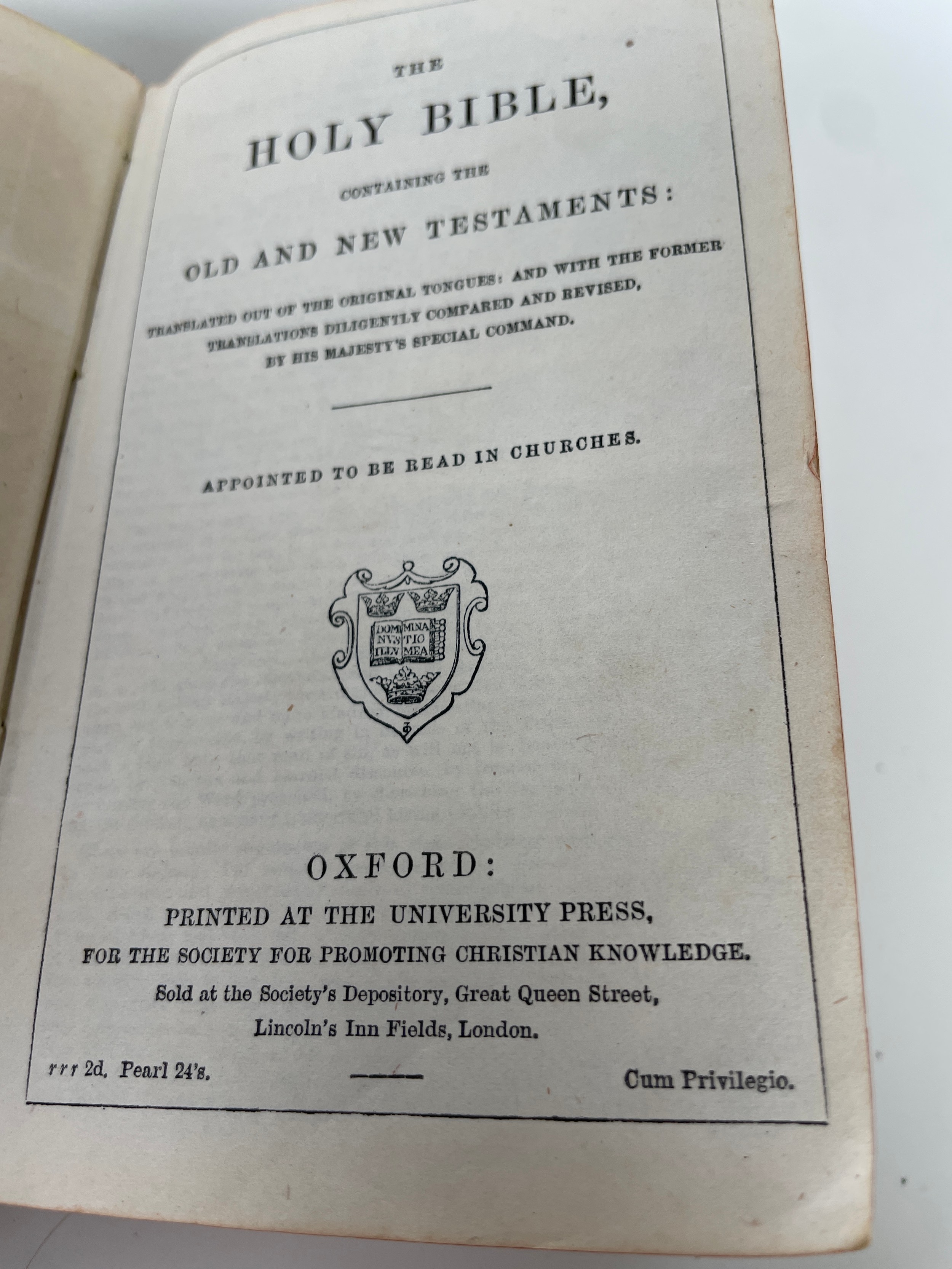 Oxford University Press leather bound copy of The Holy Bible. Intact. Clasp missing. Pearl 24’s 13.5 x 8.5 cms