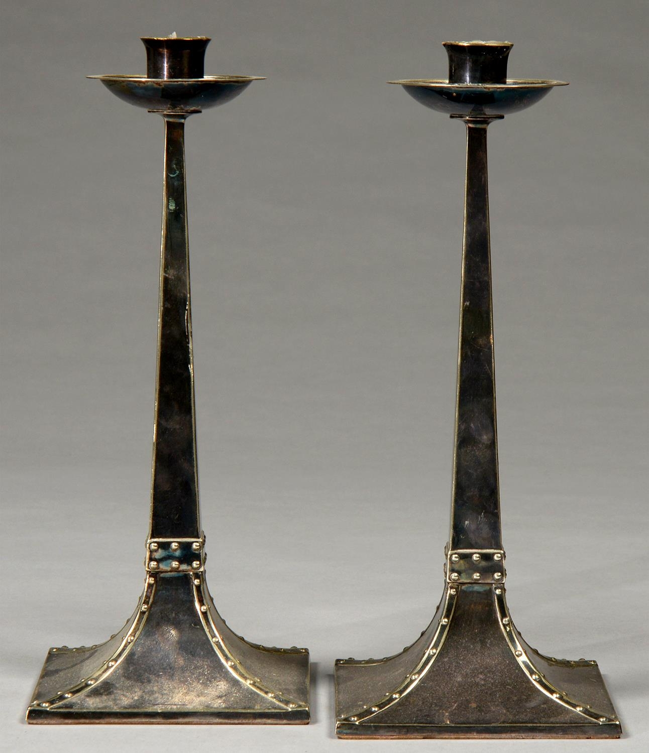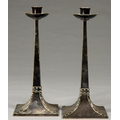 A PAIR OF ARTS AND CRAFTS EPNS CANDLESTICKS, C.1900, ON FLARED SQUARE BASE, 31CM H