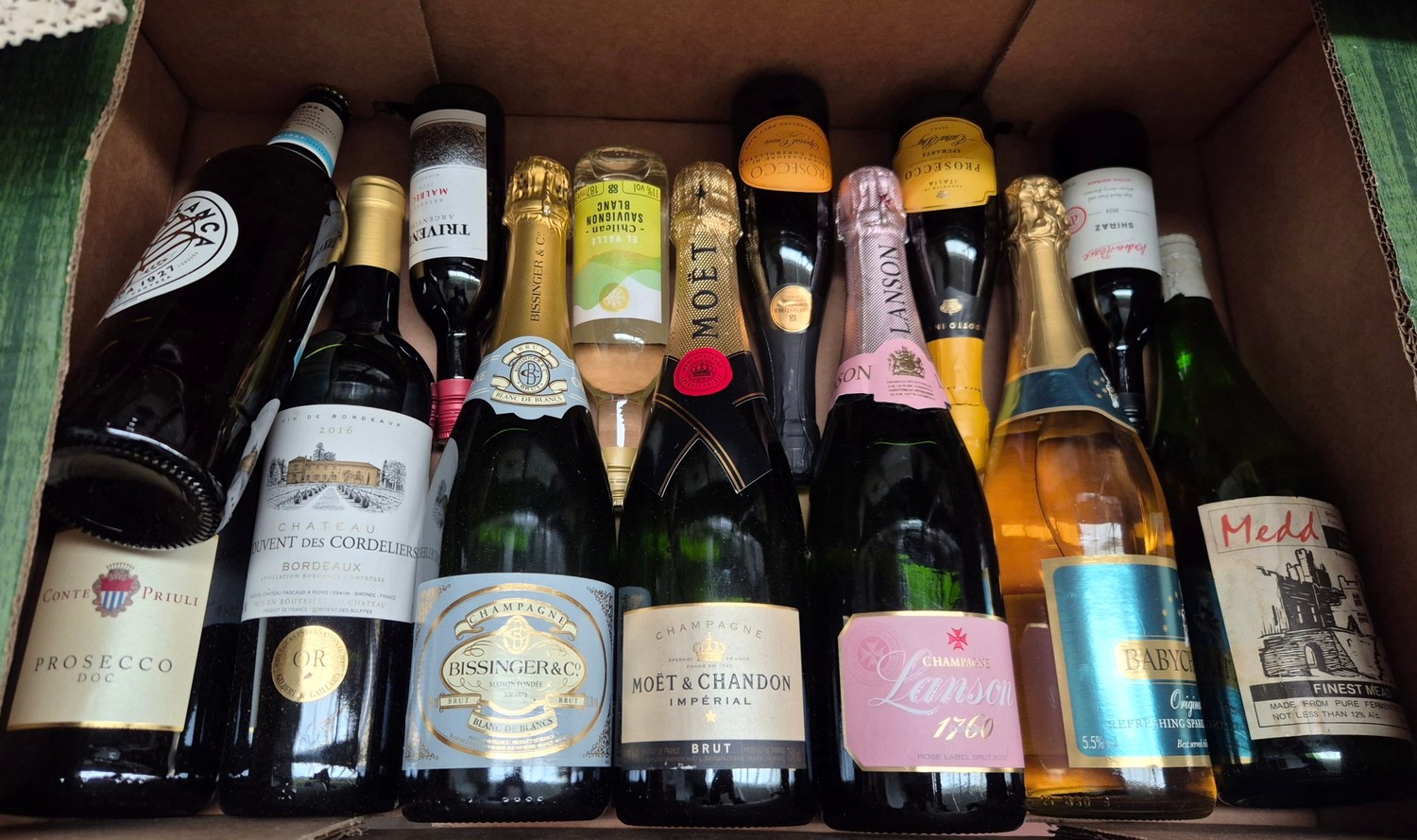 A box of assorted alcoholic beverages to include champagne etc. Appx 13 bottles