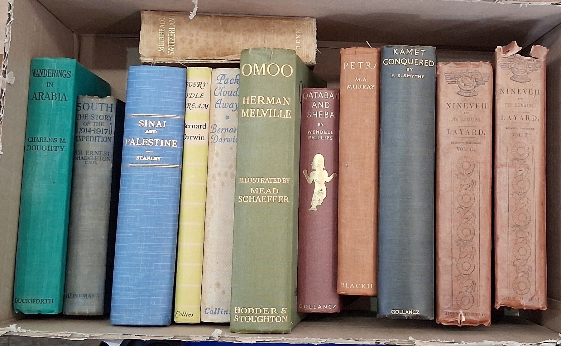 Travel mainly in the Far East - to include Roberts, David "The Holy Land", published by Studio Editions, London (1982), facsimile edition, folio, maroon boards, gilt titles, d-w, Layard, Austen Henry "Nineveh and Its Remains", John Murray 1849, 2 vols, sixth thousand, folding plans, maps, sepia frontis and plates, backstrips faded and with loss, both books are cocked, Stanley, Arthur Penryhn "Sinai and Palestine", John Murray 1862, twelfth thousand with maps and plans, rebound, "Muirhead's Switzerland", Melville, Herman "Omoo", Hodder & Stoughton, colour plates, pictorial cloth, Murray, M A "Petra", Blackie & Son 1939, photographic illustrations, inked inscription dated 1942 on ffep, rust-coloured cloth, spine slightly pulled at the head, Huxley, Julian "From an Antique Land", Max Parrish 1966, d-w, Powell, Dilys "An Affair of the Heart", Hodder & Stoughton 1957, cartographic ep, orange cloth, d-w not price clipped, Cottrell, Leonard "The Lion Gate, a Journey in Search of the Mycenaeans", Evans Brothers Limited 1963, photographic illustrations, d-w not price clipped, Macaulay, Rose "Pleasure of Ruins", Weidenfeld & Nicholson 1953, photographic illustrations, edges foxed, d-w price clipped, and many other related titles, please see images (2 boxes)