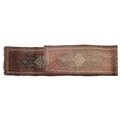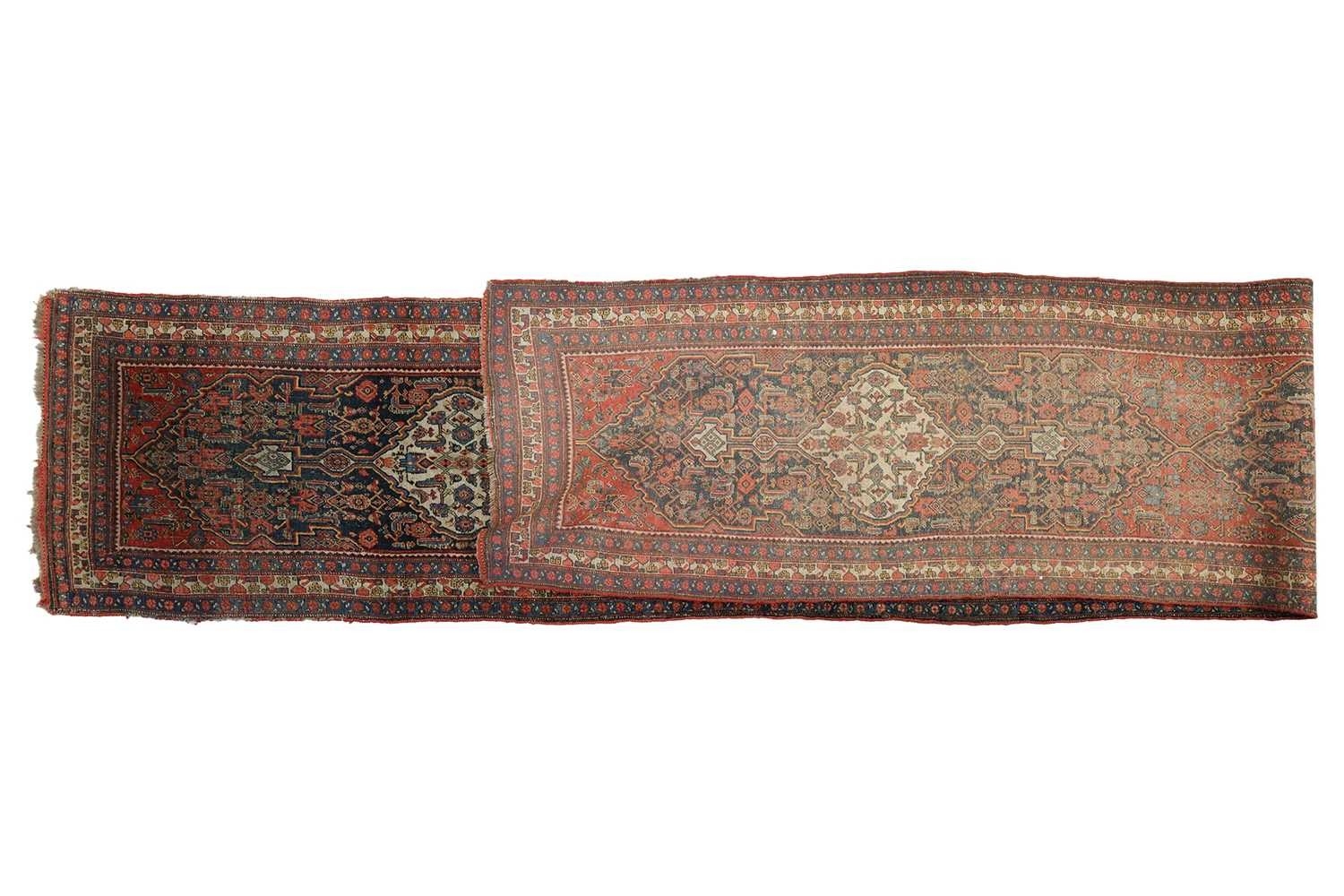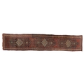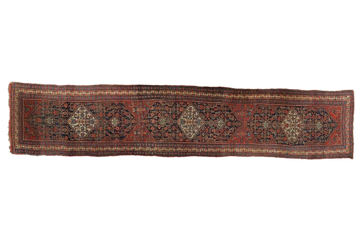 A North West Persian long runner, early 20th century, with three dark blue panels containing white pole medallions, on a Herati field, red spandrels and blue and white guard bands, 94 x 668 cm. End strips worn with some losses. Selvedges worn. Otherwise worn evenly comensurate with age.