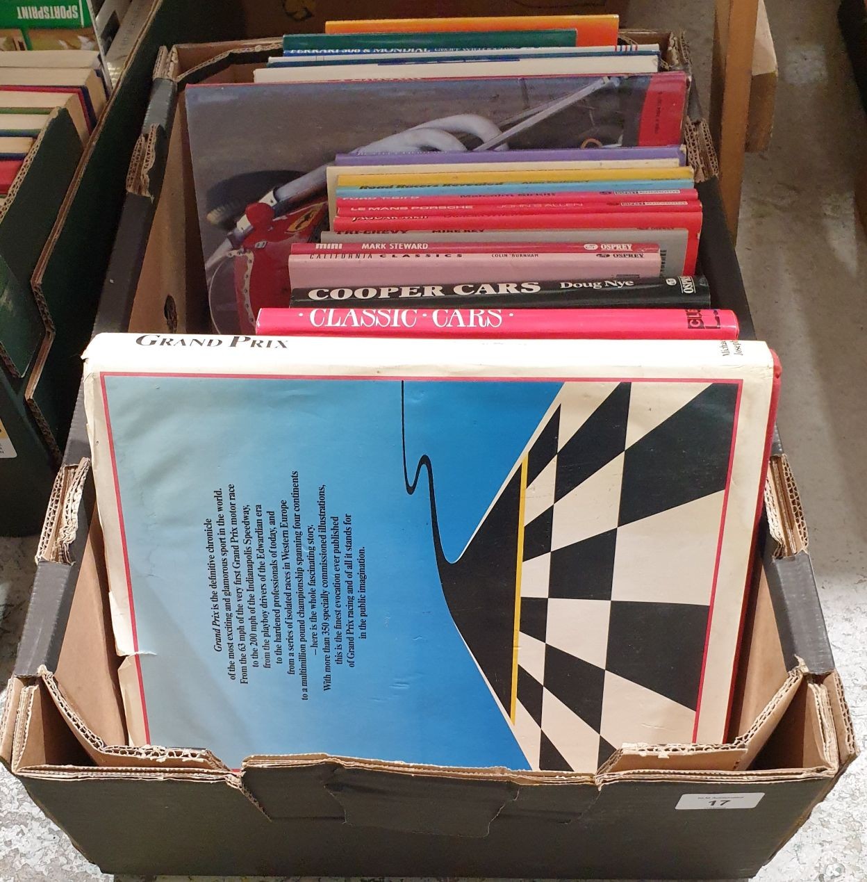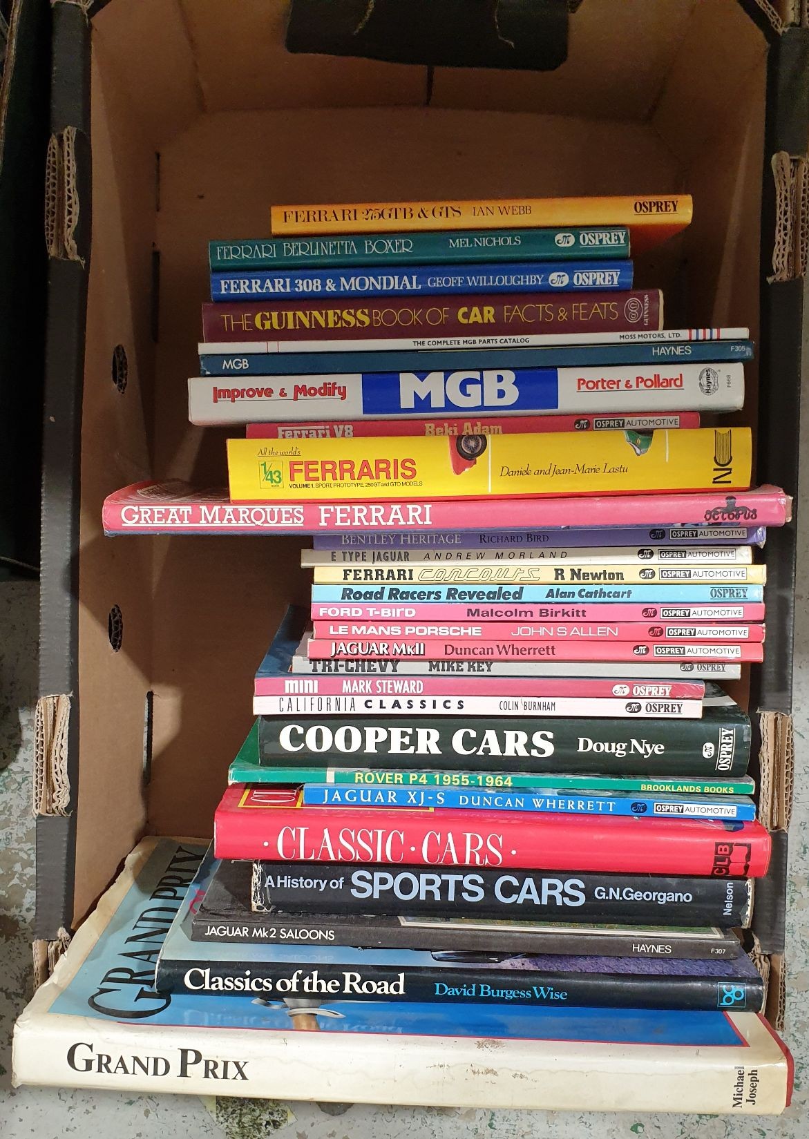 A box of car books including Ferrari. No in-house shipping. Please arrange collection or your own packer and shipper.