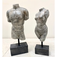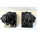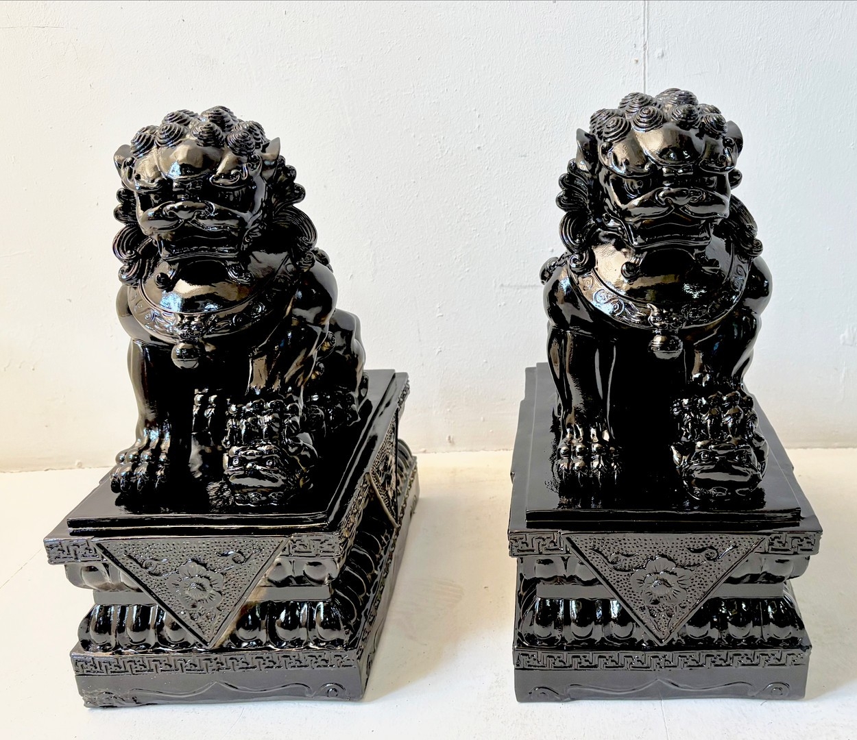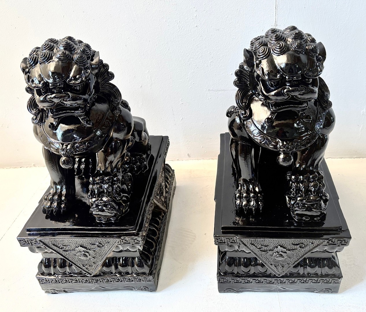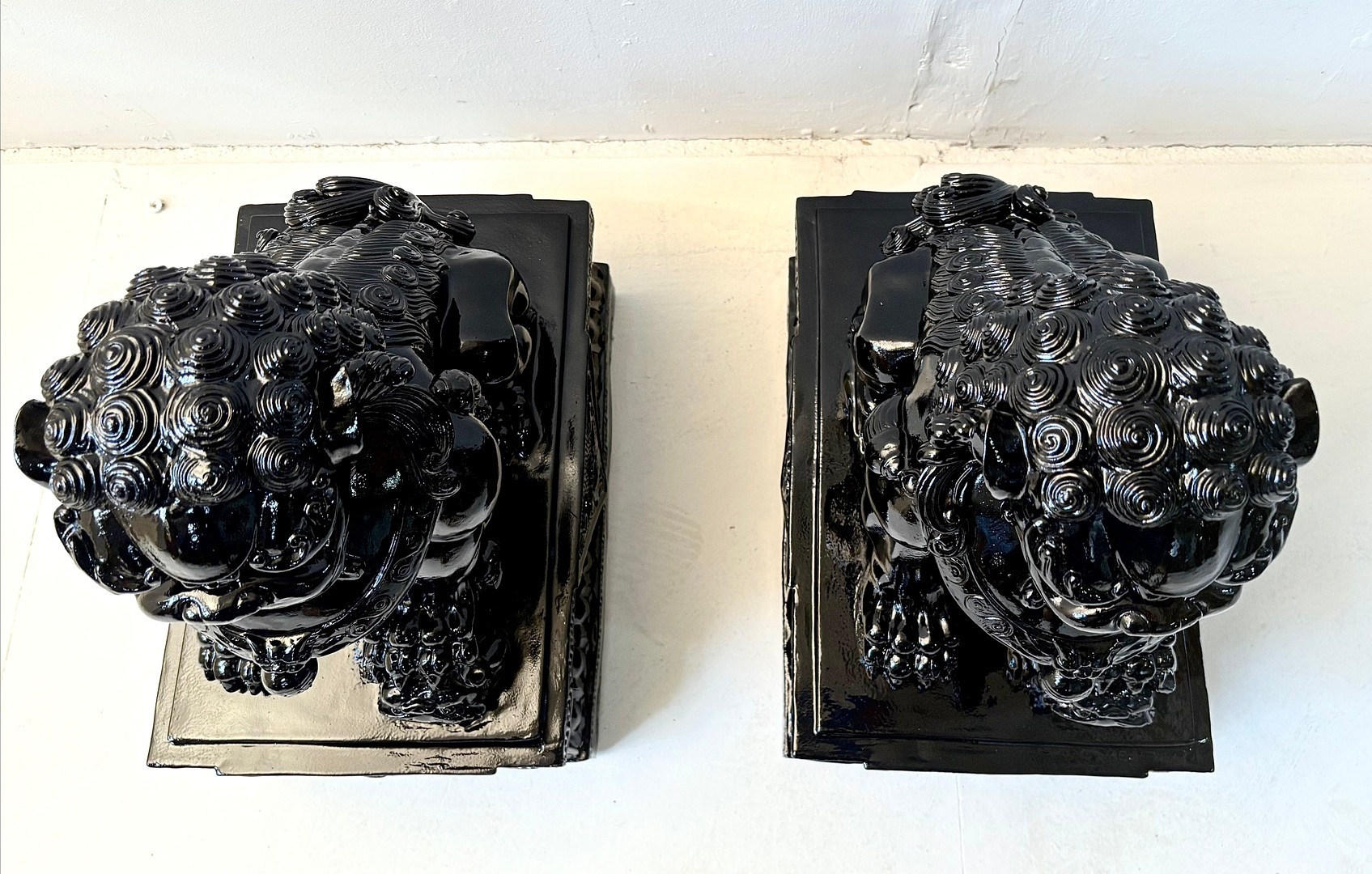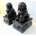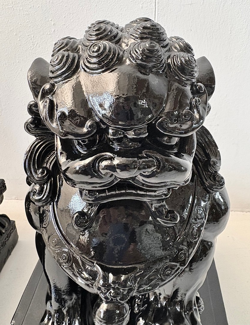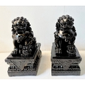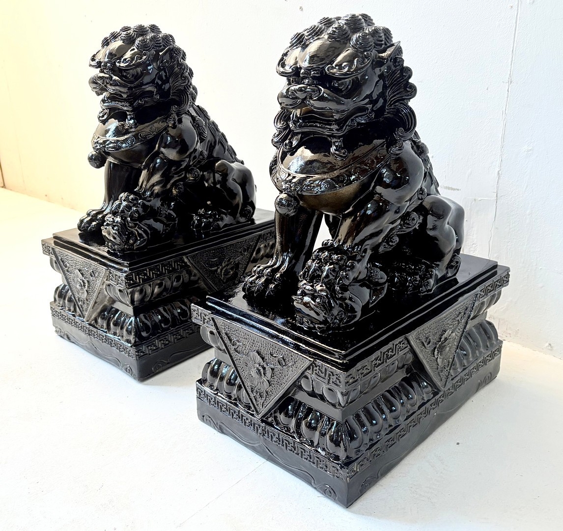PAIR OF DOGS OF FOO. in black gloss finish, 49cm H x 40cm W x 20cm D.
