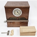 Early 20th century oak-cased clocking in machine by West Midland Time Recorders Limited, the white face with arabic numerals, 34cm high x 38cm wide together with winding key and a quantity of clocking in cards