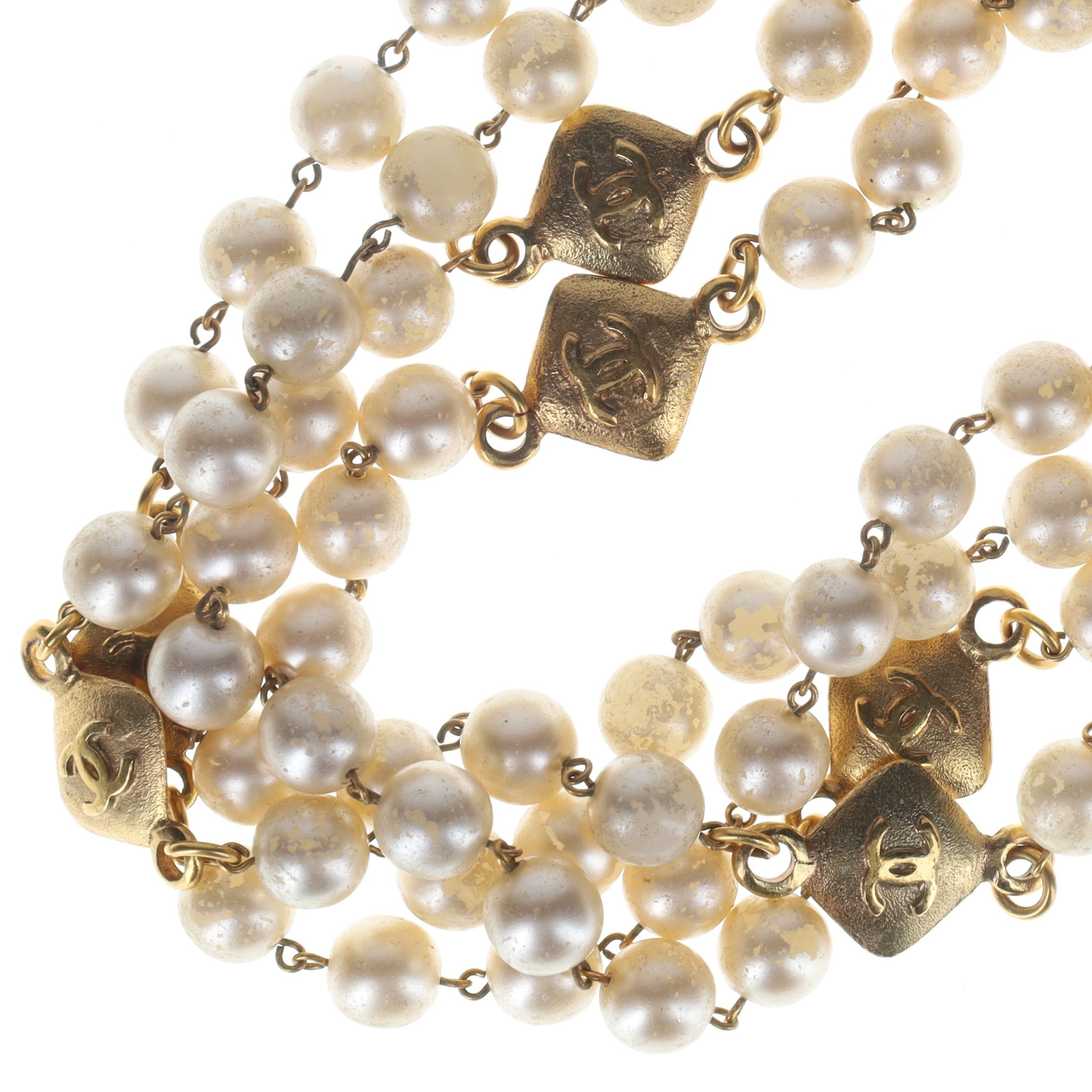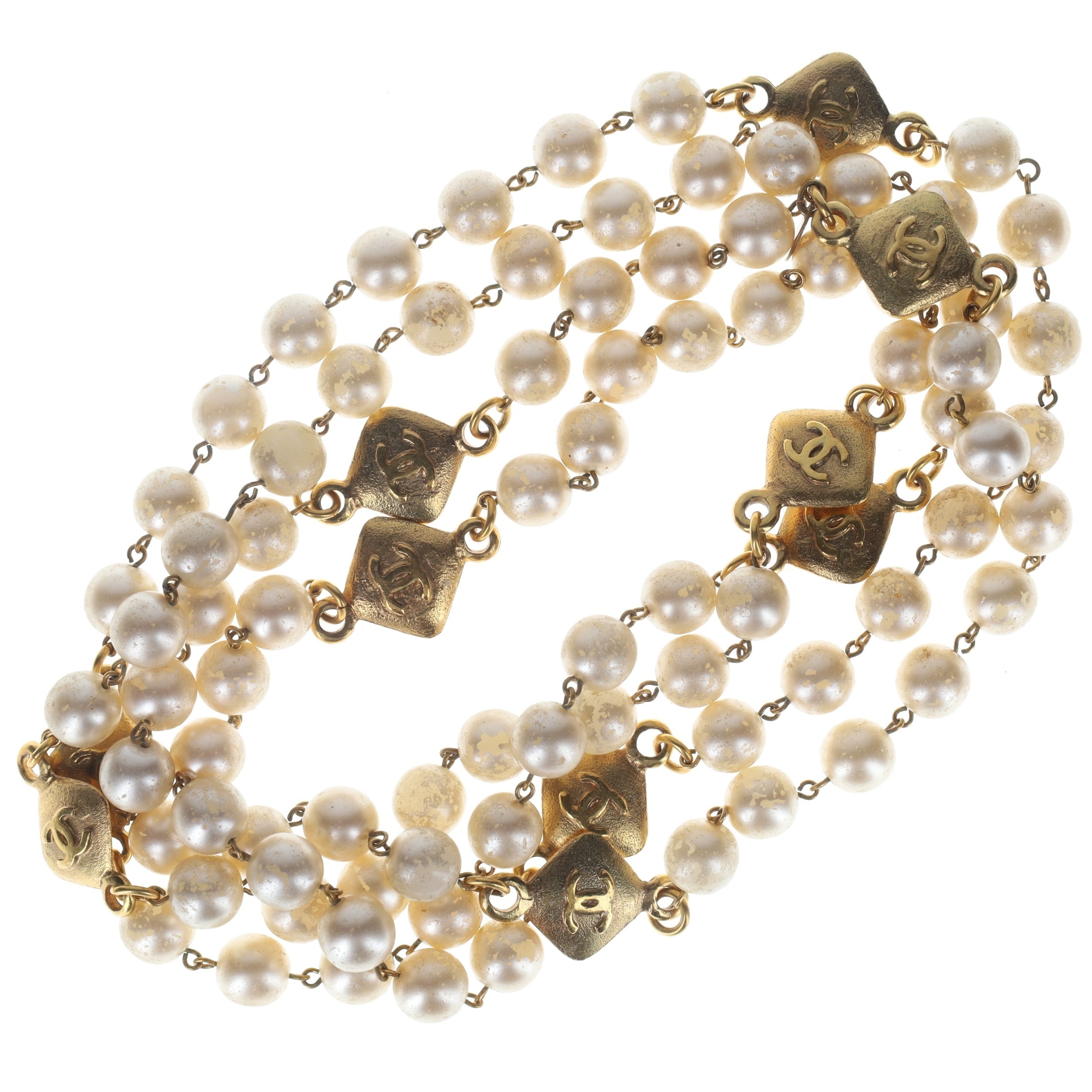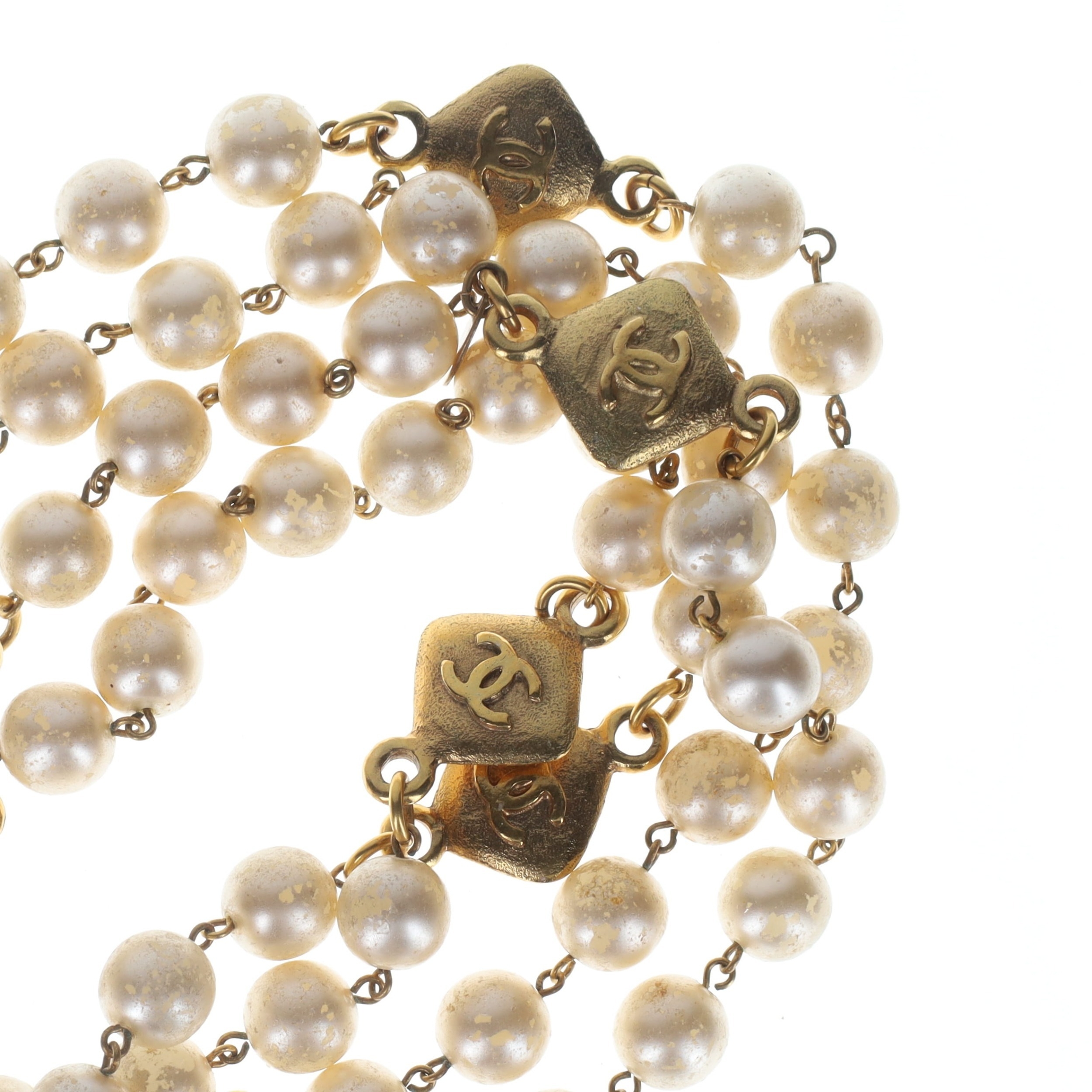 Vintage Chanel Simulated Pearl Opera Length Necklace. Measures approx. 176cm. Some areas of plate wear, there is some peeling to the pearl coating. Weighs in total 257g.