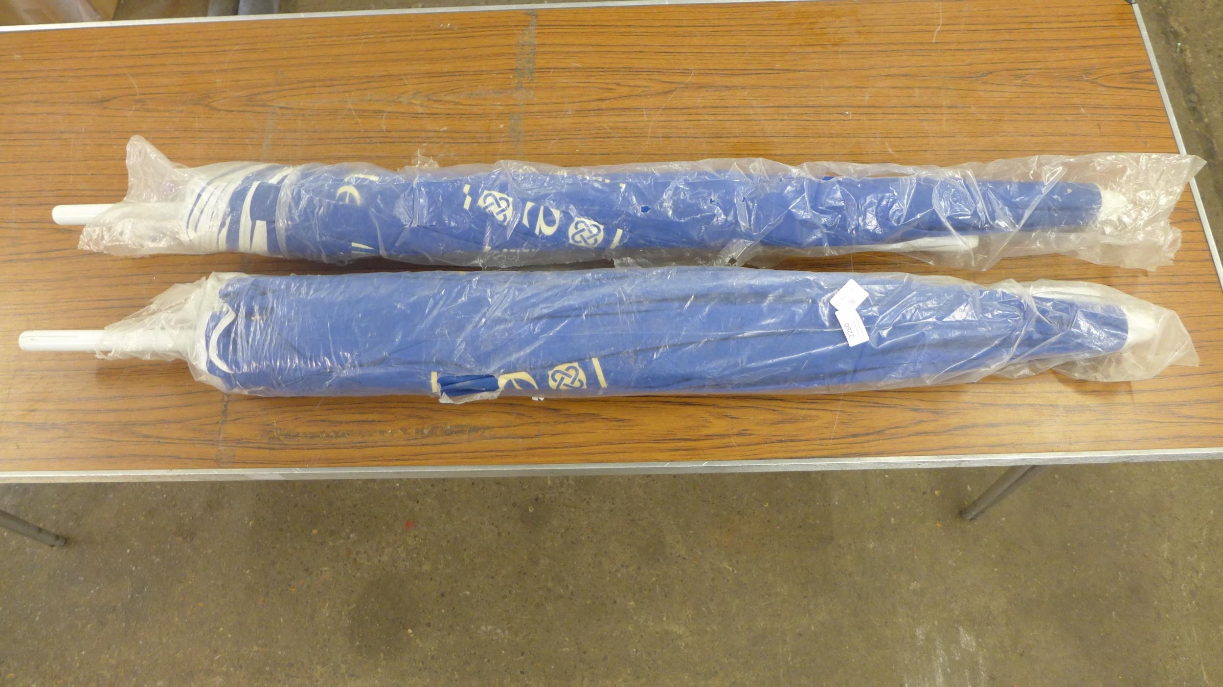 Two blue parasols