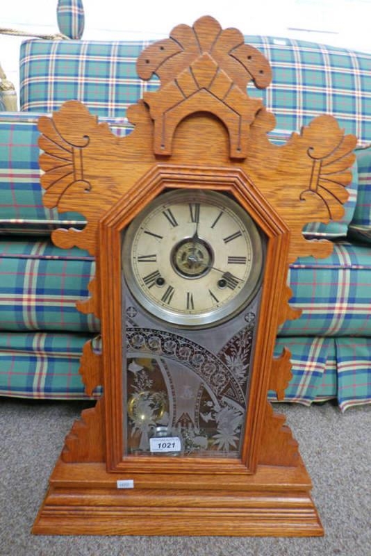 LATE 19TH CENTURY OAK AMERICAN GINGERBREAD CLOCK WITH ALARM FITTING