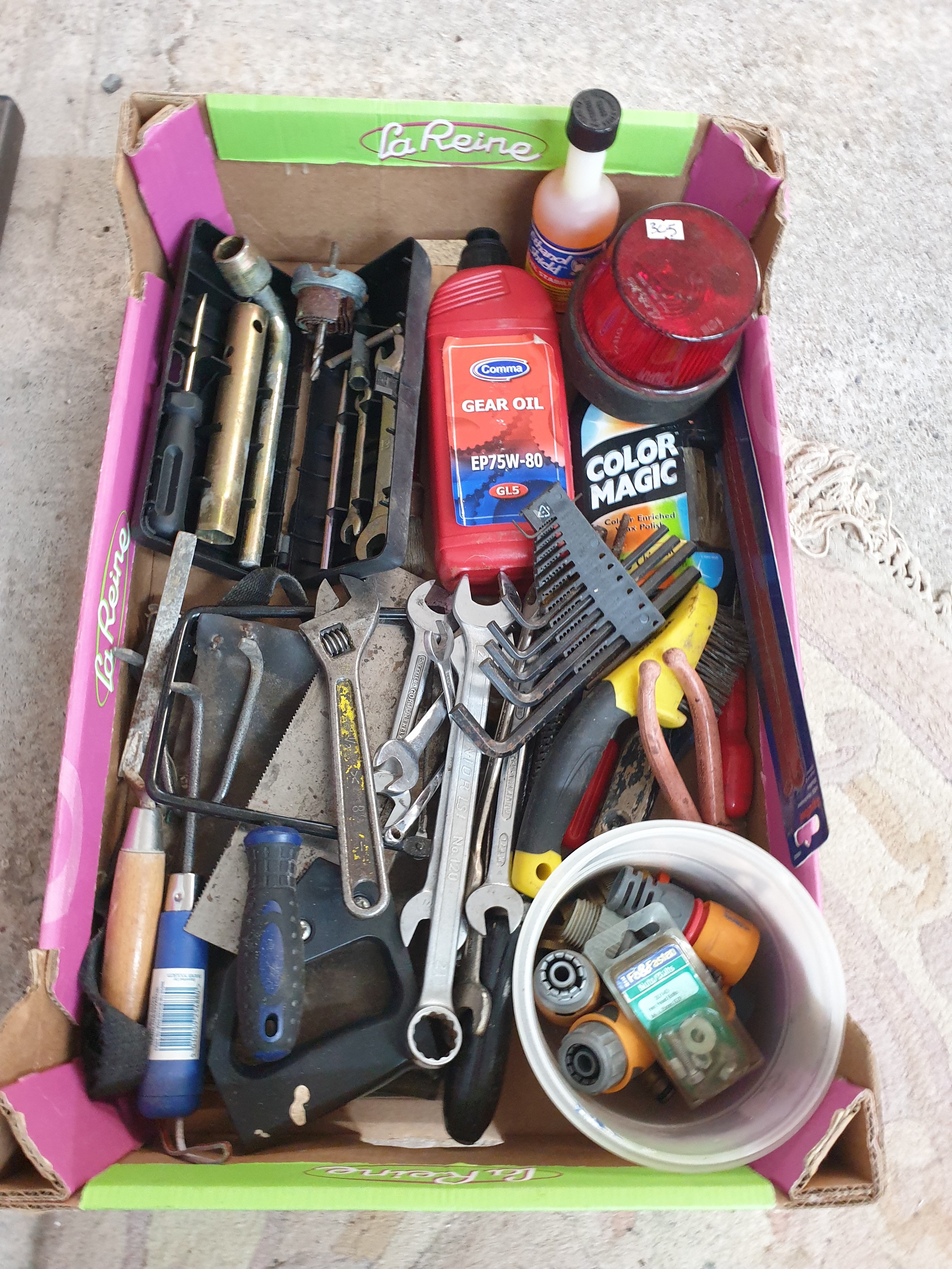 Large Box Tools Spanners, Wrench, Saws, Allan Keys, Gear Oil, Black Car Polish, Tool Kit Etc