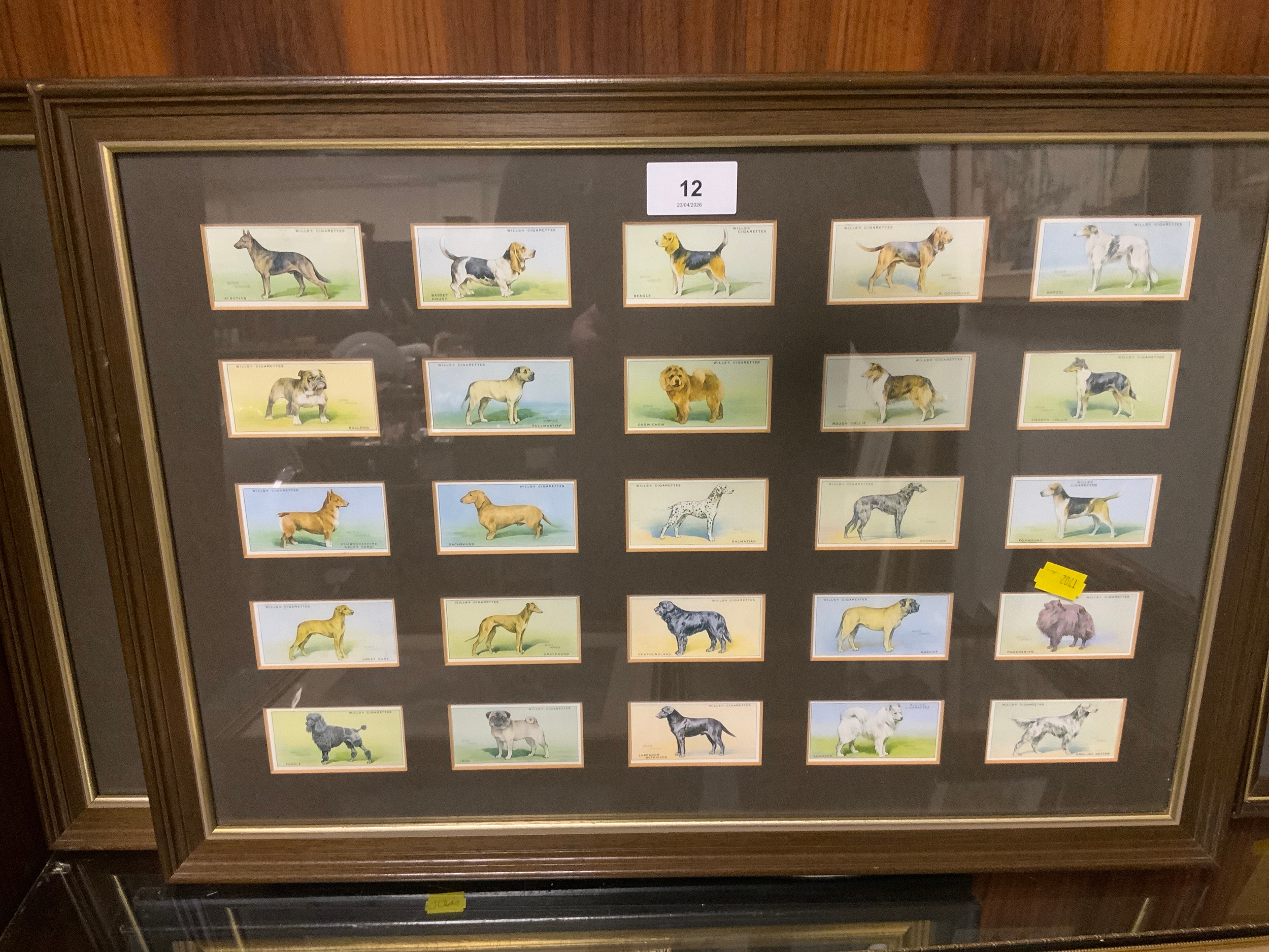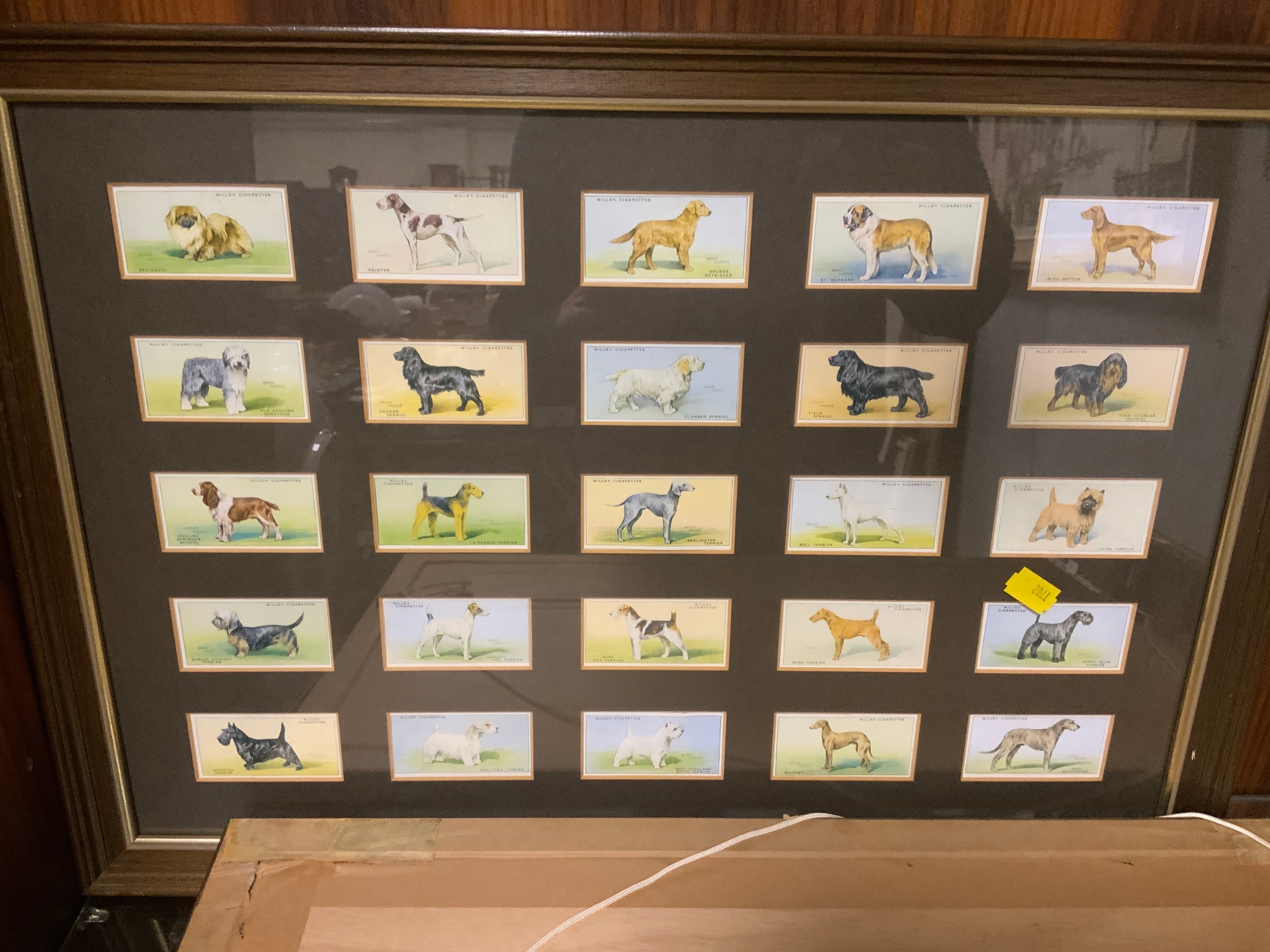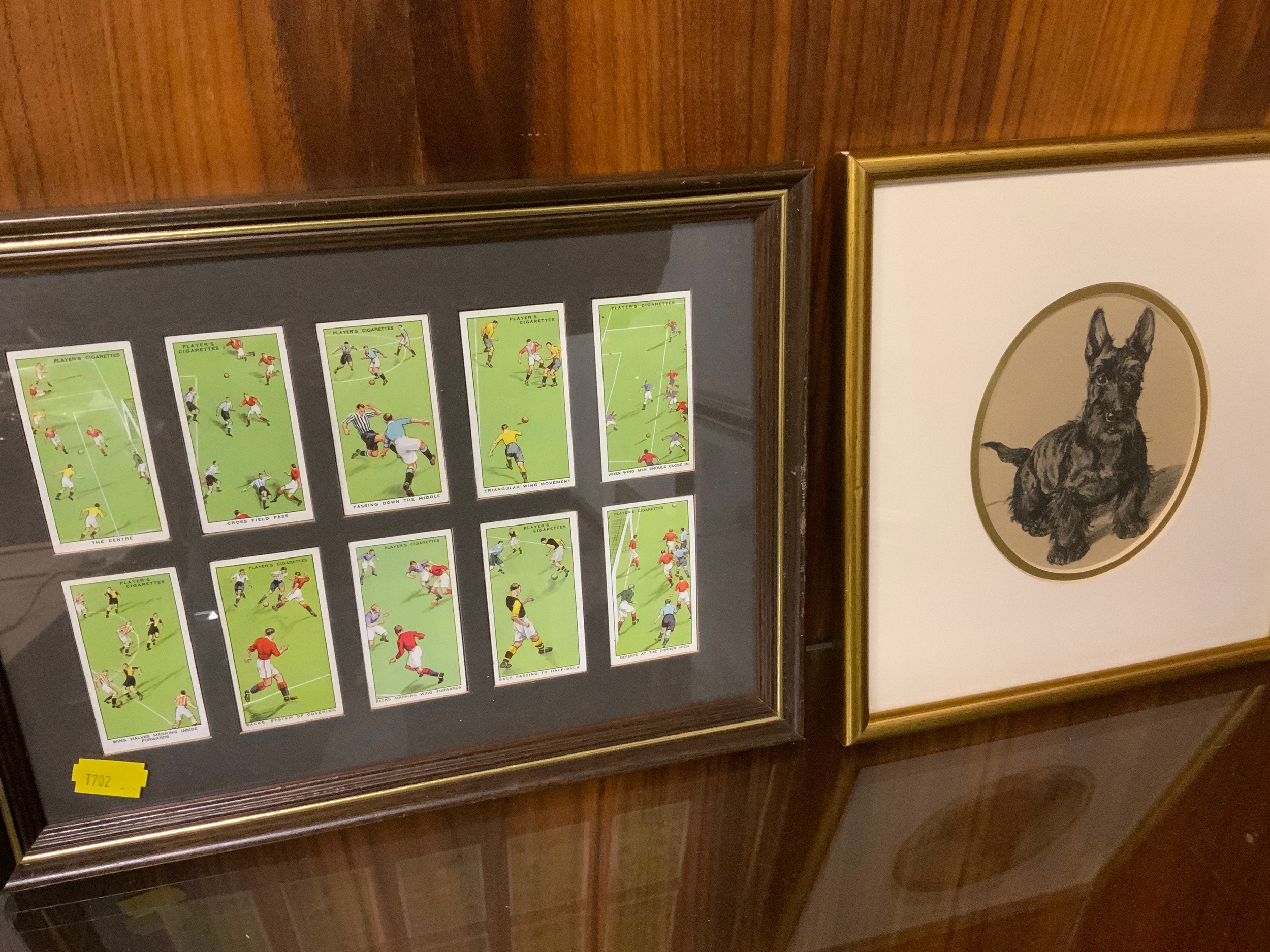 Three sets of framed cigarette cards depicting dogs and footballers and a small Terrier print. (4)