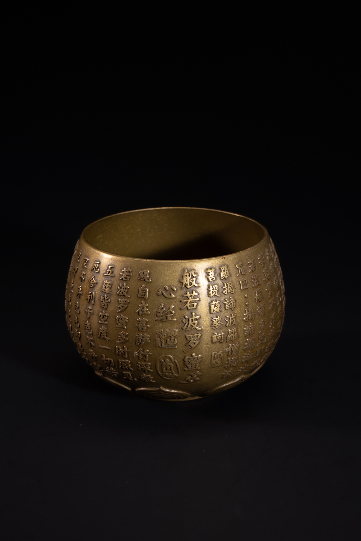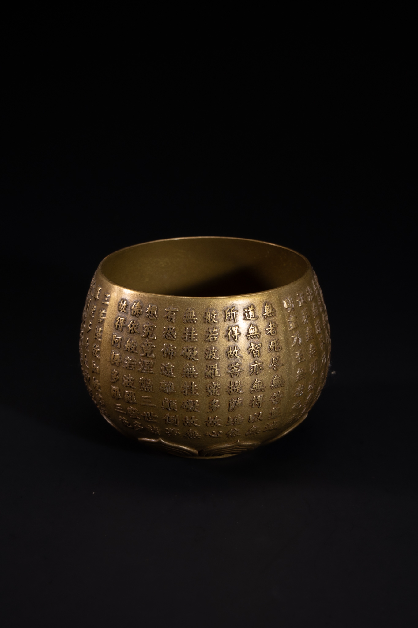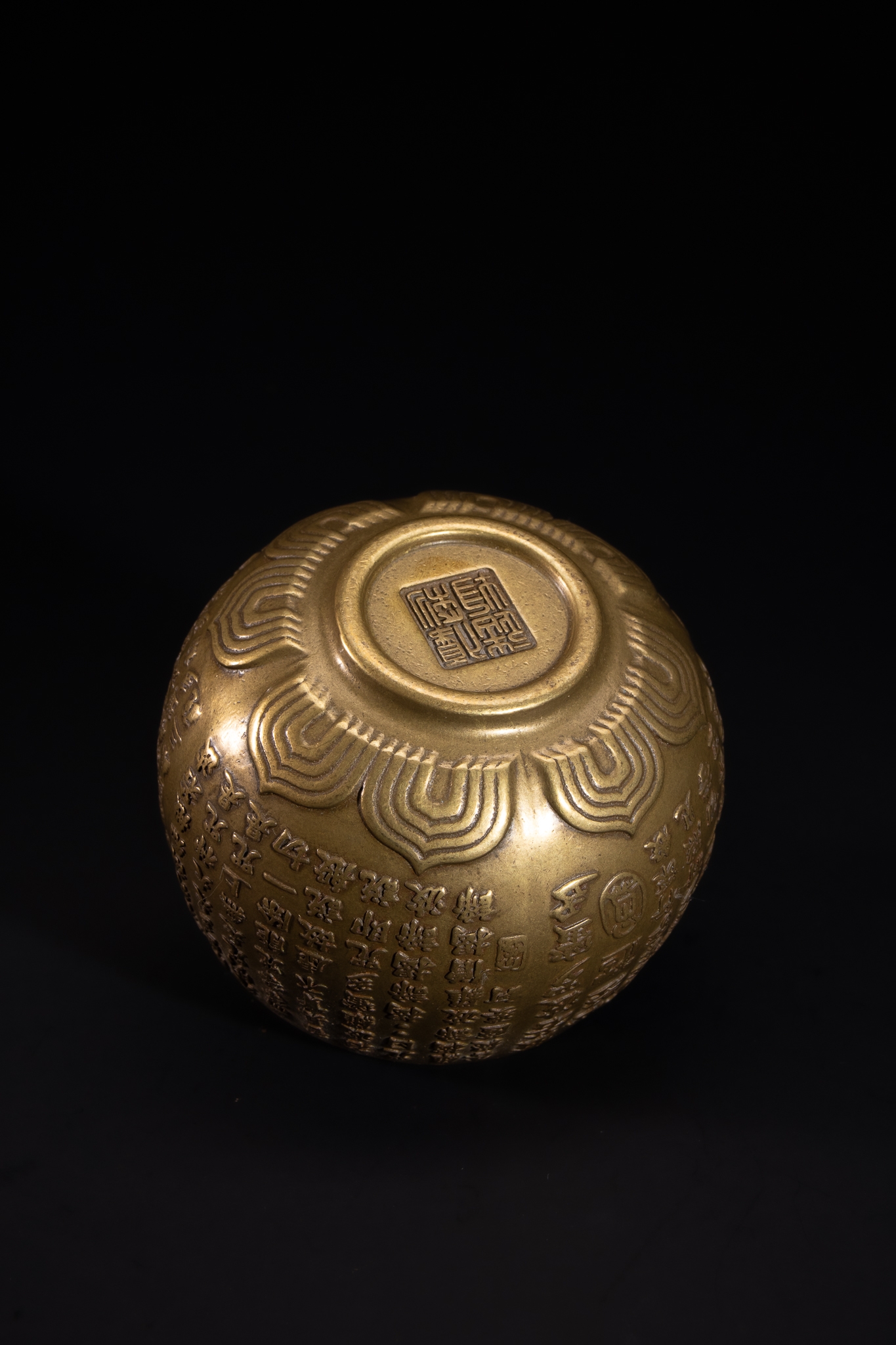 A Chinese brass bowl of rounded form, the exterior densely decorated with neatly incised vertical rows of Chinese calligraphic inscriptions arranged in registers around the body. The surface has a warm golden-brass tone with a smooth interior contrasting the richly worked exterior. The bowl rests on a gently rounded base, the underside featuring further engraved decoration and a central square seal mark surrounded by stylised linear motifs.