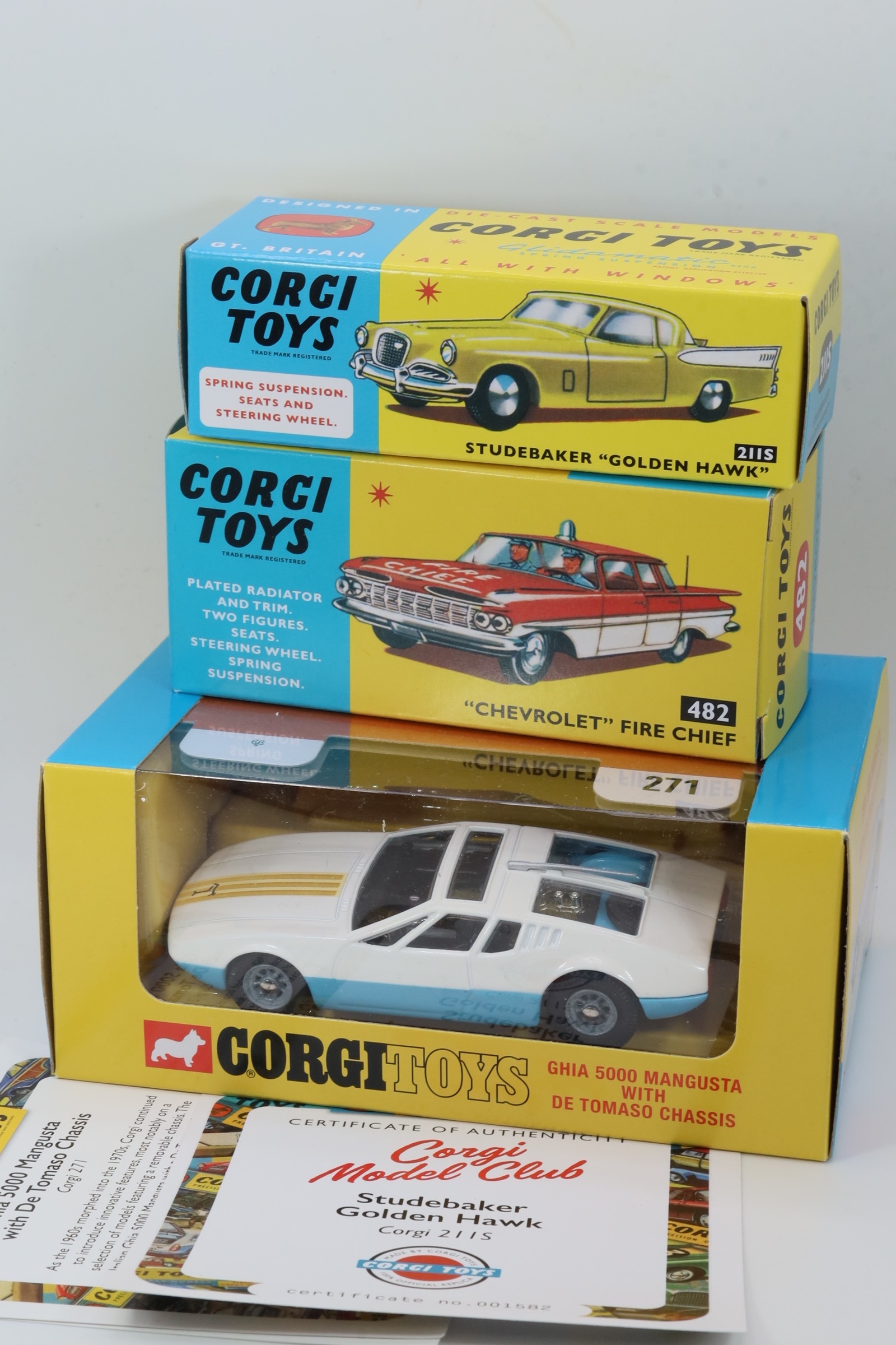 3 Corgi Model Club boxed diecast vehicles to include 271 Ghia 5000 Mangusta; 211S Studebaker Golden Hawk and 482 Chevrolet Fire Chief all with certificates