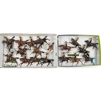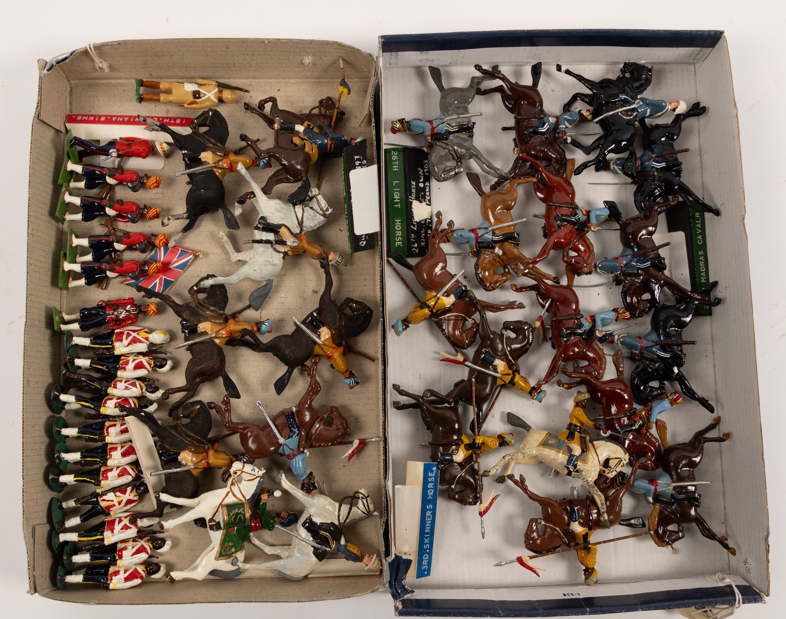 Britains etc Soldiers. Indian Regiments 3rd Skinners Horse (5), 28th Madras Cavalry (5), 26th Light Horse (6), colour variations. Lumsdens Guides (5), all mounted. Plus West Indian Regiment on foot (11). Plus another examples including an Indian Regiment on foot with Union Flag and Officer (6). VGC, Many look to be professionally restored examples. (43). £60-80